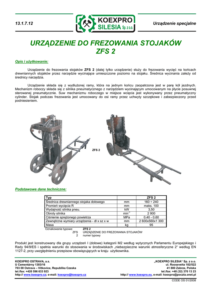 13.1.7.12 Urządzenie specjalne URZĄDZENIE DO FREZOWANIA STOJAKÓW ZFS 2 Opis i użytkowanie: Urządzenie do frezowania stojaków ZFS 2 (dalej tylko urządzenie) służy do frezowania wycięć na końcach drewniannych stojaków przez narzędzie wycinające umieszczone poziomo na stojaku. Średnica wycinania zależy od średnicy narzędzia. Urządzenie składa się z wydłużonej ramy, która na jednym końcu zaopatrzona jest w parę kół jezdnych. Mechanizm roboczy składa się z silnika pneumatycznego z narzędziem wycinającym umocowanym na płycie posuwnej sterowanej pneumatycznie. Suw mechanizmu roboczego w miejsce wcięcia jest wykonywany przez pneumatyczny cylinder. Stojak podczas frezowania jest umocowany do osi ramy przez uchwyty szczękowe i zabezpieczony przed podniesieniem. ZFS 2 Podstawowe dane techniczne: Typ Średnica drewniannego stojaka dołowego Promień wycięcia R Wydajność silnika pneu. Obroty silnika Ciśnienie sprężonego powietrza Zewnętrzne wymiary urządzenia - dł x sz x w Masa Oznakowanie typowe: ZFS 2 mm mm kW min-1 MPa mm kg ZFS 2 160 ÷ 240 maks. 100 3,50 2 900 0,40 - 0,60 2 600x560x1 300 95 ZFS 2 URZĄDZENIE DO FREZOWANIA STOJAKÓW numer typowy Produkt jest konstruowany dla grupy urządzeń I (dołowe) kategorii M2 według wytycznych Parlamentu Europejskiego i Rady 94/9/ES i spełnia warunki do stosowania w środowiskach „niebezpieczne warunki atmosferyczne 2“ według EN 1127-2, przy uwzględnieniu przepisow obowiązujących w kraju użytkownika. KOEXPRO OSTRAVA, a.s. U Cementárny 1303/16 703 00 Ostrava – Vítkovice, Republika Czeska tel./fax: +420 596 633 923 http:// www.koexpro.cz; e-mail: [email protected] „KOEXPRO SILESIA“ Sp. z o.o. ul. Roosevelta 102/522 41 800 Zabrze, Polska tel./fax: +48 (32) 370 13 23 http:// www.koexpro.eu, e-mail: [email protected] CODE OS 01/2008