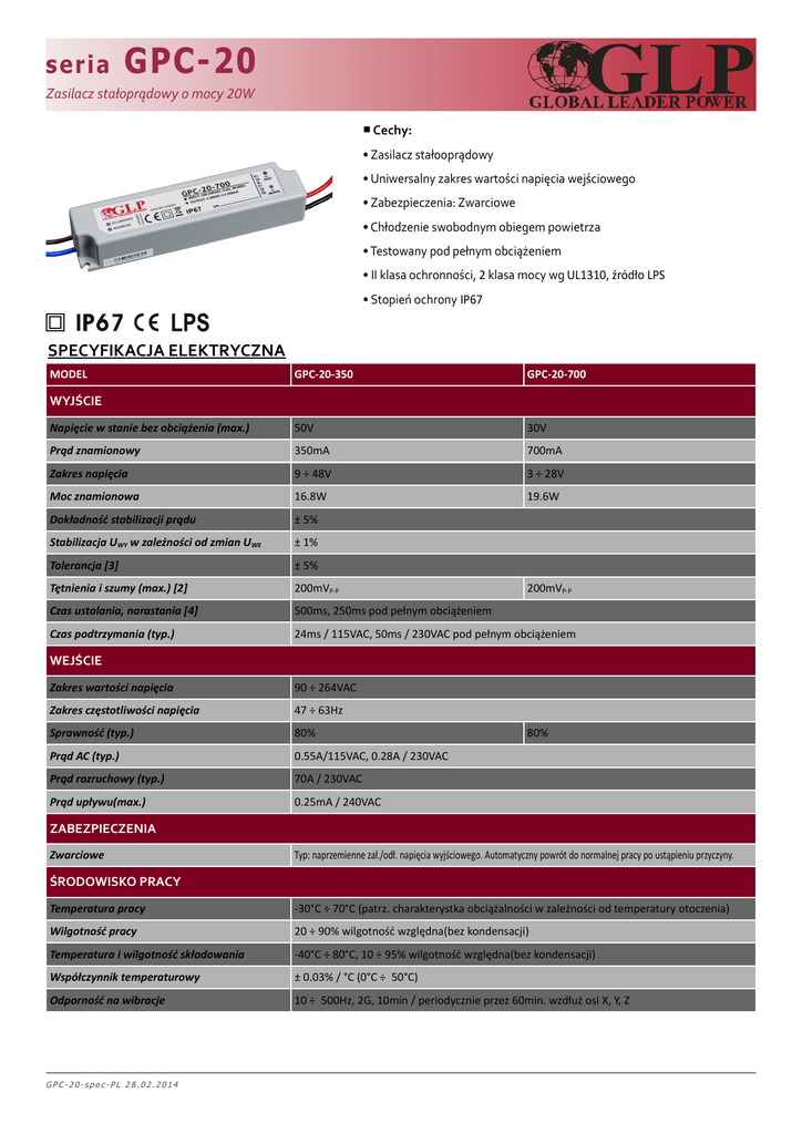 seria GPC-20 Zasilacz stałoprądowy o mocy 20W ■ Cechy: • Zasilacz stałooprądowy • Uniwersalny zakres wartości napięcia wejściowego • Zabezpieczenia: Zwarciowe • Chłodzenie swobodnym obiegem powietrza • Testowany pod pełnym obciążeniem • II klasa ochronności, 2 klasa mocy wg UL1310, źródło LPS • Stopień ochrony IP67 SPECYFIKACJA ELEKTRYCZNA MODEL GPC-20-350 GPC-20-700 Napięcie w stanie bez obciążenia (max.) 50V 30V Prąd znamionowy 350mA 700mA Zakres napięcia 9 ÷ 48V 3 ÷ 28V Moc znamionowa 16.8W 19.6W Dokładność stabilizacji prądu ± 5% Stabilizacja UWY w zależności od zmian UWE ± 1% Tolerancja [3] ± 5% Tętnienia i szumy (max.) [2] 200mVP-P Czas ustalania, narastania [4] 500ms, 250ms pod pełnym obciążeniem Czas podtrzymania (typ.) 24ms / 115VAC, 50ms / 230VAC pod pełnym obciążeniem WYJŚCIE 200mVP-P WEJŚCIE Zakres wartości napięcia 90 ÷ 264VAC Zakres częstotliwości napięcia 47 ÷ 63Hz Sprawność (typ.) 80% Prąd AC (typ.) 0.55A/115VAC, 0.28A / 230VAC Prąd rozruchowy (typ.) 70A / 230VAC Prąd upływu(max.) 0.25mA / 240VAC 80% ZABEZPIECZENIA Zwarciowe Typ: naprzemienne zał./odł. napięcia wyjściowego. Automatyczny powrót do normalnej pracy po ustąpieniu przyczyny. ŚRODOWISKO PRACY Temperatura pracy -30°C ÷ 70°C (patrz. charakterystka obciążalności w zależności od temperatury otoczenia) Wilgotność pracy 20 ÷ 90% wilgotność względna(bez kondensacji) Temperatura i wilgotność składowania -40°C ÷ 80°C, 10 ÷ 95% wilgotność względna(bez kondensacji) Współczynnik temperaturowy ± 0.03% / °C (0°C ÷ 50°C) Odporność na wibracje 10 ÷ 500Hz, 2G, 10min / periodycznie przez 60min. wzdłuż osi X, Y, Z GPC-20-spec-PL 28.02.2014 seria GPC-20 Zasilacz stałoprądowy o mocy 20W NORMY BEZPIECZEŃSTWA I KOMPATYBILNOŚCI ELEKTROMAGNETYCZNEJ Normy bezpieczeństwa Zgodność z EN61347-1, EN61347-2-13, IP67 Wytrzymałość izolacji WE/WY: 3kVAC Rezystancja izolacji WE/WY: 100MΩ/500VDC/25°C/70% Normy emisji EMC Zgodność z EN55015 Normy odporności EMC Zgodność EN61547; EN61000-4-2, -3, -4, -5, -6, -8, -11 Prąd harmonicznych Zgodność z EN61000-3-3; EN61000-3-2 POZOSTAŁE Wymiary 140 x 32 x 25mm (dł. x szer. x wys.) Masa i opakowanie 0.2kg; 100szt./karton; masa i wymiary kartonu: 20kg; 34.5 x 29 x 19.5cm 1. Podane parametry(jeśli nie zaznaczono inaczej) zmierzono dla napięcia zasilania 230VAC, obciążenia znamionowego w temperaturze otoczenia 25°C. 2. Tętnienia i szumy zmierzono dla pasma 20MHz używając skręconych przewodów pomiarowych oraz kondensatorów 0.1μF i 47μF połączonych ze sobą równolegle. 3. Tolerancja wyraża maksymalną rozbieżność napięcia wyjściowego uwzględniając zmiany przy załączaniu, w zależności od zmian napięcia wejściowego oraz w zależności od zmian prądu obciążenia. 4. Czas ustalania i narastania mierzony jest w zakresie 0 ÷ 90% znamionowego napięcia wyjściowego. 5. Zasilacz spełnia normy bezpieczeństwa oraz kompatybilności elektromagnetycznej. W przypadku instalacji zasilacza w finalnym urządzeniu jako podzespół, należy ponownie wykonać badania celem weryfikacji spełnienia norm dla całego układu. SPECYFIKACJA MECHANICZNA WEJŚCIE WYJŚCIE 140 2 UL 1015 18AWG (0.82mm ) dł. = 250mm ± 50mm UL 1015 18AWG (0.82mm2) dł. = 250mm ± 50mm AC/ L(brązowy) V+ (czerwony) AC/ N(niebieski) V- (czarny) 3.5 CHARAKTERYSTYKA OBCIĄŻALNOŚCI W ZALEŻNOŚCI OD TEMPERATURY OTOCZENIA 100 90 80 70 60 50 40 30 20 -30 0 10 20 30 40 50 Praca w pozycji TEMERATURA OTOCZENIA [°C] poziomej GPC-20-spec-PL 28.02.2014 60 70