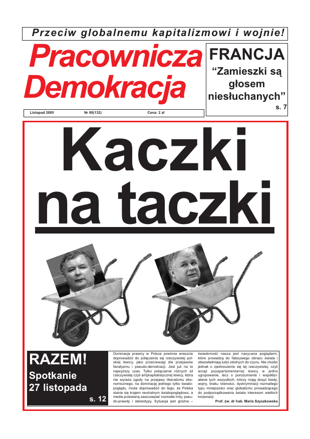 Pracownicza FRANCJA Demokracja Przeciw globalnemu kapitalizmowi i wojnie! “Zamieszki są głosem niesłuchanych” Kaczki na taczki Listopad 2005 Nr 80(132) RAZEM! Spotkanie 27 listopada s. 12 Cena: 2 zł Dominacja prawicy w Polsce powinna wreszcie doprowadzić do połączenia się rzeczywistej polskiej lewicy, jako przeciwwagi dla przejawów fanatyzmu i pseudo-demokracji. Jest już na to najwyższy czas. Tylko połączenie różnych sił rzeczywistej czyli antykapitalistycznej lewicy, która nie wyraża zgody na przejawy liberalizmu ekonomicznego, na dominację jednego tylko światopoglądu, może doprowadzić do tego, że Polska stanie się krajem neutralnym światopoglądowo, a media przestaną zaszczepiać rozmaite mity, pseudo-prawdy i stereotypy. Sytuacja jest groźna – s. 7 świadomość nasza jest nasycana poglądami, które prowadzą do fałszywego obrazu świata i obezwładniają ludzi zdolnych do czynu. Nie chodzi jednak o zjednoczenie się tej rzeczywistej, czyli wciąż pozaparlamentarnej lewicy w jedno ugrupowanie, lecz o porozumienie i współdziałanie tych wszystkich, którzy mają dosyć biedy, wojny, braku równości, dyskryminacji rozmaitego typu mniejszości oraz globalizmu prowadzącego do podporządkowania świata interesom wielkich korporacji. Prof. zw. dr hab. Maria Szyszkowska Kłopoty dla bojówek Giertycha KAMPANIA PRZECIWKO MŁODZIEŻY WSZECHPOLSKIEJ LPR i Młodzież Wszechpolska ersytetach – czyli mieli politykę podobprzeżywają kryzys po nieudanych ną do działaczy hitlerowskich. Kiedy Giertych mówi o „niepożąwyborach (LPR stracił 4 mandaty danych elementach” to nie wspomina, sejmowe). Zygmunt Wrzodak wystąpił z LPR i że wśród ludzi na zdjęciach z „Faktu” założył nową partię. Działacze LPR w są osoby specjalnie przez niego Łodzi wzywają Romana Giertycha do wybrane do reprezentowania LPR, m.in. 26-letni poseł LPR Bogusław natychmiastowego ustąpienia. Zachowanie MW pogłębia ten Sobczak. Jest tam również Maciej Twaróg, radny Krakowa, który w 2004 r. kryzys. Możemy z tego się cieszyć. Ostat- prowadził kontrdemonstrację (czyli nie zdjęcia w gazecie „Fakt” pokazu- raczej chuligańskie wybryki) przeciw jące członków MW w geście „Marszowi Tolerancji” w Krakowie, hitlerowskiego pozdrowienia to tylko kiedy w stronę legalnego marszu lecijeden z wielu skandali. Ruch anty- ały kamienie i butelki. Trzecia ciekawa faszystowski, w tym Koalicja przeciw postać biorąca udział w imprezie w Młodzieży Wszechpolskiej, przyczynił stylu „Sieg Heil” to mecenas Tomasz się do tego kryzysu, kiedy demon- Połetek, według Gazety Wyborczej strowaliśmy przeciw ich „Paradzie Nor- prawa ręka Romana Giertycha w kwesmalności” pod hasłem „MW – wylęgar- tiach prawnych z ciekawymi kontaktami nia faszyzmu”. Ale też sami Wszechpo- w różnych spółkach. Młodzież Wszechpolska od lacy pomogli potwierdzić to określenie wypowiadając się m.in. pozytywnie o początku próbowała działać dwu„sposobie Hitlera” na gejów. Przy czym torowo: poprzez uliczne bojówki i „norbyły Wszechpolak, europoseł Wierzejs- malne” działanie polityczne w parlaki, groził, że gdy dojdzie LPR do mencie. Ok. 12 z obecnych posłów władzy, organizacje osób homoseksu- LPR wywodzi się z bojówki, którą jest MW. alnych zostaną Te r a z zakazane. rozpaczliZdjęcia z wie chce hitlerowskimi zmienić pozdrowieniami wizerunek i nie były więc n a w e t zaskoczeniem. n a z w ę Reakcja liderów organizacji. LPR to najpierw Gazeta bagatelizowanie Wy b o r c z a („zamawiają piwo”), potem c y t u j e bronienie tego wiadomość z a c h o w a n i a 07.11.05 Bojówkarze faszyzującej MW w garniturach r o z s y ł a n ą („wiele przedwo- wybierają nowego wodza. przez Marjennych organiiusza Tomzacji narodowych stosowało takie czaka, sekretarza MW, do prominentpozdrowienia”), a na końcu zwalenie nych Wszechpolaków. "Ruch Narowiny na „elementy z patologicznych dowy musi dokonać kilku zmian, aby rodzin”, które nie rozumieją o co chodzi zwyciężyć. To historyczna chwila; w MW. zakładamy nową formację Lider LPR, Roman Giertych, młodzieżową. (...) 7 listopada zjazd wezwał władze MW do ukarania "osób, założycielski Ruchu Młodych. Nie które niegodnym zachowaniem dają wpuszczamy łysogłowych! Obowpowody do krytyki organizacji". W iązkowo garnitury. Powinno być wiele odpowiedzi szef MW Marcin Kubiński dziewcząt. Dzień zwycięstwa wkrótce zadeklarował, że tak się stanie. Ale nastanie!" - napisał. dodał: "Jesteśmy pod ciągłym atakiem Problemem nie są jednak ani ubrasił lewicowych, które czyhają na nasze nia ani fryzury członków MW, lecz jej potknięcia, niejednokrotnie je wyol- polityka – MW ma głębokie korzenie w brzymiając". antysemityzmie, przemocy, autoryTak naprawdę hitlerowskie taryzmie i jest blisko spokrewniona z pozdrowienia są logiczną częścią poli- faszyzmem. Żadna zmiana wizerunku tyki i tradycji MW sięgającej do lat czy nazwy tego faktu nie zmieni. przedwojennych. Przedwojenni Wszechpolacy organizowali bojówki, Skontaktuj się z Koalicją Przeciwko by bić Żydów, poparli getta ławkowe i Młodzieży Wszechpolskiej tzw. numerus clausus, by segregować [email protected] Żydów i ograniczyć ich liczbę na uniw- MARSZ RÓWNOŚCI W POZNANIU Sobota 19 listopada godz. 15.00 - wymarsz spod Starego Browaru Politycy PiS już zapowiadają, że zrobią wszystko, by Marsz Równości się nie odbył, więc... PRZYJDŹ! Demonstracja 6 października „Pieniądze dla głodnych, nie na wojnę” 06.10.05 Liczna grupa członków Polskiej Partii Pracy przyjechała z Katowic. Warszawscy tramwajarze również nosili flagi PPP. Kilkaset osób przemaszerowało w centrum Warszawy pod Pałac Prezydencki w proteście przeciw okupacji Iraku. Zorganizowana przez Inicjatywę ”Stop Wojnie” akcja pod hasłami: „Natychmiast wycofać wojska z Iraku” i „Pieniądze dla głodn