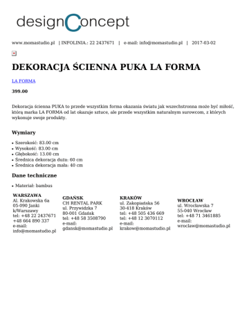 www.momastudio.pl | INFOLINIA.: 22 2437671 | e-mail: [email protected] | 2017-03-02 DEKORACJA ŚCIENNA PUKA LA FORMA LA FORMA 399.00 Dekoracja ścienna PUKA to przede wszystkim forma okazania światu jak wszechstronna może być miłość, którą marka LA FORMA od lat okazuje sztuce, ale przede wszystkim naturalnym surowcom, z których wykonuje swoje produkty. Wymiary ● ● ● ● ● Szerokość: 83.00 cm Wysokość: 83.00 cm Głębokość: 13.00 cm Średnica dekoracja duża: 60 cm Średnica dekoracja mała: 40 cm Dane techniczne ● Materiał: bambus WARSZAWA Al. Krakowska 6a 05-090 Janki k/Warszawy tel: +48 22 2437671 +48 664 890 337 e-mail: [email protected] GDAŃSK CH RENTAL PARK ul. Przywidzka 7 80-001 Gdańsk tel: +48 58 3508790 e-mail: [email protected] KRAKÓW ul. Zakopiańska 56 30-418 Kraków tel: +48 505 436 669 tel: +48 12 3070112 e-mail: [email protected] WROCŁAW ul. Wrocławska 7 55-040 Wrocław tel: +48 71 3461885 e-mail: [email protected]