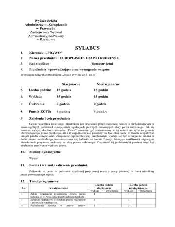 WyŜsza Szkoła Administracji i Zarządzania w Przemyślu Zamiejscowy Wydział Administracyjno-Prawny w Rzeszowie SYLABUS 1. Kierunek: „PRAWO” 2. Nazwa przedmiotu: EUROPEJSKIE PRAWO RODZINNE 3. Rok studiów: 4. Przedmioty wprowadzające oraz wymagania wstępne Semestr: letni Wymagane zaliczenie przedmiotu: „Prawo cywilne cz. I i cz. II”. Stacjonarne Niestacjonarne 5. Liczba godzin: 15 godzin 15 godzin 6. Wykład: 15 godzin 15 godzin 7. Ćwiczenia: 0 godzin 0 godzin 8. Punkty ECTS: 4 punkty 4 punkty 9. ZałoŜenia i cele przedmiotu Celem nauczania niniejszego przedmiotu jest uzyskanie przez studentów wiedzy o funkcjonujących w poszczególnych państwach europejskich regulacjach prawnych dotyczących sfery prawa rodzinnego. Jak się bowiem wydaje, absolwent kierunku „Prawo” powinien być zorientowany w tej materii nie tylko na gruncie obowiązującego prawa polskiego, ale i te zagadnienia nie powinny mu być obce takŜe w świetle uregulowań innych państw europejskich. Znajomość zaprezentowanej problematyki wydaje się być szczególnie istotna w dobie niemal swobodnego przemieszczania się ludności na terenie Europy. Istniejące moŜliwości migracyjne nieuchronnie przynoszą problemy ze sfery prawa rodzinnego. Znajomość tej problematyki powinna więc być atrybutem absolwenta wydziału prawa. 10. Metody dydaktyczne Wykład 11. Forma i warunki zaliczenia przedmiotu Zaliczenie na ocenę na podstawie uzyskanej pozytywnej oceny z pracy pisemnej na temat określony przez prowadzącego zajęcia. 12. Lp. I II III Treści programowe Tematyka zajęć Zakres tematyczny przedmiotu. Źródła prawa rodzinnego w Polsce oraz państwach europejskich. Zawarcie małŜeństwa w polskim prawie rodzinnym i państwach europejskich. Pochodzenie dziecka w prawie państw Liczba godzin stacjonarne wykład ćwiczenia Liczba godzin niestacjonarne wykład ćwiczenia 1 1 3 3 3 3 europejskich, ze szczególnym uwzględnieniem pochodzenia dziecka z małŜeństwa, jego uznania oraz sądowego ustalenia macierzyństwa i ojcostwa IV V Prawo adopcyjne w państwach europejskich Konwencje międzynarodowe dotyczące sfery prawa rodzinnego (np. Konwencja Praw Dziecka z 1989 r., Konwencja o Ochronie Praw Dzieci oraz Współpracy w Dziedzinie Przysposobienia Międzynarodowego z 1993 r., Europejska Konwencja w sprawie Adopcji Dzieci z 1967 r., Europejska Konwencja Bioetyczna z 1997 r. Przepisy prawne Unii Europejskiej regulujące problematykę prawa rodzinnego ze szczególnym uwzględnieniem rozporządzenia Rady (WE) z 2000 r. o jurysdykcji oraz uznawaniu i wykonywania orzeczeń w sprawach dotyczących odpowiedzialności rodzicielskiej za wspólne dzieci VI 13. 1. 3 3 3 3 2 2 Literatura podstawowa Prawa rodziny – prawa w rodzinie w świetle standardów międzynarodowych, tłumaczenie i opracowanie T. Jasudowicz, Toruń 1999. Prawa rodziny – prawa w rodzinie w świetle standardów międzynarodowych. Orzecznictwo Strasburskie, wybór I opracowanie T. Jasudowicz, Toruń 1999. Europejskie prawo rodzinne, pod red. H. Chwycia, Lublin 2006. 2. 3. 14. Literatura uzupełniająca 1. Pochodzenie dziecka i przysposobienie w prawie polskim i obcym. Transseksualizm – zagadnienia prawne, Lublin 1999. 2. J. Ciszewski, Europejskie prawo małŜeńskie I dotyczące odpowiedzialności rodzicielskiej. Komentarz, Warszawa 2004. 15. Nazwisko osoby prowadzącej zajęcia na studiach stacjonarnych - wykład: dr J. Gajda - ćwiczenia: 16. Nazwisko osoby prowadzącej zajęcia na studiach niestacjonarnych - wykład: dr J. Gajda - ćwiczenia:
