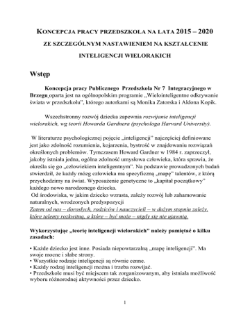 KONCEPCJA PRACY PRZEDSZKOLA NA LATA 2015 – 2020 ZE SZCZEGÓLNYM NASTAWIENIEM NA KSZTAŁCENIE INTELIGENCJI WIELORAKICH Wstęp Koncepcja pracy Publicznego Przedszkola Nr 7 Integracyjnego w Brzegu oparta jest na ogólnopolskim programie „Wielointeligentne odkrywanie świata w przedszkolu”, którego autorkami są Monika Zatorska i Aldona Kopik. Wszechstronny rozwój dziecka zapewnia rozwijanie inteligencji wielorakich, wg teorii Howarda Gardnera (psychologa Harvard University). W literaturze psychologicznej pojęcie „inteligencji” najczęściej definiowane jest jako zdolność rozumienia, kojarzenia, bystrość w znajdowaniu rozwiązań określonych problemów. Tymczasem Howard Gardner w 1984 r. zaprzeczył, jakoby istniała jedna, ogólna zdolność umysłowa człowieka, która sprawia, że określa się go „człowiekiem inteligentnym”. Na podstawie prowadzonych badań stwierdził, że każdy mózg człowieka ma specyficzną „mapę” talentów, z którą przychodzimy na świat. Wyposażenie genetyczne to „kapitał początkowy” każdego nowo narodzonego dziecka. Od środowiska, w jakim dziecko wzrasta, zależy rozwój lub zahamowanie naturalnych, wrodzonych predyspozycji Zatem od nas – dorosłych, rodziców i nauczycieli – w dużym stopniu zależy, które talenty rozkwitną, a które – być może – nigdy się nie ujawnią. Wykorzystując „teorię inteligencji wielorakich” należy pamiętać o kilku zasadach: • Każde dziecko jest inne. Posiada niepowtarzalną „mapę inteligencji”. Ma swoje mocne i słabe strony. • Wszystkie rodzaje inteligencji są równie cenne. • Każdy rodzaj inteligencji można i trzeba rozwijać. • Przedszkole musi być miejscem tak zorganizowanym, aby istniała możliwość wyboru różnorodnej aktywności przez dziecko. 1 • Przedszkolak, który ma możliwość decydowania o tym, w jaki sposób chce się bawić, ujawni swoje zainteresowania, upodobania. • Swoboda wyboru umożliwia diagnozę inteligencji każdego dziecka, a ta pozwala nauczycielom nie tylko na określenie potencjału dziecka, ale także na kreowanie warunków i dobór sposobów jego rozwijania. W tym procesie ważną rolę odgrywa również rodzina, która pomaga nauczycielowi diagnozować potencjał dziecka i uczestniczy w działaniach przedszkola, ukierunkowanych na rozwój inteligencji wielorakich dzieci. Taka też jest idea wiodąca koncepcji pracy pedagogicznej Publicznego Przedszkola Nr 7 Integracyjnego w Brzegu. Kadra pedagogiczna naszej placówki poszukuje nowych rozwiązań metodycznych umożliwiających wieloaspektowe wspieranie rozwoju dziecka we współpracy z rodzicami. Koncepcja pracy uwzględnia warunki, w jakich funkcjonuje przedszkole. Wstępem do niej jest misja przedszkola określająca główny cel placówki , działania pracowników pedagogicznych i niepedagogicznych ukierunkowane na rozwoju i edukacji każdego dziecka. Baza przedszkola Budynek przedszkola usytuowany jest w parku z dala od ulicznego zgiełku, a bogata roślinność w postaci wielu gatunków drzew, krzewów sprzyja i zachęca do częstych spacerów i zabaw. W budynku zlikwidowano bariery architektoniczne tj. dobudowano windę dla osób niepełnosprawnych, wykonano podjazd na wózki inwalidzkie, w ciągach komunikacyjnych zlikwidowano progi, doposażono łazienki do potrzeb dzieci z problemami ruchu, przy przedszkolu jest zagospodarowany ogród z placem zabaw wyposażonym w przyrządy dostosowane do potrzeb dzieci, Przedszkole posiada: piec sal dydaktycznych, sale do prowadzenia zajęć ruchowych, gabinety specjalistyczne do zajęć logopedycznych oraz pedagogiczny do pracy indywidualnej, sale dydaktyczne wyposażone są w drzwi z lustrem weneckim, co m.in umożliwia rodzicom obserwacje dziecka podczas zajęć, bez zakłócania ich przebiegu, sale i gabinety wyposażone są w nowoczesne programy komputerowe do diagnozy i terapii mowy i języka, programy do diagnozy zaburzeń słuchu, wzroku i mowy u dzieci w wieku przedszkolnym, pomoce specjalistyczne do prowadzenia zajęć rewalidacyjnych, sprzęt do prowadzenia diagnozy i terapii Metodą Integracji Sensorycznej. Wyposażenie w pomoce dydaktyczne przedszkola gwarantuje diagnozowanie oraz prowadzenie na bardzo dobrym poziomie terapii ruchowej, logopedycznej oraz zajęć indywidualnych z dziećmi, szczególnie z tymi 2 o specjalnych potrzebach edukacyjnych a także prowadzenie działań wspomagających rozwój i rozwijających uzdolnienia dzieci uczęszczających do naszego przedszkola. Analiza sytuacji bieżącej: • Cele i zadania edukacyjne wynikają z podstawy programowej wychowania przedszkolnego i są zgodne z polityką o światową • W przedszkolu jest opracowany i wdrażany program adaptacyjny. • Tworzone i wdrażane są inne programy własne. • Oferta edukacyjna sprzyja wszechstronnemu rozwojowi dziecka. • W placówce preferowane są twórcze metody pracy z dziećmi. • Zagadnienia z rocznego planu pracy przedszkola integrują i aktywizują całą społeczność przedszkolną . • Na podstawie systematycznie prowadzonej obserwacji i dokumentowanych jej wyników prowadzona jest diagnoza rozwoju dziecka. • Przedszkole jest otwarte na potrzeby dzieci i rodziców; zabiega o ich partnerstwo w wychowaniu dziecka . • Rodzice współdecydują w sprawach związanych z działalnością przedszkola; • Rozpoznawane są indywidualne potrzeby rozwojowe i edukacyjne dzieci ,są one wyznacznikiem działań wszystkich pracowników przedszkola. • Każde dziecko, ma zapewnione bezpieczeństwo i opiekę oraz higieniczne warunki pobytu. • Nasza placówka posiada także, dobrze wyposażony gabinet terapii ruchowej , logopedycznej i pedagogicznej . • Zarządzanie przedszkolem jest sprawne i skuteczne. 3 • Dobra atmosfera i klimat przedszkola sprzyjają efektywnej pracy placówki. Nauczyciel w naszym przedszkolu : • Jest przewodnikiem po ścieżkach wiedzy, współtowarzysząc dzieciom w zabawie. •Nieustann