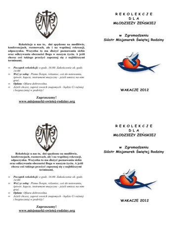 R E K O L E K C J E D L A MŁODZIEŻY ŻEŃSKIEJ w Zgromadzeniu Sióstr Misjonarek Świętej Rodziny Rekolekcje u nas to, dni spędzone na modlitwie, konferencjach, rozmowach, ale i na wspólnej rekreacji, odpoczynku. Wszystko to ma służyć poznawaniu siebie oraz odkrywaniu obecności Boga w naszym życiu. A jeśli chcesz coś takiego przeżyć zapoznaj się z najbliższymi terminami. • • • • Początek rekolekcji: o godz. 16.00. Zakończenie ok. godz. 14.00 Weź ze sobą: Pismo Święte, różaniec, coś do notowania, śpiwór, kapcie, instrument muzyczny - jeżeli umiesz na nim grać. Opłata: Ofiara dobrowolna. Jeżeli chcesz, zaproś swoich znajomych - będzie Ci raźniej i bezpieczniej w podróży! WAKACJE 2012 Zapraszamy! www.misjonarki-swietej-rodziny.org R E K O L E K C J E D L A MŁODZIEŻY ŻEŃSKIEJ Rekolekcje u nas to, dni spędzone na modlitwie, konferencjach, rozmowach, ale i na wspólnej rekreacji, odpoczynku. Wszystko to ma służyć poznawaniu siebie oraz odkrywaniu obecności Boga w naszym życiu. A jeśli chcesz coś takiego przeżyć zapoznaj się z najbliższymi terminami. • • • • Początek rekolekcji: o godz. 16.00. Zakończenie ok. godz. 14.00 Weź ze sobą: Pismo Święte, różaniec, coś do notowania, śpiwór, kapcie, instrument muzyczny - jeżeli umiesz na nim grać. Opłata: Ofiara dobrowolna. Jeżeli chcesz, zaproś swoich znajomych - będzie Ci raźniej i bezpieczniej w podróży! Zapraszamy! www.misjonarki-swietej-rodziny.org w Zgromadzeniu Sióstr Misjonarek Świętej Rodziny WAKACJE 2012 MŁAWA 1 - 4 lipca 2012 r. ul. Sienkiewicza 34 "Skosztujcie i zobaczcie jak dobry jest Pan" - wakacje z Biblią Zgłoszenia przyjmuje S. Sabina Pruszyńska; e-mail: [email protected] tel. 023/ 654 33 77; 507 251 360; CHEŁMNO 16 -24 sierpnia 2012 r. (k. Torunia) Rekolekcje ignacjańskie w milczeniu ul. Łożyńskiego3 – I tydzień Zgłoszenia przyjmuje S. Paulina Mieleszkiewicz ; tel. 056/ 686.09.40; e-mail: [email protected] /koszt 70 zł/ ; wiek - powyżej 16 lat CZĘSTOCHOWA 23 - 27 lipca 2012 r. ul.Kapucyńska 9 „Różnorodność kobiecych dróg“ Zgłoszenia przyjmuje s. Bolesława Wierzchowska ; tel. 694 052 389 e-mail:[email protected] „Trzeba nam z bliska patrzeć na Jezusa, Aby Go widzieć, takim jakim jest” Bł. Bolesława Lament MŁAWA 1 - 4 lipca 2012 r. ul. Sienkiewicza 34 "Skosztujcie i zobaczcie jak dobry jest Pan" - wakacje z Biblią Zgłoszenia przyjmuje S. Sabina Pruszyńska; e-mail: [email protected] tel. 023/ 654 33 77; 507 251 360; CZĘSTOCHOWA 23 - 27 lipca 2012 r. ul.Kapucyńska 9 „Różnorodność kobiecych dróg“ Zgłoszenia przyjmuje s. Bolesława Wierzchowska; tel. 694 052 389; e-mail:[email protected] CHEŁMNO (k. Torunia) ul. Łożyńskiego3 16 -24 sierpnia 2012 r. Rekolekcje ignacjańskie w milczeniu – I tydzień Zgłoszenia przyjmuje S. Paulina Mieleszkiewicz ; tel. 056/ 686.09.40; e-mail: [email protected] /koszt 70 zł/ ; wiek - powyżej 16 lat „Trzeba nam z bliska patrzeć na Jezusa, Aby Go widzieć, takim jakim jest” Bł. Bolesława Lament