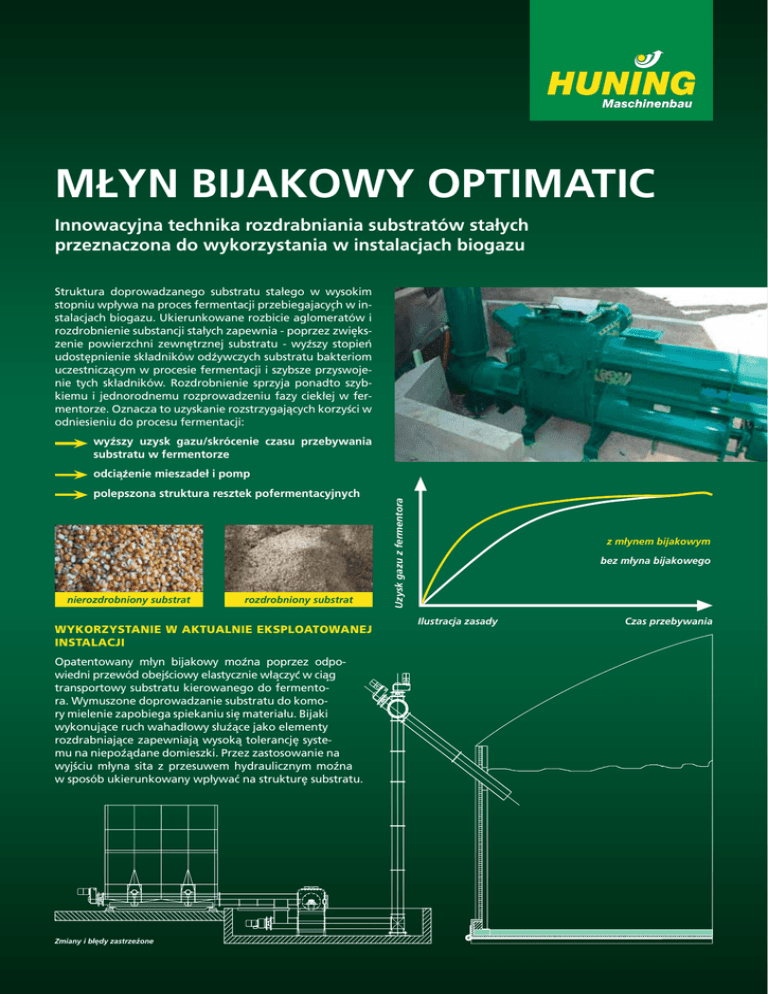 MŁYN BIJAKOWY OPTIMATIC Innowacyjna technika rozdrabniania substratów stałych przeznaczona do wykorzystania w instalacjach biogazu Struktura doprowadzanego substratu stałego w wysokim stopniu wpływa na proces fermentacji przebiegajacych w instalacjach biogazu. Ukierunkowane rozbicie aglomeratów i rozdrobnienie substancji stałych zapewnia - poprzez zwiekszenie powierzchni zewnetrznej substratu - wyzszy stopien udostepnienie składników odzywczych substratu bakteriom uczestniczacym w procesie fermentacji i szybsze przyswojenie tych składników. Rozdrobnienie sprzyja ponadto szybkiemu i jednorodnemu rozprowadzeniu fazy ciekłej w fermentorze. Oznacza to uzyskanie rozstrzygajacych korzysci w odniesieniu do procesu fermentacji: wyzszy uzysk gazu/skrócenie czasu przebywania substratu w fermentorze odciazenie mieszadeł i pomp polepszona struktura resztek pofermentacyjnych nierozdrobniony substrat rozdrobniony substrat WYKORZYSTANIE W AKTUALNIE EKSPLOATOWANEJ INSTALACJI Opatentowany młyn bijakowy mozna poprzez odpowiedni przewód obejsciowy elastycznie właczyc w ciag transportowy substratu kierowanego do fermentora. Wymuszone doprowadzanie substratu do komory mielenie zapobiega spiekaniu sie materiału. Bijaki wykonujace ruch wahadłowy słuzace jako elementy rozdrabniajace zapewniaja wysoka tolerancje systemu na niepozadane domieszki. Przez zastosowanie na wyjsciu młyna sita z przesuwem hydraulicznym mozna w sposób ukierunkowany wpływac na strukture substratu. Zmiany i błedy zastrzezone Uzysk gazu z fermentora z młynem bijakowym bez młyna bijakowego Ilustracja zasady Czas przebywania Mobilny MŁYN BIJAKOWY przykład: słoma przed rozdrobnieniem po rozdrobnieniu PRZEDSIEBIORSTWO GRUPY HUNING przykład: buraki cukrowe przed rozdrobnieniem po rozdrobnieniu HUNING Maschinenbau GmbH • Wellingholzhausener Straße 6, D-49324 Melle Tel. +49 (0) 54 22/6 08-2 60 • Fax +49 (0) 54 22/6 08-2 63 [email protected] • www.huning-maschinenbau.de