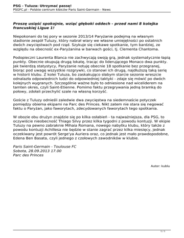 PSG - Tuluza: Utrzymać passę! PSGFC.pl - Polskie centrum kibiców Paris Saint-Germain - News Proszę usiąść spokojnie, wziąć głęboki oddech - przed nami 8 kolejka francuskiej Ligue 1! Niepokonani do tej pory w sezonie 2013/14 Paryżanie podejmą na własnym stadionie zespół Tuluzy, który nabrał wiary we własne umiejętności po ostatnich dwóch zwycięstwach pod rząd. Szykuje się ciekawe spotkanie, tym bardziej, ze względu na obecność ex-Paryżanina w barwach gości, tj. Clementa Chantoma. Podopieczni Laurenta Blanca nie zachwycają swoją grą, jednak systematycznie łapią punkty. Obecnie okupują drugą lokatę, tracąc do liderującego Monaco dwa punkty. Jak twierdzą statystycy, Paryżanie notuję obecnie 18 spotkanie bez przegranej, biorąc pod uwagę wszystkie rozgrywki, co stanowi ich drugą, najdłuższą taką serię w historii klubu. Z kolei Tuluza, bo zaskakująco słabym starcie sezonie wreszcie odnalazła odpowiednich ludzi do odpowiedniej taktyki - zdaje się mówić po dwóch kolejnych wygranych. Szczególnie ważne było to odniesione nad wiceliderem na tamten okres, czyli Saint-Etienne. Pomimo faktu przegrywania jedną bramką do połowy, zdołali przechylić szale na własną korzyść. Goście z Tuluzy odnieśli zaledwie dwa zwycięstwa na siedemnaście potyczek pomiędzy obiema ekipami na Parc des Princes. Nikt zatem nie stara się negować faktu o Paryżan, jako faworytach, zdecydowanych faworytach tego spotkania. W obozie obu drużyn znajdzie się po kilka osłabień - ta najważniejsza, dla PSG, to oczywiście nieobecność Thiago Silvy przez kilka tygodni z powodu kontuzji. W ekipie Tuluzy na pewno zabraknie Mihaia Romana, nowego nabytku klubu, który także z powodu kontuzji Achillesa nie będzie w stanie zagrać przez kilka miesięcy, jednak oczekiwany jest powrót Serge'ya Auriera oraz, co jednak jest mało prawdopodobne, Edena Ben Basata, czyli jednego z czołowych zawodników w klubie. Paris Saint-Germain - Toulouse FC Sobota, 28.09.2013 17.00 Parc des Princes Autor: kublu 1/1 Powered by TCPDF (www.tcpdf.org)