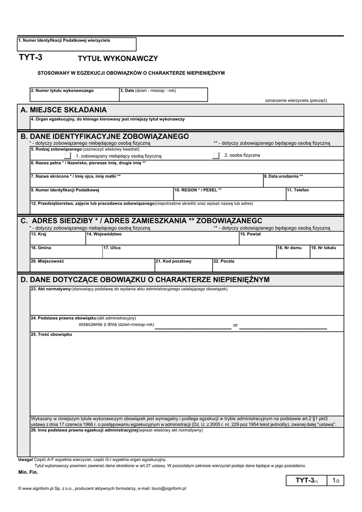 1. Numer Identyfikacji Podatkowej wierzyciela TYT-3 TYTUŁ WYKONAWCZY STOSOWANY W EGZEKUCJI OBOWIĄZKÓW O CHARAKTERZE NIEPIENIĘŻNYM 2. Numer tytułu wykonawczego 3. Data (dzień - miesiąc - rok) oznaczenie wierzyciela (pieczęć) A. MIEJSCE SKŁADANIA 4. Organ egzekucyjny, do którego kierowany jest niniejszy tytuł wykonawczy B. DANE IDENTYFIKACYJNE ZOBOWIĄZANEGO * - dotyczy zobowiązanego niebędącego osobą fizyczną ** - dotyczy zobowiązanego będącego osobą fizyczną 5. Rodzaj zobowiązanego (zaznaczyć właściwy kwadrat): 2. osoba fizyczna 1. zobowiązany niebędący osobą fizyczną 6. Nazwa pełna * / Nazwisko, pierwsze imię, drugie imię ** 7. Nazwa skrócona * / Imię ojca, imię matki ** 9. Numer Identyfikacji Podatkowej 8. Data urodzenia ** 10. REGON * / PESEL ** 11. Telefon 12. Przedsiębiorstwo, zajęcie lub pracodawca zobowiązanego (niepotrzebne skreślić oraz wpisać nazwę lub adres) C. ADRES SIEDZIBY * / ADRES ZAMIESZKANIA ** ZOBOWIĄZANEGO ** - dotyczy zobowiązanego będącego osobą fizyczną * - dotyczy zobowiązanego niebędącego osobą fizyczną 13. Kraj 16. Gmina 14. Województwo 15. Powiat 17. Ulica 20. Miejscowość 18. Nr domu 21. Kod pocztowy 19. Nr lokalu 22. Poczta D. DANE DOTYCZĄCE OBOWIĄZKU O CHARAKTERZE NIEPIENIĘŻNYM 23. Akt normatywny (stanowiący podstawę do wydania aktu administracyjnego ustalającego obowiązek) 24. Podstawa prawna obowiązku (akt administracyjny) orzeczenie z dnia (dzień-miesiąc-rok) nr 25. Treść obowiązku Wykazany w niniejszym tytule wykonawczym obowiązek jest wymagalny i podlega egzekucji w trybie administracyjnym na podstawie art.2 §1 pkt3 ustawy z dnia 17 czerwca 1966 r. o postępowaniu egzekucyjnym w administracji (Dz. U. z 2005 r. nr. 229 poz 1954 tekst jednolity), zwanej dalej "ustawą". 26. Inna podstawa prawna egzekucji administracyjnej (wpisać właściwy akt normatywny) Uwaga! Część A-F wypełnia wierzyciel, część G-I wypełnia organ egzekucyjny. Tytuł wykonawczy powinien zawierać dane określone w art.27 ustawy. W pozostałym zakresie wierzyciel podaje dane będące w jego posiadaniu. Min. Fin. TYT-3(1) © www.signform.pl Sp. z o.o., producent aktywnych formularzy, e-mail: [email protected] 1/2 E. WNIOSEK Na podstawie art.26 §1 ustawy wnoszę o wszczęcie egzekucji obowiązku wymienionego w niniejszym tytule wykonawczym. 27. Pieczęć urzędowa 28. Kwota należnych kosztów upomnienia 29. Upomnienie doręczono w dniu (dzień-miesiąc-rok) 30. Podpis i pieczątka z podaniem imienia, nazwiska i stanowiska służbowego 31. Data (dzień-miesiąc-rok) F. DANE DOTYCZĄCE RACHUNKU BANKOWEGO WIERZYCIELA 32. Nazwa banku (oddziału) 33. Pełny numer rachunku G. KLAUZULA O SKIEROWANIU TYTUŁU WYKONAWCZEGO DO EGZEKUCJI 34. Pieczęć nagłówkowa Niniejszy tytuł wykonawczy zostaje skierowany do przymusowego wykonania wymienionego w nim obowiązku, poprzez zastosowanie następujących środków egzekucyjnych: ***) 1) grzywny w celu przymuszenia, 2) wykonania zastępczego, 3) odebrania rzeczy ruchomej, 4) odebrania nieruchomości, opróżnienia lokali i innych pomieszczeń, 5) przymusu bezpośredniego, Zobowiązanemu przysługuje w terminie 7 dni prawo zgłoszenia zarzutów w sprawie prowadzenia postępowania egzekucyjnego. Podstawą zarzutu może być tylko: 35. Podpis i pieczątka z podaniem imienia, nazwiska i stanowiska służbowego 1) wykonania lub umorzenie w całości albo w części obowiązku, przedawnienie, wygaśnięcie albo nieistnienie obowiązku, 2) określenie egzekwowanego obowiązku niezgodnie z treścią obowiązku, wynikającego z orzeczenia, 3) błąd co do osoby zobowiązanego, 4) niewykonalność obowiązku, 5) niedopuszczalność egzekucji administracyjnej lub zastosowanego środka egzekucyjnego, 6) brak uprzedniego doręczenia zobowiązanemu upomnienia, 7) zastosowanie zbyt uciążliwego środka egzekucyjnego, 8) prowadzenie egzekucji przez niewłaściwy organ egzekucyjny, 9) niespełnienie wymogów określonych w art.27 ustawy. Jednocześnie informuje się, że zgodnie z art.36 §3 ustawy zobowiązany, przeciwko któremu wszczęto postępowanie egzekucyjne, jest obowiązany do powiadomienia, w ciągu 7 dni, organu egzekucyjnego o każdej zmianie miejsca swojego pobytu, trwającej dłużej niż jeden miesiąc. 36. Data (dzień - miesiąc - rok) W razie zaniedbania tego powiadomienia, na zobowiązanego może być nałożona kara pieniężna (art.168d §3 ustawy). H. POTWIERDZENIE ODBIORU Odpis niniejszego tytułu wykonawczego z klauzulą o skierowaniu go do egzekucji otrzymałem oraz zapoznałem się z pouczeniem o prawie zgłoszenia zarzutów w sprawie prowadzenia postępowania egzekucyjnego. 37. Data (dzień-miesiąc-rok) 38. Czytelny podpis otrzymującego I. ZAKOŃCZENIE EGZEKUCJI 40. Data zakończenia egzekucji (dzień-miesiąc-rok) 41. Podpis osoby upoważnionej ***) Niepotrzebne skreślić. TYT-3(1) 2/2 © www.signform.pl Sp. z o.o., producent aktywnych formularzy, e-mail: [email protected] 39. Doręczył