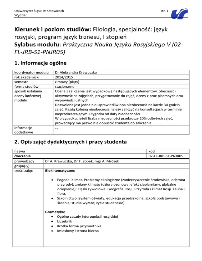 Uniwersytet Śląski w Katowicach Wydział str. 1 Kierunek i poziom studiów: Filologia, specjalność: język rosyjski, program język biznesu, I stopień Sylabus modułu: Praktyczna Nauka Języka Rosyjskiego V (02FL-JRB-S1-PNJR05) 1. Informacje ogólne koordynator modułu rok akademicki semestr forma studiów sposób ustalania oceny końcowej modułu Dr Aleksandra Krawuczka 2014/2015 zimowy (piąty) stacjonarne Ocena z zaliczenia jest wypadkową następujących elementów: obecność i aktywność na zajęciach, przygotowanie do zajęć, oceny z prac pisemnych oraz wypowiedzi ustnych Dozwolona jest jedna nieusprawiedliwiona nieobecność na każde 30 godzin zajęć. Każdą kolejną nieobecność należy zaliczyć na konsultacjach w terminie nieprzekraczającym 2 tygodni od daty nieobecności. W przypadku, jeżeli liczba nieobecności przekroczy 20% odbytych zajęć, prowadzący ma prawo nie dopuścić studenta do zaliczenia. informacje dodatkowe -- 2. Opis zajęć dydaktycznych i pracy studenta nazwa ćwiczenia prowadzący grupa(-y) treści zajęć kod 02-FL-JRB-S1-PNJR05 Dr A. Krawuczka, Dr T. Zobek, mgr A. Mrózek Bloki tematyczne: Pogoda. Klimat. Problemy ekologiczne (zanieczyszczenie środowiska, ochrona przyrody); zmiany klimatu (dziura ozonowa, efekt cieplarniany, globalne ocieplenie); Klęski żywiołowe. Geografia Rosji. Przyroda i klimat Rosji. Fauna i flora. Szkolnictwo (system oświaty; edukacja przedszkolna; szkoła podstawowa i średnia; studia wyższe; życie studenckie) Gramatyka: Ogólne zasady interpunkcji rosyjskiej Liczebnik Krótka forma przymiotnika Imiesłowy i strona bierna Uniwersytet Śląski w Katowicach Wydział metody prowadzenia zajęć liczba godzin dydaktycznych (kontaktowych) liczba godzin pracy własnej studenta opis pracy własnej studenta organizacja zajęć literatura obowiązkowa str. 2 Ćwiczenia przedmiotowe (leksykalne, gramatyczne, w tym: dyktanda, opisy ilustracji, testy, tłumaczenia zdań z języka polskiego na rosyjski, relacjonowanie, streszczanie, opowiadanie); gry dydaktyczne; praca w zespołach (integrowanie, komunikowanie); 90 70 Praca własna studenta obejmuje przygotowanie do ćwiczeń oraz prac kontrolnych. 3 zajęcia w tygodniu. Wielkość jednostki zajęć: 90 minut Jednostki kontaktowe zgodnie z harmonogramem zajęć Instytutu Filologii Wschodniosłowiańskiej Uniwersytetu Śląskiego. 1. Gołubiewa A., Kowalska N., Русский язык сегодня, Wyd. Agmen, Warszawa 2009. 2. Skorohodov L., Hrohordina O., Окно в Россию, Moskwa: Wyd. Zlatoust 2010. 3. Chlebda B., Danecka I., Skrypt do praktycznej nauki języka rosyjskiego dla studentów I roku filologii rosyjskiej, Opole 2007. 4. Chlebda B., Danecka I., Skrypt do praktycznej nauki języka rosyjskiego, cz. II, Opole 2010. 5. Machnacz A., Из первых уст, Warszawa 2009. 6. Cieplicka M., Torzewska D., Русский язык. Kompendium tematycznoleksykalne 2, Poznań: Wyd. Wagros 2008 7. Pado A., Ты за или против? Materiały uzupełniające, Warszawa: Wyd. WSiP 2003. 8. Rosjoznawstwo. Wprowadzenie do studiów nad Rosją. Red. Suchanek I., Kraków 2004. 9. Chuchmacz D., Ossowska H., Вот грамматика! Repetytorium gramatyczne z języka rosyjskiego z ćwiczeniami, PWN, W-wa 2010. 10. Gołubiewa A., Kuratczyk M., Gramatyka języka rosyjskiego z ćwiczeniami, PWN, W-wa 2011. 11. Dziewanowska D., Ćwiczenia z ortografii rosyjskiej. Warszawa 1999. 12. Караванова Н.Б., Слушаем живую русскую речь: Пособие по аудированию для иностранцев, изучающих русский язык. Москва 2011. Słowniki: 1. Rieger J., Rieger E., Słownik tematyczny rosyjsko-polski, Wiedza Powszechna, Warszwa 2003. 2. Słowniki dwujęzyczne polsko-rosyjskie, rosyjsko-polskie. literatura uzupełniająca adres strony www zajęć źródła internetowe, materiały audiowizualne Uniwersytet Śląski w Katowicach Wydział str. 3 informacje dodatkowe 3. Opis sposobów weryfikacji efektów kształcenia modułu Nazwa Wypowiedzi ustne kod 02-FL-JRB-S1-PNJR05_w_01 kod(-y) zajęć osoba(-y) Dr A. Krawuczka, Dr T. Zobek, mgr A. Mrózek przeprowadzająca(e) weryfikację grupa(-y) wymagania 1. Umiejętność formułowania wypowiedzi na tematy przewidziane w merytoryczne treściach programowych a) reprodukcja b) produkcja 2. Umiejętność wchodzenia w interakcję Student powinien przestrzegać poprawności wypowiedzi na czterech poziomach języka (fonetyka, gramatyka, leksyka, składnia). kryteria oceny Weryfikacja poprawności fonetycznej i prozodycznej, gramatycznej, leksykalnoskładniowej. Ocena uwzględnia zasób wykorzystywanego słownictwa. przebieg procesu weryfikacji W trakcie zajęć: wypowiedzi ustne w zakresie opracowanego materiału (monologi, dialogi, streszczenia przeczytanego/wysłuchanego tekstu). Reakcja na pytania nauczyciela. Dodatkowo na konsultacjach (według uznania prowadzącego) wypowiedzi ustne na zadany temat. informacje dodatkowe -- Nazwa kod 02-FL-JRB-S1-PNJR05_w_02 Prace pisemne kod(-y) zajęć osoba(-y) Dr A. Krawuczka, Dr T. Zobek, mgr A. Mrózek przeprowadzająca(e) weryfikację grupa(-y) wymagania 1. Opanowanie i prawidłowe użycie poznanej leksyki. merytoryczne 2. Opanowanie struktur gramatycznych wynikających z treści programowych i ich poprawne zastosowanie. 3. Przyswojenie zasad ortografii rosyjskiej. kryteria oceny Test leksykalno-gramatyczny, tłumaczenie: Uniwersytet Śląski w Katowicach Wydział str. 4 za każdą poprawną formę gramatyczną i leksykalną przyznawane są punkty, których liczba uzależniona jest od stopnia trudności danej formy. Od maksymalnej liczby punktów możliwej do zdobycia odejmuje się punkty za popełnione błędy: Zasadniczy błąd leksykalny i gramatyczny: – 1 pkt. Błąd ortograficzny: – 0,5 pkt. Błąd interpunkcyjny: - 0,25 pkt. Dyktando: przyznawane punkty są uzależnione od zasadniczej reguły ortograficznej, któr