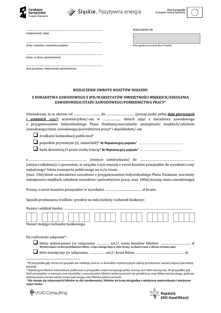 ……………………………………………................................... ROZLICZENIE NR (miejscowość, data) ……………………………………………................................... (imię i nazwisko uczestnika projektu) Pole wypełnia pracownik Biura Projektu ……………………………………………................................... (ulica, nr domu zamieszkania) ……………………………………………................................... (kod pocztowy, miejscowość zamieszkania) ROZLICZENIE ZWROTU KOSZTÓW DOJAZDU Z DORADZTWA ZAWODOWEGO Z IPD/WARSZTATÓW UMIEJĘTNOŚCI MIĘKKICH/SZKOLENIA ZAWODOWEGO/STAŻU ZAWODOWEGO/POŚREDNICTWA PRACY* Oświadczam, że w okresie od ………………….......... do ………………….……... (proszę podać pełną datę pierwszych i ostatnich zajęć) uczestniczyłem/-am w ……................ dniach zajęć z doradztwa zawodowego z przygotowaniem Indywidualnego Planu Działania/warsztatów umiejętności miękkich/szkolenia zawodowego/stażu zawodowego/pośrednictwa pracy* i dojeżdżałem/-am środkami komunikacji publicznej* pojazdem prywatnym (tj. samochód)* Nr Rejestracyjny pojazdu ………………………………..………. będę dowożony/a przez osobę trzecią* Nr Rejestracyjny pojazdu ………………………………..….. 1 1 z ……………………………………………….…….. (miejsce zamieszkania) do ………………………..………………………… (miejsce szkolenia) i z powrotem, w związku z tym wnoszę o zwrot kosztów przejazdów do wysokości ceny najtańszego2 biletu transportu publicznego na w/w trasie. (max. 10zł/dzień za doradztwo zawodowe z przygotowaniem Indywidualnego Planu Działania, warsztaty umiejętności miękkich, szkolenie zawodowe i pośrednictwo pracy, max. 100zł/miesiąc stażu zawodowego) Proszę o zwrot kosztów przejazdów w wysokości ……………….......................... zł brutto Sposób przekazania środków: przelew na mój osobisty rachunek bankowy: Nazwa i oddział banku: ………………………………………………………………………………………………………………………… Numer mojego rachunku bankowego: Do rozliczenia załączam*: bilety jednorazowe (w załączeniu ………..… szt.)3, suma kosztów biletów: ……………………..…… zł Wystarczające są dwa przykładowe bilety, z tego samego dnia w obie strony, na danej trasie z okresu trwania zajęć. bilet miesięczny (w załączeniu ……………… szt.)3, koszt biletu: ……………………………….…………… zł. W przypadku gdy właściciel pojazdu nie widnieje jeszcze w dowodzie rejestracyjnym należy przedstawić umowę kupna/sprzedaży pojazdu. 2 Najtańszym biletem komunikacji publicznej w przypadku stażu trwającego pełny miesiąc jest bilet miesięczny. W przypadku gdy ilość przejazdów w miesiącu jest niewielka i suma kosztów biletów jednorazowych nie przekracza ceny biletu miesięcznego, podczas dokonywania zwrotu należy wziąć pod uwagę ceny biletów jednorazowych. 3 Nie uznaje się załączonych biletów za dni nieobecności, biletów na trasę niezgodną z miejscem zamieszkania i miejscem zajęć/stażu. 1 zaświadczenie przewoźnika publicznego o najtańszym koszcie przejazdu na danej trasie; koszt biletu jednorazowego: …………...………… zł, koszt biletu miesięcznego: ………………………… zł. umowę użyczenia pojazdu (tj. samochód) obustronną kserokopię prawa jazdy z dopiskiem „Potwierdzam za zgodność z oryginałem nazwisko UP)” (imię i obustronną kserokopię dowodu rejestracyjnego pojazdu z dopiskiem „Potwierdzam za zgodność z oryginałem (imię i nazwisko UP)” oświadczenie UP – osoby dowożonej o dowożeniu na zajęcia oświadczenie osoby dowożącej o dowożeniu UP kserokopię umowy kupna/sprzedaży z dopiskiem „Potwierdzam za zgodność z oryginałem (imię i nazwisko UP)”- w przypadku gdy właściciel nie widnieje jeszcze w dowodzie rejestracyjnym pojazdu. Oświadczam, że znana jest mi treść regulaminu „Zwrot kosztów dojazdu dla uczestników projektu „Kopalnia EKO-Kwalifikacji” nr RPSL.07.04.02-24-02BG/15 Świadomy/-a odpowiedzialności karnej z art. 233 § 1 Kodeksu karnego za składanie fałszywych zeznań oświadczam, że dane zawarte w niniejszym rozliczeniu są zgodne z prawdą. …..…..…………………………………. Podpis uczestnika projektu * zaznaczyć właściwe/niewłaściwe wykreślić
