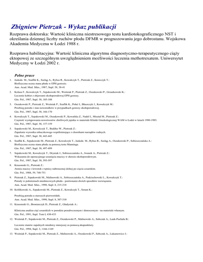 Zbigniew Pietrzak - Wykaz publikacji Rozprawa doktorska: Wartość kliniczna niestresowego testu kardiotokograficznego NST i określania dziennej liczby ruchów płodu DFMR w prognozowaniu jego dobrostanu. Wojskowa Akademia Medyczna w Łodzi 1988 r. Rozprawa habilitacyjna: Wartość kliniczna algorytmu diagnostyczno-terapeutycznego ciąży ektopowej ze szczególnym uwzględnieniem możliwości leczenia methotrexatem. Uniwersytet Medyczny w Łodzi 2002 r. Pełne prace 1. Jaskuła M., Szaflik K., Szeląg A., Rybus R., Kowalczyk T., Pietrzak Z., Krawczyk T.: Biofizyczna ocena stanu płodu w EPH gestozie. Ann. Acad. Med. Siles., 1987, Supl. 58, 38-41 2. Kolasa F., Kowalczyk T., Szpakowski M., Woźniak P., Pietrzak Z., Oszukowski P., Grzankowski K.: Leczenie kobiet z objawami okołoporodowej EPH gestozy. Gin. Pol., 1987, Supl. 58, 105-108 3. Oszukowski P., Pietrzak Z., Woźniak P., Szaflik K., Połać I., Błaszczyk J., Kowalczyk M.: Przebieg porodu i stan noworodków w przypadkach gestozy okołoporodowej. Gin. Pol., 1987, Supl. 58, 166-170 4. Kowalczyk T., Szpakowski M., Oszukowski P., Kowalska Z., Nadel I., Misztal M., Pietrzak Z.: Częstość występowania nowotworów złośliwych jajnika w materiale Kliniki Ginekologicznej WAM w Łodzi w latach 1980-1985. Gin. Pol., 1987, Supl. 58, 157-159 5. Szpakowski M., Kowalczyk T., Budźko W., Pietrzak Z.: Zapalenie wyrostka robaczkowego współistniejące z chorobami narządów rodnych. Gin. Pol., 1987, Supl. 58, 443-445 6. Szaflik K., Szpakowski M., Pietrzak Z., Kowalczyk T., Jaskuła M., Rybus R., Szeląg A., Oszukowski P., Sobieszczańska A.: Biofizyczna ocena stanu płodu za pomocą testu Manninga. Gin. Pol., 1987, Supl. 58, 497-499 7. Szpakowski M., Kowalczyk T., Dryniak J., Sobieszczańska A., Iwanek A., Pietrzak Z.: Wskazania do operacyjnego usunięcia macicy w okresie okołoporodowym. Gin. Pol., 1987, Supl. 58, 593-597 8. Krasomski G., Pietrzak Z.: Atonia macicy i krwotok z tętnicy nabrzusznej dolnej po cięciu cesarskim. Gin. Pol., 1988, 59, 748-751 9. Pietrzak Z., Szpakowski M., Malinowski A., Sobieszczańska A., Podciechowski L., Kowalczyk T.: Porody w położeniach miednicowych płodu - porównanie dwóch sposobów rozwiązania. Ann. Acad. Med. Siles., 1990, Supl. 8, 215-218 10. Królikowski A., Szpakowski M., Pietrzak Z., Kowalczyk T., Szram K.: Przebieg porodu u starszych pierworódek. Ann. Acad. Med. Siles., 1990, Supl. 8, 307-310 11. Krasomski G., Broniarczyk D., Pietrzak Z., Gładysiak A.: Kliniczna analiza cięć cesarskich w porodzie przedwczesnym i donoszonym - na materiale własnym. Gin. Pol., 1991, Supl. Tom I, 430-433 12. Woźniak P., Szpakowski M., Pietrzak Z., Oszukowski P., Malinowski A., Sobczuk A., Lauk-Puchała B.: Leczenie stanów zapalnych miednicy mniejszej za pomocą akupunktury. Gin. Pol., 1994, Supl. 3, 1166-1169 13. Woźniak P., Szpakowski M., Pietrzak Z., Malinowski A., Oszukowski P., Sobczuk A., Lukamowicz J.: Zastosowanie akupunktury w leczeniu bolesnych miesiączek. Gin. Pol., 1994, Supl. 3, 1267-1268 14. Sobczuk A., Szpakowski M., Pietrzak Z., Pawłowski T., Woźniak P.: Promienica narządów płciowych u kobiet. Gin. Pol., 1994, Supl. 3, 1256-1259 15. Pietrzak Z., Szpakowski M., Sobczuk A.: Zachowawcze leczenie ciąży jajowodowej przy użyciu Methotrexatu podawanego domięśniowo. Gin. Pol., 1994, Supl. 3, 1278-1281 16. Pietrzak Z., Szpakowski M., Sobczuk A.: Zachowawcze leczenie ciąży jajowodowej. Gin. Pol., 1994, Supl. 4, 136-139 17. Sobczuk A., Pietrzak Z., Pertyński T., Pawłowski T., Kowalczyk T.: Przydatność histeroskopii w diagnostyce krwawień wieku okołomenopauzalnego. Gin. Pol., 1994, Supl 65 (6B), 150-156 18. Malinowski A., Szpakowski M., Pokoca M., Zeman K., Oszukowski P., Woźniak P., Pietrzak Z., Banasik M.: Występowanie przeciwciał antykardiolipinowych u kobiet z poronieniami nawykowymi oraz ich prognostyczna wartość dla powodzenia immunizacji limfocytami partnera. Klin. Perinatol. i Ginekol., 1995, Suol. XII/2, 599-604 19. Sobczuk A., Woźniak P., Pietrzak Z., Pertyński T., Makuła A., Bartosiak I.: Leczenie objawów klimakterycznych u kobiet w okresie około menopauzalnym z uwzględnieniem wykorzystania akupunktury. Akup. Pol., 1996, 2, 52-56 20. Pietrzak Z., Szram K., Augustyniak T.: Poród po przebytych dwóch ciążach ektopowych leczonych zachowawczo i operacyjnie. Gin. Pol., 1997, 68 (5B), 429-431 21. Szram K., Kędziora J., Szpakowski M., Pietrzak Z., Stachowiak G., Augustyniak T.: Ocena zachowania się wybranych parametrów antyoksydacyjnych w ciąży powikłanej poronieniem w zależności od stopnia narażenia na dym tytoniowy. Gin. Pol., 1997, 68 (5B), 76-80 22. Szram K., Kędziora J., Szpakowski M., Pietrzak Z., Stachowiak G., Augustyniak T.: Peroksydacja lipidów krwinek płytkowych we wczesnej fizjologicznej ciąży. Gin. Pol., 1997, 68 (5B), 71-75 23. Pietrzak Z., Augustyniak T., Szram K., Cieślak J., Mixa D.: Efficacy of methotrexate in the treatment of nonruptured ectopic pregnancy. Acta. Obstet. Gynecol. Scand., 1999, 78 (3), 258-259 24. Płużańska A., Zambrano O., Stempczyńska J., Ułańska M., Szpakowski M., Pietrzak Z., Szyłło K., Dec W.: Cis-platyna i cyklofosfamid +/- druga operacja cytoredukcyjna w zaawansowanym raku jajnika – wyniki odległe leczenia w Makroregionie Łódzkim. Onkol. Pol., 1999, 2 (2), 65-75 25. Pietrzak Z., Szpakowski M., Augustyniak T., Szram K., Wilczyński J.: Ectopic pregnancy in monozygotic twin sisters treated in a 33 day interval. Arch. Perinat. Med., 2000, , 26. Wąsowicz W., Gromadzińska J., Szram K., Rydzyński K., Cieślak J., Pietrzak Z.: Selenium, zinc and copper concentration in the blood and milk of lactating women. Biological Trace Element Research, 2000, 79, 1-13 27. Pietrzak Z., Szpakowski M., Augustyniak T., Szram K., Wilczyński J.: Delivery after tubal pregnancy conservatively treated as evidence of retainedtubal function. Arch. Perinat. Med., 2000, 6 (1), 46-47 28. Pietrzak Z., Andrzejewski W., Sobczuk A., 