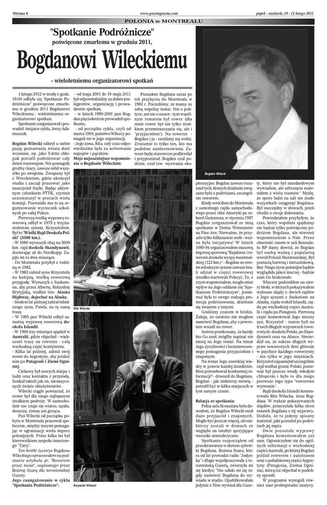 Strona 6 www.gazetagazeta.com piątek - niedziela, 10 - 12 lutego 2012 POLONIA w MONTREALU "Spotkanie Podróżnicze" poświęcone zmarłemu w grudniu 2011, Bogdanowi Wileckiemu - wieloletniemu organizatorowi spotkań 1 lutego 2012 w środę o godz. 19:00 odbyło się "Spotkanie Podróżnicze" poświęcone zmarłemu w grudniu 2011 Bogdanowi Wileckiemu - wieloletniemu organizatorowi spotkań. Spotkanie zorganizował i prowadził inicjator cyklu, Jerzy Adamuszek. Bogdan Wilecki odkrył u siebie pasję poznawania świata dość wcześnie, np. jako 5-letni chłopak potrafił podróżować cały dzień tramwajem. Nie pomagały groźby i kary, zawsze robił wszystko po swojemu. Związany był z Wrocławiem, gdzie ukończył studia i zaczął pracować jako nauczyciel fizyki. Będąc aktywnym członkiem PTTK, czynnie uczestniczył w pracach wielu komisji. Pozwalało mu to na organizowanie wycieczek szkolnych po całej Polsce. Pierwszą wielką wyprawę rowerową odbył w 1979 z trzynastoletnim synem, Krzysztofem. Był to "Wielki Rajd Dookoła Polski" (3500 km.). - W 1980 wyruszyli obaj na 5000 km. rajd dookoła Skandynawii, docierając aż do Nordkapp. Zajęło im to dwa miesiące. - Do Montrealu przybył z rodziną w 1982. - W 1983 zabrał syna Krzysztofa na kolejną, wielką rowerową przygodę. Wyruszyli z Saskatoon, aby przez Albertę, Kolumbię Brytyjską, wzdłuż tzw. Alaska Highway, dojechać na Alaskę. - Siedem lat później zabrał młodszego syna, Pawła, na tę samą trasę. - W 1995 pan Wilecki odbył samotną wyprawę rowerową dookoła Islandii. - W 1996 trzy miesiące spędził w Australii, gdzie objechał - większość trasy na rowerze - całą wschodnią część kontynentu. - Kilka lat później, zabrał swój rower do Argentyny, aby jeździć nim po Patagonii i Ziemi Ognistej. Ciekawy był nowych miejsc i ludzi oraz kontaktu z przyrodą. Szukał takich jak on, nienasyconych świata obieżyświatów. Wilecki ciągle powtarzał, że rower był dla niego najlepszym środkiem podróży. W samochodzie nie czuje się wiatru, upału, deszczu, zimna ani gorąca. Pan Wilecki od początku pobytu w Montrealu pracował społecznie, między innymi pomagając w ogranizacji wielu imprez polonijnych. Przez kilka lat był kierownikiem zespołu tanecznego "Tatry". Ten krótki życiorys Bogdana Wileckiego opracowałem na podstawie artykułu pt: "Rowerem przez świat", napisanego przez Bożenę Szarą dla torontońskiej Gazety. Jego zaangażowanie w cyklu "Spotkania Podróżnicze": - od maja 2001 do 18 maja 2011 był odpowiedzialny za dobór prelegentów, organizację i prowadzenie spotkań, - w latach 1999-2001 pan Bogdan pięciokrotnie prowadził spotkania, - od początku cyklu, czyli od marca 1994, państwo Wileccy pomagali mi w jego organizacji, - Jego żona, Rita, cały czas odpowiedzialna była za serwowanie napojów i pączków. Moje najważniejsze wspomnienia o Bogdanie Wileckim: Poznałem Bogdana zaraz po ich przybyciu do Montrealu w 1982 r. Poczuliśmy, że mamy ze sobą wspólny temat. Nie o polityce, ani nie o nauce - tym wspólnym tematem był rower (dla mnie rower był nie tylko środkiem przemieszczania się, ale i "przyjacielem"). Na rowerze Bogdan i ja - czuliśmy się wolni. Zrozumie to tylko ten, kto ma podobne zainteresowania. Zawsze będę stanowczo podkreślał i przypominał: Bogdan czuł podróże, czuł tzw. wyzwania eksBogdan Wilecki Rita Wilecka Krzysztof Wilecki ploracyjne. Bogdan zawsze rozumiał tych, których działanie związane było z podróżami, szczególnie rowerem. Kiedy wróciłem do Montrealu z samotnego rajdu samochodowego przez obie Ameryki po rekord Guinnessa, w styczniu 1987 Bogdan zorganizował ze mną spotkanie w Domu Weteranów na Pine Ave. Nieważne, że przyszło tylko kilkanaście osób - ważna była inicjatywa! W latach 1989-94 organizowałem masową imprezę sportową "Kajakiem i rowerem dookoła wyspy montrealskiej (122 km.)" - Bogdan ze swoim młodszym synem zawsze brali udział w części rowerowej (rzadko startowali Polacy). To, o czym wspomniałem, mogło mieć wpływ na Jego oddanie się "Spotkaniom Podróżniczym", ponieważ była to swego rodzaju promocja podróżowania, dzielenie się światem z innymi. Graliśmy czasem w bridża. Żałuję, że ostatnio nie mogłem namówić Bogdana, aby z powrotem wsiadł na rower. Jestem przekonany, że każdy kto Go znał, mógłby napisać nie mniej na Jego temat. Na temat Jego życzliwości i bezinteresownego pomagania przyjaciołom i znajomym. Na temat Jego szerokiej wiedzy w prawie każdej dziedzinie. Ktoś potrzebował konkretnej informacji? - dzwonił do Bogdana. Bogdan - jak niektórzy mówią potrafił być w kilku miejscach w tym samym czasie. Relacja ze spotkania: Pełna sala Konsulatu była dowodem, że Bogdan Wilecki miał dużo przyjaciół i znajomych. Mogło być jeszcze więcej, ale niektórzy zostali w domach ze względu na niezbyt sprzyjające warunki atmosferyczne. Spotkanie rozpocząłem od przedstawienia w skrócie sylwetki Bogdana. Bożena Szara, która od lat prowadzi radio "Jedynka" i długo współpracowała z torontońską Gazetą, zwierzyła mi się kiedyś: "Nie udało mi się nigdy namówić Bogdana do wywiadu w studio. Opublikowałam jedynie z Nim wywiad dla Gaze- ty, który nie był standardowym wywiadem, ale zebranym materiałem z wielu rozmów." Myślę, że sporo ludzi na sali nie znało wszystkich osiągnięć Bogdana. Był oszczędny w słowach, jeżeli chodzi o swoje dokonania. Powiedziałem przybyłym, że czas, który wspólnie spędzimy nie będzie tylko poświęcony podróżom Bogdana, ale również wspomnieniom o Nim. Przez obecność razem w sali Konsulatu RP damy dowód, że Bogdan był osobą ważną i popularną wsród Polonii Montrealskiej. Był postacią barwną i nietuzinkową. Bez Niego życie polonijne będzie wyglądało jakoś inaczej - będzie nam Go brakowało. Wieczór podzieliłem na cztery bloki, w których pokazywałem wybrane slajdy z: 
