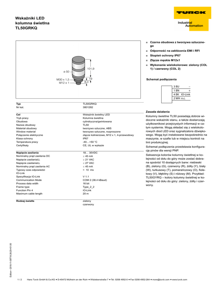Wskaźniki LED kolumna świetlna TL50GRKQ ■ Czarna obudowa z tworzywa sztucznego ■ Odporność na zakłócenia EMI i RFI ■ Stopień ochrony IP67 ■ Złącze męskie M12x1 ■ Wykonanie wielokolorowe: zielony (COL 1) / czerwony (COL 2) Schemat podłączenia Typ Nr kat. TL50GRKQ 3801282 Cel Tryb pracy Obudowa Nazwa obudowy Materiał obudowy Window material Połączenie elektryczne Klasa ochrony Temperatura pracy Certyfikaty Wskaźnik świetlny LED Kolumna świetlna cylindryczna/gwintowana TL50 tworzywo sztuczne, ABS tworzywo sztuczne, rozproszone złącze kołnierzowe, M12 x 1, 4-przewodowy IP67 -40…+50 °C CE, UL w wykazie Napięcie zasilania Nominalny prąd zasilania DC Napięcie zasilaniaUB Napięcie zasilaniaUB Nominalny prąd zasilania AC Typowy czas odpowiedzi IO-Link Specyfikacja IO-Link Communication Mode Process data width Frame type Function Pin 4 Maximum cable length 18… 30VDC ð 45 mA ï 21 VAC ð 27 VAC ð 45 mA < 10 ms Rodzaj światła zielony czerwony Kolumny świetlne TL50 posiadają dobrze widoczne wskaźniki stanu, a także dostarczają użytkownikowi przejrzystych informacji w całym systemie. Mogą składać się z wielokolorowych diod LED oraz sygnalizatora dźwiękowego. Mogą być instalowane bezpośrednio na maszynie, w szafie lub w miejscu kontroli na linii produkcyjnej. Schemat podłączenia przedstawia konfigurację pinów dla wersji PNP. Sekwencja kolorów kolumny świetlnej w kolejności od dołu do góry może zostać dobrana spośród 10 dostępnych barw: niebieski (B), zielony (G), czerwony (R), żółty (Y), biały (W), turkusowy (T), pomarańczowy (O), fioletowy (V), błękitny (S) i różowy (M). Przykład: TL50GYRQ – kolory kolumny świetlnej w kolejności od dołu do góry: zielony, żółty i czerwony. Edition • 2016-11-09T18:26:25+01:00 V 1.1 COM 2 (38.4 kBaud) 16 bit Type_2_2 IO-Link 20 m Zasada działania 1/2 Hans Turck GmbH & Co.KG ñ D-45472 Mülheim an der Ruhr ñ Witzlebenstraße 7 ñ Tel. 0208 4952-0 ñ Fax 0208 4952-264 ñ [email protected] ñ www.turck.com Wskaźniki LED kolumna świetlna TL50GRKQ Akcesoria montażowe Typ Nr kat. SMB30A 3032723 Rysunek wymiarowy Uchwyt montażowy, prostopadłościenny, stal nierdzewna, dla czujników z gwintem 30mm SMB30FA 3074005 Montagewinkel; Werkstoff VA 1.4401 SMB30SC 3052521 Uchwyt montażowy, czarny PBT, dla czujników z gwintem 30 Edition • 2016-11-09T18:26:25+01:00 mm, obrotowy 2/2 Hans Turck GmbH & Co.KG ñ D-45472 Mülheim an der Ruhr ñ Witzlebenstraße 7 ñ Tel. 0208 4952-0 ñ Fax 0208 4952-264 ñ [email protected] ñ www.turck.com