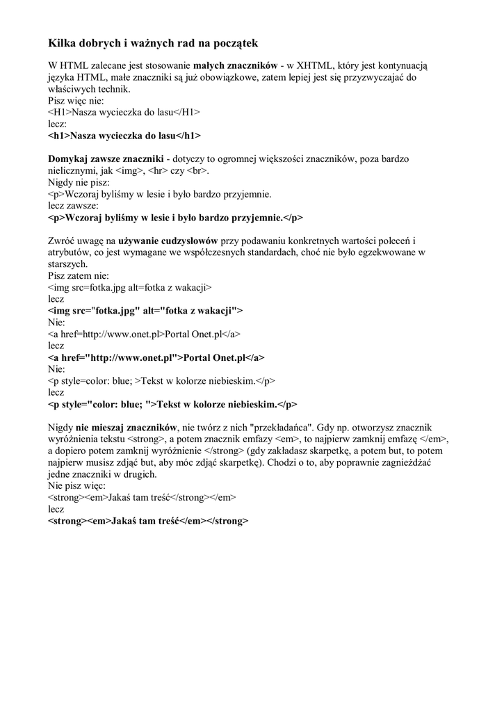 Kilka dobrych i ważnych rad na początek W HTML zalecane jest stosowanie małych znaczników - w XHTML, który jest kontynuacją języka HTML, małe znaczniki są już obowiązkowe, zatem lepiej jest się przyzwyczajać do właściwych technik. Pisz więc nie: <H1>Nasza wycieczka do lasu</H1> lecz: <h1>Nasza wycieczka do lasu</h1> Domykaj zawsze znaczniki - dotyczy to ogromnej większości znaczników, poza bardzo nielicznymi, jak <img>, <hr> czy <br>. Nigdy nie pisz: <p>Wczoraj byliśmy w lesie i było bardzo przyjemnie. lecz zawsze: <p>Wczoraj byliśmy w lesie i było bardzo przyjemnie.</p> Zwróć uwagę na używanie cudzysłowów przy podawaniu konkretnych wartości poleceń i atrybutów, co jest wymagane we współczesnych standardach, choć nie było egzekwowane w starszych. Pisz zatem nie: <img src=fotka.jpg alt=fotka z wakacji> lecz <img src="fotka.jpg" alt="fotka z wakacji"> Nie: <a href=http://www.onet.pl>Portal Onet.pl</a> lecz <a href="http://www.onet.pl">Portal Onet.pl</a> Nie: <p style=color: blue; >Tekst w kolorze niebieskim.</p> lecz <p style="color: blue; ">Tekst w kolorze niebieskim.</p> Nigdy nie mieszaj znaczników, nie twórz z nich "przekładańca". Gdy np. otworzysz znacznik wyróżnienia tekstu <strong>, a potem znacznik emfazy <em>, to najpierw zamknij emfazę </em>, a dopiero potem zamknij wyróżnienie </strong> (gdy zakładasz skarpetkę, a potem but, to potem najpierw musisz zdjąć but, aby móc zdjąć skarpetkę). Chodzi o to, aby poprawnie zagnieżdżać jedne znaczniki w drugich. Nie pisz więc: <strong><em>Jakaś tam treść</strong></em> lecz <strong><em>Jakaś tam treść</em></strong> Kaskadowe arkusze stylów Kaskadowe arkusze stylów (CSS - Cascading Style Sheets) są nieodłącznym towarzyszem współczesnej wersji języka HTML. Język HTML odpowiada za strukturę tworzonej witryny internetowej i poszczególnych dokumentów (ich stronę semantyczną) Język CSS odpowiada za wizualną prezentację stron internetowych w przeglądarkach Można wprawdzie stworzyć witrynę, używając jedynie czystego HTML, jednak będzie to witryna prosta i mało atrakcyjna. Style pomogą znacznie ją wzbogacić, dlatego ich znajomość jest dzisiaj po prostu niezbędna. Ponadto stosowanie stylów oszczędza wiele pracy koniecznej dawniej do sformatowania dokumentów za pomocą tradycyjnych technik - nierzadko zmiana jednego drobnego parametru w arkuszu stylów pozwala zmienić wygląd całej witryny! Dlaczego style są ważne Języki służące do budowy stron WWW (zarówno HTML, jak i jego bezpośredni następca, czyli XHTML) zostały uzupełnione o potężne narzędzie do formatowania dokumentów internetowych kaskadowe arkusze stylów. Jest to rewolucyjna idea, w zasadniczy sposób zwiększająca elastyczność narzędzi i możliwości autorów stron. Warto zauważyć, że style leżą także u podstaw dynamicznego HTML. Style, zwłaszcza na najczęściej stosowanym poziomie CSS1, są niezbyt skomplikowane w konstrukcji, dając zarazem zaawansowane możliwości manipulowania postacią dokumentów, jakich brakowało w tradycyjnym języku HTML. Umiejętne stosowanie stylów pozwala całkowicie odmienić wygląd strony, nie szkodząc zarazem przeglądarkom, które stylów nie interpretują. Styl, będący zespołem kodów formatujących (jednego czy kilku), pozwala obecnie globalnie lub lokalnie zmieniać sposób formatowania wybranego fragmentu dokumentu. Do zalet stosowania CSS można zaliczyć: oddzielenie struktury witryny od jej prezentacji, co ułatwia jej tworzenie i utrzymywanie dużo większe możliwości formatowania za pomocą stylów niż za pomocą znaczników i ich atrybutów znaczące zmniejszenie ilości kodu użytego do wizualizacji łatwość manipulowania całymi kompleksami stron łatwość ujednolicenia wyglądu dokumentów opartych na tym samym arkuszu stylów Na marginesie uwaga: jest niemal pewne, że podstawowe sposoby formatowania z HTML zawsze będą interpretowane, gdyż miliony dokumentów w WWW są formatowane za pomocą klasycznego HTML i konieczne by było ich przetworzenie, zgodnie ze specyfikacją stylów - raczej nie jest to możliwe, więc konieczność zgodności "w dół" spowoduje, że te zaszłości będą zawsze honorowane przez przeglądarki. Uwaga: Przeglądarki internetowe implementują interpretację stylów stopniowo, więc przy kolejnych aktualizacjach przeglądarek można się spodziewać następnych poprawek. Trzeba jednak podkreślić, że w interpretacja w najnowszych wersjach przeglądarek jest już bardzo zaawansowana. Ramy dokumentu Wszystkie polecenia powinny się znaleźć w pewnych standardowych ramach. Zostało przyjęte, że dokument HTML zawiera szkielet, który stanowi osnowę dla wszystkich innych poleceń. Spotyka się wprawdzie w Internecie strony, które szkieletu nie zawierają (czasem tylko jego część), ale odradzamy taką praktykę, gdyż w pewnych okolicznościach może ona zaowocować niespodziewanymi efektami. Cały dokument powinien być objęty parą znaczników <html> </html>. Między nimi powinna zaś się znaleźć para znaczników <head> </head>, która stanowi ramy dla informacji nagłówkowych. Pozostałe informacje powinny być objęte z kolei znacznikami <body> </body>. <html> <head> informacje nagłówkowe </head> <body> właściwa treść (ciało) dokumentu </body> </html> Tak spreparowany szkielet jest już "bezpieczny" i nie niesie ze sobą ryzyka jakichś niespodzianek. Warto jeszcze dodać kilka użytecznych informacji. <head> <title>Kurs języka HTML - poradnik webmastera: HTML dla bardzo początkujących</title> </head> Title - zawarta między tymi znacznikami treść ukaże się w pasku tytułowym przeglądarki. Ważne: polecenie title powinno być umieszczone zaraz za otwierającym znacznikiem head, jeszcze PRZED wszystkimi informacjami meta. Drugim bardzo ważnym elementem jest informacja stronie kodowej dokumentu. Powinniśmy stosować przede wszystkim standard kodowania