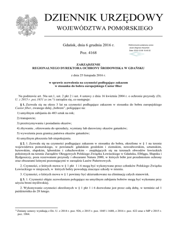 DZIENNIK URZĘDOWY WOJEWÓDZTWA POMORSKIEGO Gdańsk, dnia 6 grudnia 2016 r. Elektronicznie podpisany przez: Jacek Zbigniew Karpiński Poz. 4168 Data: 2016-12-06 10:45:32 ZARZĄDZENIE REGIONALNEGO DYREKTORA OCHRONY ŚRODOWISKA W GDAŃSKU z dnia 25 listopada 2016 r. w sprawie zezwolenia na czynności podlegające zakazom w stosunku do bobra europejskiego Castor fiber Na podstawie art. 56a ust.1, ust. 2 pkt 2 i ust. 4 ustawy z dnia 16 kwietnia 2004 r. o ochronie przyrody (Dz. U. z 2015 r. poz.1651 ze zm.1)) zarządza się, co następuje: § 1. Zezwala się na okres 3 lat na czynności podlegające zakazom w stosunku do bobra europejskiego Castor fiber, zwanego dalej „bobrem”, polegające na: 1) umyślnym zabijaniu do 483 sztuk na rok; 2) transporcie; 3) przetrzymywaniu i posiadaniu okazów; 4) zbywaniu , oferowaniu do sprzedaży, wymiany lub darowizny okazów gatunków; 5) wywożenia poza granicę państwa okazów gatunków; 6) umyślnym płoszeniu lub niepokojeniu. § 2. 1. Zezwala się na czynności podlegające zakazom w stosunku do bobra, określone w § 1 na terenie województwa pomorskiego, w powiatach: gdańskim grodzkim i ziemskim, nowodworskim, sztumskim, bytowskim, słupskim, lęborskim i człuchowskim - znajdujących się na terenach obwodów łowieckich położonych na terenie Zarządów Okręgowych Polskiego Związku Łowieckiego w Gdańsku, Elblągu, Słupsku i Bydgoszczy, poza rezerwatami przyrody i obszarami Natura 2000, w których bóbr jest przedmiotem ochrony oraz obszarami leśnymi pozostającymi w zarządzie Lasów Państwowych. 2. Czynności, o których mowa w § 1 pkt 1 i 6 mogą być wykonywane przez członków Polskiego Związku Łowieckiego w miejscach, w których bobry powodują znaczące szkody w mieniu. 3. Czynności, o których mowa w § 1 powinny być ukierunkowane na eliminację całych stanowisk. § 3. 1. Czynności objęte zezwoleniem polegające na umyślnym zabijaniu bobrów mogą być wykonane przy użyciu broni myśliwskiej. 2. Wykonywanie czynności określonych w § 1 pkt 1 i 6 dozwolone jest przez całą dobę, w terminie od 1 października do 28 lutego. 1) Zmiany ustawy wynikają z Dz. U. z 2014 r. poz. 926, z 2015 r. poz. 1045 i 1688, z 2016 r. poz. 422 oraz z MP z 2015 r. poz. 1064. Dziennik Urzędowy Województwa Pomorskiego –2– Poz. 4168 § 4. 1. Jako podmiot wykonujący czynności, o których mowa w § 1, wskazuje się Zarządy Okręgowe Polskiego Związku Łowieckiego w Gdańsku, Elblągu, Słupsku i Bydgoszczy, które będą je wykonywać przez przeszkolonych w tym zakresie myśliwych członków Kół Łowieckich, za zgodą dzierżawcy lub zarządcy obwodu łowieckiego. 2. Dzierżawca lub zarządca obwodu łowieckiego upoważnia na swoim terenie przeszkolonych myśliwych do dokonania czynności, o których mowa w § 1. 3. Uprawnieni myśliwi wymienieni w ust. 1, wykonujący czynność, o której mowa w § 1 pkt 1, winni posiadać wiedzę z zakresu biologii bobra oraz zasad postępowania przy ograniczaniu liczebności bobrów. 4. Wykaz powiatów oraz gmin, na terenie których zezwala się na czynności podlegające zakazom wraz z przypisanymi numerami i nazwami obwodów łowieckich i liczbą bobrów do odstrzału w ciągu jednego roku, określa załącznik do zarządzenia. § 5. 1. W terminie do dnia 15 stycznia każdego roku następującego po wejściu w życie zarządzenia, Zarządy Okręgowe Polskiego Związku Łowieckiego obowiązane są do złożenia Regionalnemu Dyrektorowi Ochrony Środowiska w Gdańsku pisemnej informacji o wykonaniu czynności określonych w zarządzeniu w roku poprzednim. 2. Informacja, o której mowa w ust. 1, powinna zawierać następujące dane: numer obwodu łowieckiego, datę pozyskania oraz liczbę odstrzelonych bobrów, a także możliwie dokładną lokalizację miejsc eliminacji poszczególnych osobników. § 6. Regionalny Dyrektor Ochrony Środowiska w Gdańsku dokonuje kontroli spełniania warunków określonych w zarządzeniu. § 7. Zarządzenie wchodzi w życie po upływie 14 dni od dnia ogłoszenia. Regionalny Dyrektor Ochrony Środowiska w Gdańsku Danuta Makowska Dziennik Urzędowy Województwa Pomorskiego –3– Poz. 4168 Załącznik do zarządzenia Regionalnego Dyrektora Ochrony Środowiska w Gdańsku z dnia 25 listopada 2016 r. Wykaz powiatów oraz gmin, na terenie których zezwala się na czynności podlegające zakazom wraz z przypisanymi numerami i nazwami obwodów łowieckich i liczbą bobrów do odstrzału w ciągu jednego roku. Liczba bobrów do odstrzału Nr obwodu łowieckiego i nazwa L.p. Gmina, powiat w ciągu jednego koła łowieckiego roku (szt.) powiat gdański grodzki i gdański ziemski 1. 2. 3. 4. 5. 6. m. Gdańsk, Pruszcz Gdański, powiat gdański grodzki i gdański ziemski m. Gdańsk, Pruszcz Gdański, Cedry Wielkie, powiat gdański grodzki i gdański ziemski Suchy Dąb, Pruszcz Gdański, powiat gdański ziemski Cedry Wielkie, powiat gdański ziemski Cedry Wielkie powiat gdański ziemski Pruszcz Gdański, Cedry Wielkie, powiat gdański ziemski 4 114 „Cyranka” 130 Nr 1 Gdynia 115 „Bekas” 4 137 WKŁ 209 „Bóbr” 4 4 8 114 „Cyranka” 130 Nr 1 Gdynia 130 Nr 1 Gdynia 136 „Hodowca” 113 „Ogar” 4 28 powiat nowodworski 7. Nowy Dwór Gdański i Stegna 12 128 „Raróg” Gdańsk 8. Nowy Dwór Gdański 8 127 „Żuławy” Nowy Dwór 24 127 „Żuławy” Nowy Dwór 20 134 „Żuraw” Nowy Dwór 4 111 „Sokół Nr 7” Gdańsk 12 111 „Sokół Nr 7” Gdańsk 12 111 „Sokół Nr 7” Gdańsk 12 128 „Raróg” Gdańsk 12 128 „Raróg” Gdańsk 9. 10. 11. 12. 13. 14. 15. 16. Nowy Dwór Gdański i Stegna Nowy Dwór Gdański, Stegna, Nowy Staw, pow. nowodworski i malborski Sztutowo Sztutowo Sztutowo i Stegna Sztutowo Sztutowo Stare Pole 183 „Rogacz” Malbork 34 152 Dziennik Urzędowy Województwa Pomorskiego L.p. Gmina, powiat –4– Liczba bobrów do odstrzału w ciągu jednego roku (szt.) powiat Poz. 4168 Nr obwodu łowieckiego i nazwa koła łowieckieg