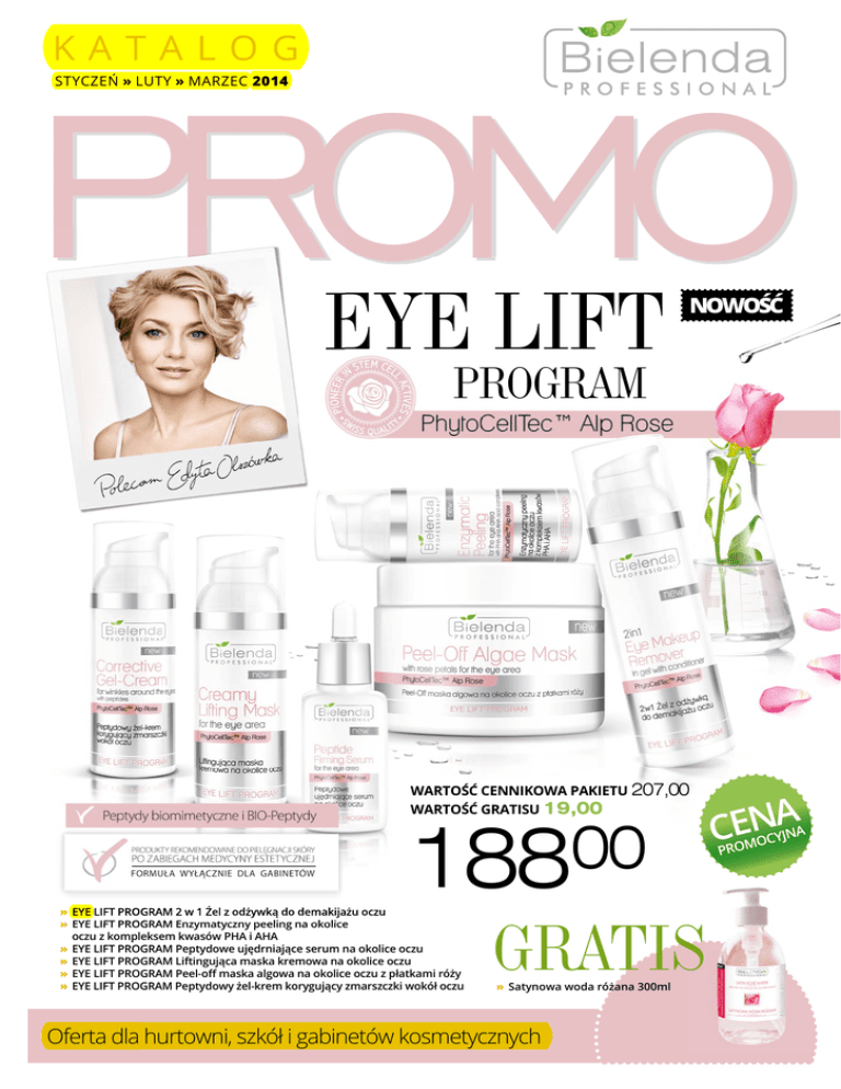 KATALOG STYCZEŃ » LUTY » MARZEC 2014 EYE LIFT NOWOŚĆ PROGRAM WARTOŚĆ CENNIKOWA PAKIETU 207,00 WARTOŚĆ GRATISU 19,00 00 188 » EYE LIFT PROGRAM 2 w 1 Żel z odżywką do demakijażu oczu » EYE LIFT PROGRAM Enzymatyczny peeling na okolice oczu z kompleksem kwasów PHA i AHA » EYE LIFT PROGRAM Peptydowe ujędrniające serum na okolice oczu » EYE LIFT PROGRAM Liftingująca maska kremowa na okolice oczu » EYE LIFT PROGRAM Peel-off maska algowa na okolice oczu z płatkami róży » EYE LIFT PROGRAM Peptydowy żel-krem korygujący zmarszczki wokół oczu GRATIS » Satynowa woda różana 300ml Oferta dla hurtowni, szkół i gabinetów kosmetycznych CENA NA OCYJ M O PR STYCZEŃ » LUTY » MARZEC 2014 BIELENDA PROFESSIONAL KATALOG PROMO Kosmetyczka Roku 2013 wybrana Bielenda Professional wybrała najlepszych ekspertów profesjonalnej pielęgnacji w Polsce. Zwyciężczynią pierwszej edycji ogólnopolskiego konkursu Kosmetyczka Roku 2013, skierowanego do wszystkich kosmetyczek i specjalistów kosmetologii, została Pani Ewa Wasiak. W nagrodę otrzymała prestiżowy tytuł i kryształową statuetkę Kosmetyczki Roku 2013, samochód osobowy oraz wyjątkowy zestaw preparatów Bielenda Professional. że źródłem jej wiedzy i sposobem doskonalenia umiejętności jest stałe inspirowanie się różnymi dziedzinami nauki – od biologii, poprzez anatomię, fizjologię czy dietetykę, po fizjoterapię. Od kilku lat dzieli się swoim doświadczeniem prowadząc eksperckiego bloga, na którym zamieszcza kosmetyczne porady, odpowiada na pytania w zakresie pielęgnacji i testuje kosmetyki. W finale konkursu, który 24-25 listopada odbył się w Krakowie, zwyciężczyni zaprezentowała doskonałe przygotowanie merytoryczne, mistrzowski warsztat oraz najwyższy poziom dbałości o potrzeby pielęgnacyjne i komfort klienta. Wyróżniła się przy tym ogromnym talentem oraz pasją do zawodu, a także profesjonalną realizacją finałowego zadania konkursowego. Pani Ewa- Kosmetyczka Roku 2013 prowadzi własny gabinet kosmetyczny Uroda i Styl w Łodzi. Podkreśla, Najlepsza dziesiątka profesjonalistów została wyłoniona w internetowym teście wiedzy kosmetologicznej oraz wzięła udział w finale konkursu w Instytucie Bielenda Professional w Krakowie. Rywalizację finalistów oceniało jury w składzie: Barbara Kozioł – kierownik Laboratorium Badawczego Bielenda Professional, Karolina Przewlekła – product manager ds. kosmetyki profesjonalnej Bielenda Professional, Ewa Cesarz – redaktor naczelna Art of Beauty oraz Ilona Kurczaba - redaktor naczelna Les Nouvelles Esthétiques & Spa. Poziom jaki prezentowała finałowa dziesiątka był bardzo wysoki, dlatego wybór który należał do jury nie był prosty. Zadaniem uczestników finału było przeprowadzenie określonej, pełnej procedury zabiegowej z uwzględnieniem kondycji skóry i potrzeb klienta. Na zdjęciu zdobywczyni II miejsca Natalia Maśnik. Na zdjęciu zdobywca III miejsca Łukasz Czerniewski. Na zdjęciu od lewej: Jacek Bielenda, Wiceprezes firmy Bielenda, Ewa Wasiak, Kosmetyczka Roku 2013, Edyta Olszówka – Ambasadorka marki oraz Magda Steczkowska 2 STYCZEŃ » LUTY » MARZEC 2014 BIELENDA PROFESSIONAL KATALOG PROMO Na zdjęciu zdobywczyni wyróżnienia internautów, Emilia Rechul. Na zdjeciu finalowa dziesiątka konkursu, Jury, Jacek Bielenda, Wiceprezes firmy Bielenda oraz Edyta Olszówka – Ambasadorka marki Kosmetyczka Roku to unikalna inicjatywa na polskim rynku kosmetycznym. Ideą konkursu jest docenienie profesjonalistów za ich wiedzę i umiejętności. Chcemy, by zwyciężczyni w najlepszy sposób promowała pozytywny wizerunek kosmetyczki w Polsce oraz reprezentowała grono docenianych przez Polki ekspertów profesjonalnej pielęgnacji – podkreśla Jacek Bielenda, Wiceprezes firmy Bielenda Kosmetyki Naturalne, Dyrektor Zarządzający Bielenda Professional. basadorka firmy Bielenda - Edyta Olszówka. Wśród zaproszonych gości znalazła się m.in. Rozalia Mancewicz, Magda Steczkowska natomiast wieczór uświetnił koncert Ady Szulc. Gratulujemy Pani Natalii Maśnik, która zdobyła II miejsce w konkursie oraz Panu Łukaszowi Czerniewskiemu, zdobywcy III miejsca. Na gratulacje zasługuje także Pani Emilia Rechul, która zdobyła wyróżnienie przyznane przez fanów profilu Bielenda Professional na Facebooku. Wszystkim finalistom gratulujemy znalezienia się w tej wyjątkowej, pierwszej dziesiątce konkursu Kosmetyczka Roku 2013 i życzymy nieustannej satysfakcji z wykonywanej pracy Kosmetologa oraz rozwijania swojej pasji na co dzień. Gala konkursu Kosmetyczka Roku 2013 odbyła się w Sali Lustrzanej Grand Hotelu w Krakowie. Poprowadził ją Olivier Janiak, natomiast gościem specjalnym wydarzenia była Am- Targowy sezon jesienno-zimowy zakończony Warszawa–Gdańsk– Kraków–Moskwa Jesień jak co roku obfitowała w różne imprezy branżowe, na których oczywiście nie mogło zabraknąć marki Bielenda Professional. Zaczęliśmy od targów Beauty Forum& SPA w Warszawie a potem Salon Jesień, podczas których zaprezentowaliśmy najnowszy zabieg nawilżający na twarz AQUA PORIN ULTRA EFFECT. Produkty z tej linii zostały bardzo dobrze przyjęte na rynku przez profesjonalistów o czym świadczy nagroda Targów URODA w Gdańsku – Medal Mercurius Gedanensis,, jaką została uhonorowana cała seria. Ważnym wydarzeniem dla firmy był także Kongres i targi LNE&SPA w Krakowie,, gdzie podczas pokazów premierowych zaprezentowaliśmy nasz najnowszy zabieg na okolice oczu – EYE LIFT PROGRAM oraz produkty w nowych opakowaniach oraz nowej szacie graficznej. Ostanie targi w jakich uczestniczyliśmy w tym roku to INTERCHARM MOSKWA w Rosji.. To największa impreza wystawiennicza w tej części świata. Targi odwiedziło ponad 30 000 odwiedzających z około 100 krajów. Było to inspirujące doświadczenie, które mamy nadzieję, zaowocuje ściślejszymi kontaktami na rynkach wschodnich. Targi LNE&SPA 3 STYCZEŃ » LUTY 