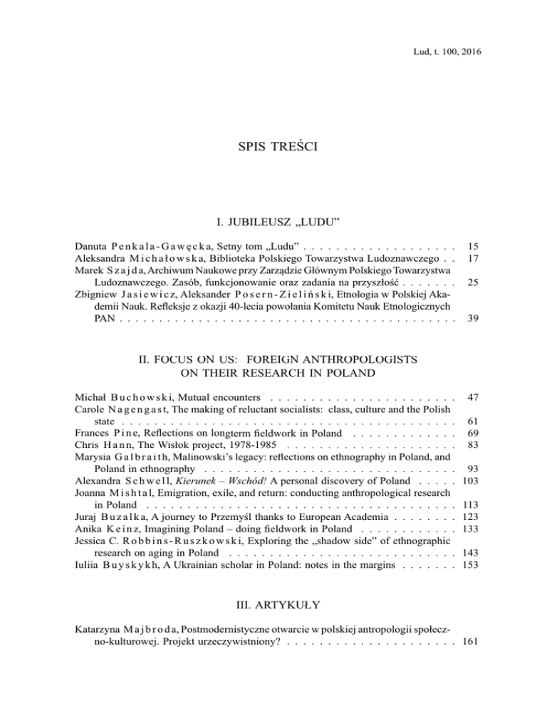 Lud, t. 100, 2016 SPIS TREŚCI I. JUBILEUSZ „LUDU” Danuta P e n k a l a - G a w ę c k a, Setny tom „Ludu” . . . . . . . . . . . . . . . . . . . Aleksandra M i c h a ł o w s k a, Biblioteka Polskiego Towarzystwa Ludoznawczego . . Marek S z a j d a, Archiwum Naukowe przy Zarządzie Głównym Polskiego Towarzystwa Ludoznawczego. Zasób, funkcjonowanie oraz zadania na przyszłość . . . . . . . Zbigniew J a s i e w i c z, Aleksander P o s e r n - Z i e l i ń s k i, Etnologia w Polskiej Akademii Nauk. Refleksje z okazji 40-lecia powołania Komitetu Nauk Etnologicznych PAN . . . . . . . . . . . . . . . . . . . . . . . . . . . . . . . . . . . . . . . . . . . 15 17 25 39 II. FOCUS ON US: FOREIGN ANTHROPOLOGISTS ON THEIR RESEARCH IN POLAND Michał B u c h o w s k i, Mutual encounters . . . . . . . . . . . . . . . . . . . . . . . Carole N a g e n g a s t, The making of reluctant socialists: class, culture and the Polish state . . . . . . . . . . . . . . . . . . . . . . . . . . . . . . . . . . . . . . . . . Frances P i n e, Reflections on longterm fieldwork in Poland . . . . . . . . . . . . . Chris H a n n, The Wisłok project, 1978-1985 . . . . . . . . . . . . . . . . . . . . . Marysia G a l b r a i t h, Malinowski’s legacy: reflections on ethnography in Poland, and Poland in ethnography . . . . . . . . . . . . . . . . . . . . . . . . . . . . . . . Alexandra S c h w e l l, Kierunek – Wschód! A personal discovery of Poland . . . . . Joanna M i s h t a l, Emigration, exile, and return: conducting anthropological research in Poland . . . . . . . . . . . . . . . . . . . . . . . . . . . . . . . . . . . . . . Juraj B u z a l k a, A journey to Przemyśl thanks to European Academia . . . . . . . . Anika K e i n z, Imagining Poland – doing fieldwork in Poland . . . . . . . . . . . . Jessica C. R o b b i n s - R u s z k o w s k i, Exploring the „shadow side” of ethnographic research on aging in Poland . . . . . . . . . . . . . . . . . . . . . . . . . . . . Iuliia B u y s k y k h, A Ukrainian scholar in Poland: notes in the margins . . . . . . . 47 61 69 83 93 103 113 123 133 143 153 III. ARTYKUŁY Katarzyna M a j b r o d a, Postmodernistyczne otwarcie w polskiej antropologii społeczno-kulturowej. Projekt urzeczywistniony? . . . . . . . . . . . . . . . . . . . . . 161 8 Magdalena K o z h e v n i k o v a, Człowieko-zwierzęce hybrydy i chimery w nauce. Historia i współczesność . . . . . . . . . . . . . . . . . . . . . . . . . . . . . . 185 Jacek N o w a k, Żydowscy sąsiedzi. O więziach społecznych w pamięci mieszkańców południowej Polski . . . . . . . . . . . . . . . . . . . . . . . . . . . . . . . . . 209 Magdalena Z a t o r s k a, Lokalne interpretacje pielgrzymek chasydzkich do Polski i na Ukrainę (Lelów, Leżajsk, Humań) . . . . . . . . . . . . . . . . . . . . . . . 233 IV. KOMUNIKATY Agata Agnieszka K o n c z a l, Korniki, świerki, leśnicy i ekolodzy. Spór o Puszczę Białowieską jako konflikt odmiennych wizji natury . . . . . . . . . . . . . . . . 257 Olga S o l a r z, Przedstawienia węża na cmentarzach pogranicza polsko-ukraińskiego . . 267 V. ROZMOWY I WSPOMNIENIA Dziennik czynności Zofii Cieślanki (oprac. Maria Zachorowska i Andrzej Rataj; wprow. Roman Reinfuss) . . . . . . . . . . . . . . . . . . . . . . . . . . . . . . 277 VI. RECENZJE I NOTY RECENZYJNE Grażyna K u b i c a, Maria Czaplicka: płeć, szamanizm, rasa. Biografia antropologiczna, Kraków: Wydawnictwo Uniwersytetu Jagiellońskiego 2015 (Zbigniew Jasiewicz) z . . Małgorzata M a j (red.), Antropologia i etnologia w czasie wojny. Działalność Sektion Rassen- und Volkstumsforschung Institut für Deutsche Ostarbeit, Krakau 1940-1944, w świetle nowych materiałów źródłowych, Kraków: Wydawnictwo Uniwersytetu Jagiellońskiego 2015 (Filip ( Wróblewski) . . . . . . . . . . . . . . Christopher P i n n e y, Photography and Anthropology, London: Reaktion Books 2011 ((Filip Wróblewski) . . . . . . . . . . . . . . . . . . . . . . . . . . . . . . . . . Inga B. K u ź m a, Domy bezdomnych. Badania sytuacji kryzysowych, Łódź: Wydawnictwo Uniwersytetu Łódzkiego 2015 (Adam ( Pomieciński) . . . . . . . . . . . . Hubert W i e r c i ń s k i, Rak. Antropologiczne studium praktyk i narracji, Warszawa: Wydawnictwa Uniwersytetu Warszawskiego 2015 ((Anna Witeska-Młynarczykk) . . Rastislava S t o l i č n á - M i k o l a j o v á, Socializmus na tanieri. Možnosti a praktyki stravovania obyvateľov Slovenska v rokoch 1948-1989, Bratislava: VEDA 2015 (Zygmunt Kłodnicki) . . . . . . . . . . . . . . . . . . . . . . . . . . . . . . . . Jaroslav M a l i n a, Anti-encyklopedie anti-antropologie. A-Ž, Brno: Akademické nakladatelstvi CERM 2013 (Waldemar Kuligowski) . . . . . . . . . . . . . . . . Waldemar M a j c h e r (red.), Nasze dziedzictwo kulturowe, cz. 1: Warmia, Mazury, Olsztyn: Fundacja Dziedzictwo Nasze 2014 (Anna ( Szyfer) . . . . . . . . . . . . Dobrosława W ę ż o w i c z - Z i ó ł k o w s k a, Emilia W i e c z o r k o w s k a (red.), Kalina J a g l a r z (współpraca red.), Wilki i ludzie. Małe kompendium wilkologii, Katowice: grupa kulturalna.pl 2014 (Iwona ( Rzepnikowska) . . . . . . . . . . . . 305 312 316 319 323 327 330 332 334 9 VII. KRONIKA 92. Walne Zgromadzenie Delegatów Polskiego Towarzystwa Ludoznawczego, Wrocław, 23 września 2016 (Mariola Tymochowicz) . . . . . . . . . . . . . . . . . . Sprawozdanie z działalności Zarządu Głównego Polskiego Towarzystwa Ludoznawczego za okres od września 2015 do sierpnia 2016 roku ((Piotr Grochowski) . . Posiedzenie Komitetu Nauk Etnologicznych PAN inaugurujące kadencję 2016-2019, Warszawa, 4 lutego 2016 ((Aleksander Posern-Zieliński) . . . . . . . . . . . . . Posiedzenie plenarne Komitetu Nauk Etnologicznych PAN, Kraków, 21 kwietnia 2016 (Irena ( Kabat) . . . . . . . . . . . . . . . . . . . . . . . . . . . . . . . . . Konferencja „Jaka refleksja o kulturze jest dzisiaj potrzebna Europie? Wyzwania, dylematy, perspektywy”,