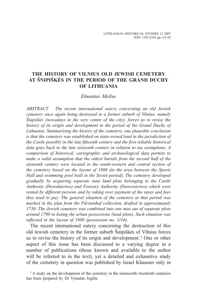 Lithuanian historical studies 12 2007 ISSN 1392-2343 pp. 63–92 The History of Vilnius Old Jewish Cemetery at Šnipiškės in the Period of the Grand Duchy of Lithuania Elmantas Meilus Abstract The recent international outcry concerning an old Jewish cemetery once again being destroyed in a former suburb of Vilnius, namely Šnipiškės (nowadays in the very centre of the city), forces us to revise the history of its origin and development in the period of the Grand Duchy of Lithuania. Summarizing the history of the cemetery, one plausible conclusion is that the cemetery was established on state-owned land in the jurisdiction of the Castle possibly in the late fifteenth century and the first reliable historical data goes back to the late sixteenth century in relation to tax exemptions. A comparison of historical, cartographic and archaeological data permits to make a valid assumption that the oldest burials from the second half of the sixteenth century were located in the south-western and central section of the cemetery based on the layout of 1808 (in the area between the Sports Hall and swimming pool built in the Soviet period). The cemetery developed gradually by acquiring separate state land plots belonging to the Castle Authority (Horodnictwo) and Forestry Authority (Derewnictwo) which were rented by different persons and by taking over payment of the taxes and fees they used to pay. The general situation of the cemetery at that period was marked in the plan from the Fürstenhof collection, drafted in approximately 1730. The Jewish cemetery was combined into one mas out of separate plots around 1790 in listing the urban possessions (land plots). Such situation was reflected in the layout of 1808 (possession no. 1116). The recent international outcry concerning the destruction of this old Jewish cemetery in the former suburb Šnipiškės of Vilnius forces us to revise the history of its origin and development. 1 One or other aspect of this issue has been discussed to a varying degree in a number of publications (those known and available to the author will be referred to in the text), yet a detailed and exhaustive study of the cemetery in question was published by Israel Klausner only in 1 A study on the development of the cemetery in the nineteenth–twentieth centuries has been prepared by Dr Vytautas Jogėla. 64 Elmantas Meilus 1935. 2 Referring to the sources available in Vilnius at that time, the said author prepared a substantial study on the development of the cemetery, burials and the most significant people buried there. For the present article the archival records used by Klausner and some new sources located in Vilnius (e.g. the Lithuanian Metrica which at that time was unavailable to Klausner) have been reviewed and every source has yielded new material which will be provided in footnotes in great detail in the way it is written in the source along with the sources used by the said author and his study itself. The exact date when the old Vilnius Jewish cemetery was es tablished is not known. A number of encyclopaedias and sources on the subject refer to 1487 (in some instances to 1477), 3 but this date has not been substantiated yet by any sources, although some authors refer to this date and even believe that it proves existence of the Jewish community in the town. 4 Sometimes it is noted that 2 I. Klausner, Dzieje starego cmentarza żydowskiego w Wilnie (Vilnius, 1935) (in Hebrew, a manuscript translation into Lithuanian of a part of the book made by L. Lempertienė and a Polish abstract of the book have been used), p. I; W. M., review of Klausner, Dzieje starego cmentarza żydowskiego w Wilnie, Ateneum Wileńskie, Rocz. 11, 1936, pp. 630–631; thanks to the unpublished paper by Prof. David Fishman who kindly allowed the author to read his work (Historical Overview of the Jewish Cemetery in Shnipishok), I learned that the study by Klausner was reprinted in Jerusalem in 1972. 3 Klausner, Dzieje, pp. 3–5; Jüdisches Lexikon, Ein enzyklopädisches Handbuch des jüdischen Wissens in vier Bänden, begründet von Dr. G. Herlitz und Dr. B. Kirschner, Band IV/2, p. 1439; Lite, 1 Bd., eds. M. Sudorski, U. Ka renellnbogen (New York, 1951), p. 1135; Еvreiskaia entsiklopedia, vol. 5 (St Peterburg, 1909), pp. 573, 590–591; Jerusalem of Lithuania, Illustrated and documented. Collected and arranged by Leyzer Ran, Vol. I (New York, 1974), p. 100; E. Małachowicz, Wilno. Dzieje, architektura, cmentarze (Wrocław, 1996), pp. 184, 459; ‘Vilnius (in Yiddish Vilne) made the Lithuanian Jews particularly famous in the world. Jews came to live here rather late in comparison with other towns, only in the second half of the sixteenth century. Admittedly, one document is often referred to which supposedly says that the Jewish cemetery was located there already in 1487. However, the document has not survived and its information cannot be proved, whereas the existing knowledge of the laws and customs of that time lead us to believe that such information is not correct. The Jews living in Vilnius were first mentioned in a document dated 1567. Yet at that time they had no right to buy houses, only to rent them; the Jews gained the right to buy buildings in Vilnius only in 1593’, see: ‘Žydai Lietuvoje’, (in: http://litvakai.mch. mii.lt// [accessed on 20 Apr. 2009]. 4 D. Blažytė, ’Vilniaus magistratas ir žydų bendruomenė XVIII amžiuje’, Vilniaus Gaonas ir žydų kultūros keliai, Tarptautinės mokslinės konferencijos medžiaga (Vilnius, 1999), pp. 293–299, reprinted in Vilniaus miesto istorijos skaitiniai, comp. by E. Manelis, R. Samavičius (Vilnius, 2001), pp. 134–137. History of Vilnius Old Jewish Cemetery at Šnipiškės 65 the first evidence of a community of Jews in Vilnius comes from 1568 when it was ordered to pay a poll tax 5. However, Sergei Bershadskii critically reviewed earlier studies of this matter and on the basis of sources he expressed well-reasoned doubt