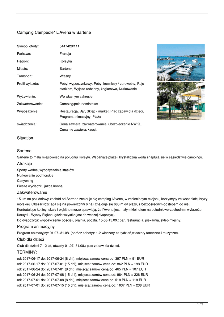 Campnig Campeole* L'Avena w Sartene Symbol oferty: 5447429/111 Państwo: Francja Region: Korsyka Miasto: Sartene Transport: Własny Profil wyjazdu: Pobyt wypoczynkowy, Pobyt leczniczy / zdrowotny, Rejs Wyżywienie: We własnym zakresie Zakwaterowanie: Camping/pole namiotowe Wyposażenie: Restauracja, Bar, Sklep - market, Plac zabaw dla dzieci, świadczenia: Cena zawiera: zakwaterowanie, ubezpieczenie NWKL. statkiem, Wyjazd rodzinny, żeglarstwo, Nurkowanie Program animacyjny, Plaża Cena nie zawiera: kaucji. Situation Sartene Sartene to mała miejsowość na południu Korsyki. Wspaniałe plaże i krystaliczna woda znajdują się w sąsiedztwie campingu. Atrakcje Sporty wodne, wypożyczalnia statków Nurkowanie podmorskie Canyoning Piesze wycieczki, jazda konna Zakwaterowanie 15 km na południowy-zachód od Sartene znajduje się camping l'Avena, w zacienionym miejscu, korzystący ze wspaniałej bryzy morskiej. Obszar rozciąga się na powierzchni 6 ha i znajduje się 600 m od plaży, z bezpośrednim dostępem do niej. Kontratujące kotliny, skały i błękitne morze sprawiają, że l'Avena jest małym klejnotem na południowo-zachodnim wybrzeżu Korsyki - Wyspy Piękna, gdzie wzystko jest do waszej dyspozycji. Do dyspozycji: wypożyczenie pościeli, pralnia, poczta. 15.06-15.09.: bar, restauracja, piekarnia, sklep mięsny. Program animacyjny Program animacyjny: 01.07.-31.08. (oprócz soboty): 1-2 wieczory na tydzień,wieczory taneczne i muzyczne. Club dla dzieci Club dla dzieci 7-12 lat, otwarty 01.07.-31.08.: plac zabaw dla dzieci. TERMINY: od: 2017-06-17 do: 2017-06-24 (8 dni), miejsca: zamów cena od: 397 PLN = 91 EUR od: 2017-06-17 do: 2017-07-01 (15 dni), miejsca: zamów cena od: 862 PLN = 198 EUR od: 2017-06-24 do: 2017-07-01 (8 dni), miejsca: zamów cena od: 465 PLN = 107 EUR od: 2017-06-24 do: 2017-07-08 (15 dni), miejsca: zamów cena od: 984 PLN = 226 EUR od: 2017-07-01 do: 2017-07-08 (8 dni), miejsca: zamów cena od: 519 PLN = 119 EUR od: 2017-07-01 do: 2017-07-15 (15 dni), miejsca: zamów cena od: 1037 PLN = 238 EUR 1/2 od: 2017-07-08 do: 2017-07-15 (8 dni), miejsca: zamów cena od: 519 PLN = 119 EUR od: 2017-07-08 do: 2017-07-22 (15 dni), miejsca: zamów cena od: 1053 PLN = 242 EUR od: 2017-07-15 do: 2017-07-22 (8 dni), miejsca: zamów cena od: 534 PLN = 123 EUR od: 2017-07-15 do: 2017-07-29 (15 dni), miejsca: zamów cena od: 1083 PLN = 248 EUR od: 2017-07-22 do: 2017-07-29 (8 dni), miejsca: zamów cena od: 549 PLN = 126 EUR od: 2017-07-22 do: 2017-08-05 (15 dni), miejsca: zamów cena od: 1098 PLN = 252 EUR od: 2017-07-29 do: 2017-08-05 (8 dni), miejsca: zamów cena od: 549 PLN = 126 EUR od: 2017-07-29 do: 2017-08-12 (15 dni), miejsca: zamów cena od: 1014 PLN = 233 EUR od: 2017-08-05 do: 2017-08-12 (8 dni), miejsca: zamów cena od: 465 PLN = 107 EUR od: 2017-08-05 do: 2017-08-19 (15 dni), miejsca: zamów cena od: 801 PLN = 184 EUR od: 2017-08-12 do: 2017-08-19 (8 dni), miejsca: zamów cena od: 336 PLN = 77 EUR CENNIK: Długość pobytu: 8 dni 8 dni 15 dni 8 dni 15 dni 8 dni 15 dni 15 dni 8 dni 15 dni 8 dni Grupa cenowa: F A A D D C C E E B B 924 448 896 952 476 798 399 1274 616 1232 1316 658 1120 560 Pobyt w obiekcie (do wyboru) (*) domek typu Bengali 4-osobowy standardowo dla osób: 4 280 336 672 462 domek typu Pagan 5-osobowy standardowo dla osób: 5 364 490 980 637 Ubezpieczenie (do wyboru) (*) ubezpieczenie NWKLSKI 7 Ubezpieczenie (opcjonalne) 7 ubezpieczenie od kosztów rezygnacji 2.4 % 2.4 % 14 7 14 7 14 14 7 14 7 2.4 % 2.4 % 2.4 % 2.4 % 2.4 % 2.4 % 2.4 % 2.4 % 2.4 % Waluta: EUR Aktualne ceny z systemu S.A.R.T. (-) - cena usługi, podatku kalkulowana przy osobie lub gratis (*) - kwota wliczona w cenę standardową 2/2
