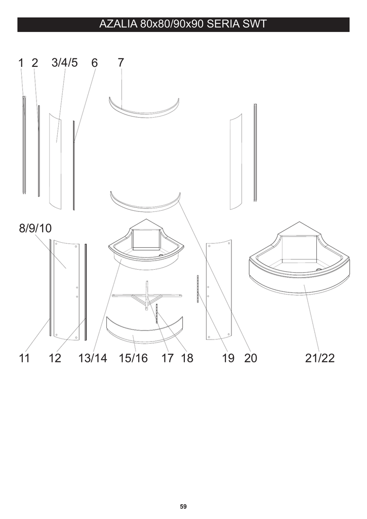 AZALIA 80x80/90x90 SERIA SWT 1 2 3/4/5 6 7 8/9/10 11 12 13/14 15/16 17 18 59 19 20 21/22 Azalia 80x80 numer symbol nazwa części grupa cenowa uwagi 1 201020026 profil ścienny I 2 104020039 uszczelka klinowa E 3 301010032 szyba stała - grafit L wymiary 1580 x 285, grubość szkła 5 4 301010033 szyba stała - brąz L wymiary 1580 x 285, grubość szkła 5 5 301010034 szyba stała - transparentna L wymiary 1580 x 285, grubość szkła 5 6 104020040 uszczelka piórowa szyby stałej F 7 201010017 profil poziomy górny I 8 301020017 szyba drzwiowa - grafit L wymiary 1630 x 348, grubość szkła 5 9 301020018 szyba drzwiowa - brąz L wymiary 1630 x 348, grubość szkła 5 10 301020019 szyba drzwiowa - transparentna L wymiary 1630 x 348, grubość szkła 5 11 104020041 uszczelka piórowa szyby drzwiowej F 12 104020042 uszczelka magnetyczna F 13 401020017 skorupa brodzika - zwykły montaż N 14 401020018 skorupa brodzika - szybki montaż N 15 401020019 osłona brodzika - zwykły montaż K 16 401020020 osłona brodzika - szybki montaż K 17 402010012 stelaż brodzika I 18 403010029 pręt M12 x 270 nogi przedniej/bocznej F 19 403010030 pręt M12 x 350 nogi tylnej F 20 201010018 profil poziomy dolny I 21 401010011 brodzik kompletny - zwykły montaż P wymaga potwierdzenia dostępności 22 401010012 brodzik kompletny - szybki montaż P wymaga potwierdzenia dostępności 60 wymaga potwierdzenia dostępności wymaga potwierdzenia dostępności Azalia 90x90 numer symbol nazwa części grupa cenowa uwagi 1 201020026 profil ścienny I 2 104020039 uszczelka klinowa E 3 301010035 szyba stała - grafit L wymiary 1580 x 337, grubość szkła 5 4 301010036 szyba stała - brąz L wymiary 1580 x 337, grubość szkła 5 5 301010037 szyba stała - transparentna L wymiary 1580 x 337, grubość szkła 5 6 104020040 uszczelka piórowa szyby stałej F 7 201010019 profil poziomy górny I 8 301020020 szyba drzwiowa - grafit L wymiary 1630 x 362, grubość szkła 5 9 301020021 szyba drzwiowa - brąz L wymiary 1630 x 362, grubość szkła 5 10 301020022 szyba drzwiowa - transparentna L wymiary 1630 x 362, grubość szkła 5 11 104020041 uszczelka piórowa szyby drzwiowej F 12 104020042 uszczelka magnetyczna F 13 401020021 skorupa brodzika - zwykły montaż N 14 401020022 skorupa brodzika - szybki montaż N 15 401020023 osłona brodzika - zwykły montaż K 16 401020024 osłona brodzika - szybki montaż K 17 402010013 stelaż brodzika I 18 403010029 pręt M12 x 270 nogi przedniej/bocznej F 19 403010030 pręt M12 x 350 nogi tylnej F 20 201010020 profil poziomy dolny I 21 401010013 brodzik kompletny - zwykły montaż P wymaga potwierdzenia dostępności 22 401010014 brodzik kompletny - szybki montaż P wymaga potwierdzenia dostępności 61 wymaga potwierdzenia dostępności wymaga potwierdzenia dostępności Azalia - akcesoria 1 2 3 4 5 6 7 8 9 10 11 12 13 14 15 16 17 18 19 20 numer symbol nazwa części grupa cenowa 1 701010011 2 403010031 zestaw wkrętów do montażu brodzika E 3 403010005 nakrętka M12 A 4 403010032 nakrętka M12 z kołnierzem B 5 403010004 duży zatrzask osłony - zwykły montaż B 6 403010033 mały zatrzask osłony - zwykły montaż A 7 403010006 zaślepka wkrętu osłony - zwykły montaż A 8 403010009 uchwyt osłony - zwykły montaż B 9 403010008 stopka - zwykły montaż B średnica 56 10 403010034 stopka - szybki montaż B średnica 38 11 403010022 zatrzask osłony - szybki montaż B 12 105050007 drenaż H 13 702020013 uchwyt szyby stałej A 14 702010015 rolka górna E średnica kółka 25 15 702010016 rolka dolna E średnica kółka 25 16 702020012 uchwyt drzwi E rozstaw 145 17 702010017 odbojnik B zestaw wkrętów do montażu kabiny uwagi F 18 19 20 62 Azalia 80x80 - zestawy części symbol nazwa części grupa cenowa uwagi 901010070 paczka 1/2 S brodzik, osłona, profile poziome, zestaw montażowy brodzika, drenaż 901010071 paczka 2/2 grafit S szyby boczne, szyby drzwi, uszczelki, profile, zestaw montażowy kabiny 901010072 paczka 2/2 brąz S szyby boczne, szyby drzwi, uszczelki, profile, zestaw montażowy kabiny 901010073 paczka 2/2 transparentna S szyby boczne, szyby drzwi, uszczelki, profile, zestaw montażowy kabiny 902010010 zestaw montażowy M zestaw montażowy z paczki 2/2 Azalia 90x90 - zestawy części symbol nazwa części grupa cenowa uwagi 901010074 paczka 1/2 S brodzik, osłona, profile poziome, zestaw montażowy brodzika, drenaż 901010075 paczka 2/2 grafit S szyby boczne, szyby drzwi, uszczelki, profile, zestaw montażowy kabiny 901010076 paczka 2/2 brąz S szyby boczne, szyby drzwi, uszczelki, profile, zestaw montażowy kabiny 901010077 paczka 2/2 transparentna S szyby boczne, szyby drzwi, uszczelki, profile, zestaw montażowy kabiny 902010010 zestaw montażowy M zestaw montażowy z paczki 2/2 63
