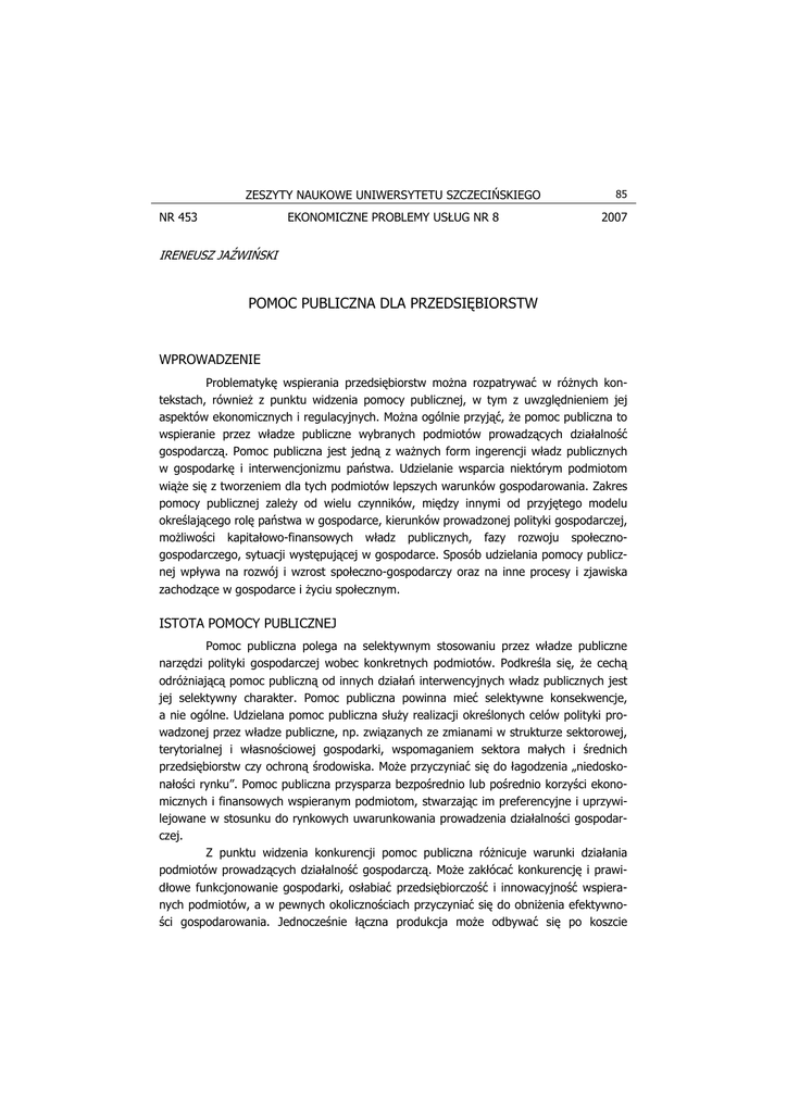 ZESZYTY NAUKOWE UNIWERSYTETU SZCZECIŃSKIEGO NR 453 EKONOMICZNE PROBLEMY USŁUG NR 8 85 2007 IRENEUSZ JAŹWIŃSKI POMOC PUBLICZNA DLA PRZEDSIĘBIORSTW WPROWADZENIE Problematykę wspierania przedsiębiorstw można rozpatrywać w różnych kontekstach, również z punktu widzenia pomocy publicznej, w tym z uwzględnieniem jej aspektów ekonomicznych i regulacyjnych. Można ogólnie przyjąć, że pomoc publiczna to wspieranie przez władze publiczne wybranych podmiotów prowadzących działalność gospodarczą. Pomoc publiczna jest jedną z ważnych form ingerencji władz publicznych w gospodarkę i interwencjonizmu państwa. Udzielanie wsparcia niektórym podmiotom wiąże się z tworzeniem dla tych podmiotów lepszych warunków gospodarowania. Zakres pomocy publicznej zależy od wielu czynników, między innymi od przyjętego modelu określającego rolę państwa w gospodarce, kierunków prowadzonej polityki gospodarczej, możliwości kapitałowo-finansowych władz publicznych, fazy rozwoju społecznogospodarczego, sytuacji występującej w gospodarce. Sposób udzielania pomocy publicznej wpływa na rozwój i wzrost społeczno-gospodarczy oraz na inne procesy i zjawiska zachodzące w gospodarce i życiu społecznym. ISTOTA POMOCY PUBLICZNEJ Pomoc publiczna polega na selektywnym stosowaniu przez władze publiczne narzędzi polityki gospodarczej wobec konkretnych podmiotów. Podkreśla się, że cechą odróżniającą pomoc publiczną od innych działań interwencyjnych władz publicznych jest jej selektywny charakter. Pomoc publiczna powinna mieć selektywne konsekwencje, a nie ogólne. Udzielana pomoc publiczna służy realizacji określonych celów polityki prowadzonej przez władze publiczne, np. związanych ze zmianami w strukturze sektorowej, terytorialnej i własnościowej gospodarki, wspomaganiem sektora małych i średnich przedsiębiorstw czy ochroną środowiska. Może przyczyniać się do łagodzenia „niedoskonałości rynku”. Pomoc publiczna przysparza bezpośrednio lub pośrednio korzyści ekonomicznych i finansowych wspieranym podmiotom, stwarzając im preferencyjne i uprzywilejowane w stosunku do rynkowych uwarunkowania prowadzenia działalności gospodarczej. Z punktu widzenia konkurencji pomoc publiczna różnicuje warunki działania podmiotów prowadzących działalność gospodarczą. Może zakłócać konkurencję i prawidłowe funkcjonowanie gospodarki, osłabiać przedsiębiorczość i innowacyjność wspieranych podmiotów, a w pewnych okolicznościach przyczyniać się do obniżenia efektywności gospodarowania. Jednocześnie łączna produkcja może odbywać się po koszcie 86 Ireneusz Jaźwiński wyższym niż najniższy z możliwych 1 . Należy ponadto zwrócić uwagę, że podczas udzielania pomocy wydawane lub uszczuplane są środki publiczne, którymi trzeba racjonalnie i zdyscyplinowanie gospodarować. Ważne jest również tworzenie warunków do podejmowania przez organy administracji publicznej jak najbardziej obiektywnych decyzji dotyczących udzielania pomocy publicznej. Ze względu na przedstawione czynniki udzielanie pomocy publicznej powinno stanowić przedmiot rozsądnej regulacji. REGULACJA POMOCY PUBLICZNEJ Pomoc publiczna w Polsce regulowana jest przez wiele unijnych i polskich norm prawnych. W warunkach polskich dużą rolę przypisuje się Ustawie o postępowaniu w sprawach dotyczących pomocy publicznej z 2004 roku 2 . Pomoc publiczną zdefiniowano we wcześniej uchwalonej i już nieobowiązującej Ustawie o warunkach dopuszczalności i nadzorowaniu pomocy publicznej dla przedsiębiorców z 2002 roku 3 , według której pomoc publiczna dla przedsiębiorców to przysporzenie korzyści finansowych określonemu przedsiębiorcy w zakresie prowadzonej przez niego działalności gospodarczej. W ustawie tej zapisano także, że przysporzenie to uznaje się za pomoc, jeżeli jest realizowane bezpośrednio z krajowych środków publicznych lub z takich środków przekazanych innym podmiotom albo pomniejsza lub może pomniejszyć te środki oraz narusza lub grozi naruszeniem konkurencji przez uprzywilejowanie niektórych przedsiębiorców lub produkcji niektórych towarów. W związku z przystąpieniem Polski do Unii Europejskiej przepisy polskiego prawa odnoszące się do pomocy publicznej były dostosowywane do prawa wspólnotowego. Już w zawartym 16 grudnia 1991 roku Układzie o stowarzyszeniu między Polską a Wspólnotami Europejskimi, nazywanym Układem Europejskim, Polska uznała konieczność dostosowania polskich reguł konkurencji do zasad obowiązujących w UE, w tym zwłaszcza w zakresie pomocy udzielanej przez państwo 4 . W tym miejscu warto zauważyć, że w prawie wspólnotowym pod pojęciem państwa w aspekcie pomocy publicznej rozumie się „państwowe jednostki centralne, jak również wszystkie jednostki zdecentrali- 1 Por. A. Nadolska: Polityka mikroekonomiczna (ingerencje państwa w sferę wytwarzania i wymiany), [w:] H. Ćwikliński (red.): Polityka gospodarcza, Wydawnictwo Uniwersytetu Gdańskiego, Gdańsk 2001, s. 158. 2 Ustawa z 30 kwietnia 2004 roku o postępowaniu w sprawach dotyczących pomocy publicznej (Dz.U. 2004, nr 123, poz. 1291). 3 Ustawa z 27 lipca 2002 roku o warunkach dopuszczalności i nadzorowaniu pomocy publicznej dla przedsiębiorców (Dz.U. 2002, nr 141, poz. 1177 z późn. zm.). Ustawa ta weszła w życie w październiku 2002 roku. 4 Zob. J. Ruszkowski, E. Górnicz, M. Żurek: Leksykon integracji europejskiej, Wydawnictwo Naukowe PWN, Warszawa 2002, s. 324-329. Pomoc publiczna dla przedsiębiorstw 87 zowane, które znajdują się pod władzą państwa, i które oparte są na konstytucji państwa członkowskiego” 5 . Udzielanie pomocy publicznej w państwach unijnych jest przede wszystkim regulowane przez normy zawarte w dorobku prawnym Wspólnoty Europejskiej (tzw. acquis communautaire), w tym w postanowieniach traktatowych. Artykuł 87 Traktatu ustanawiającego Wspólnotę Europejską stanowi, że 