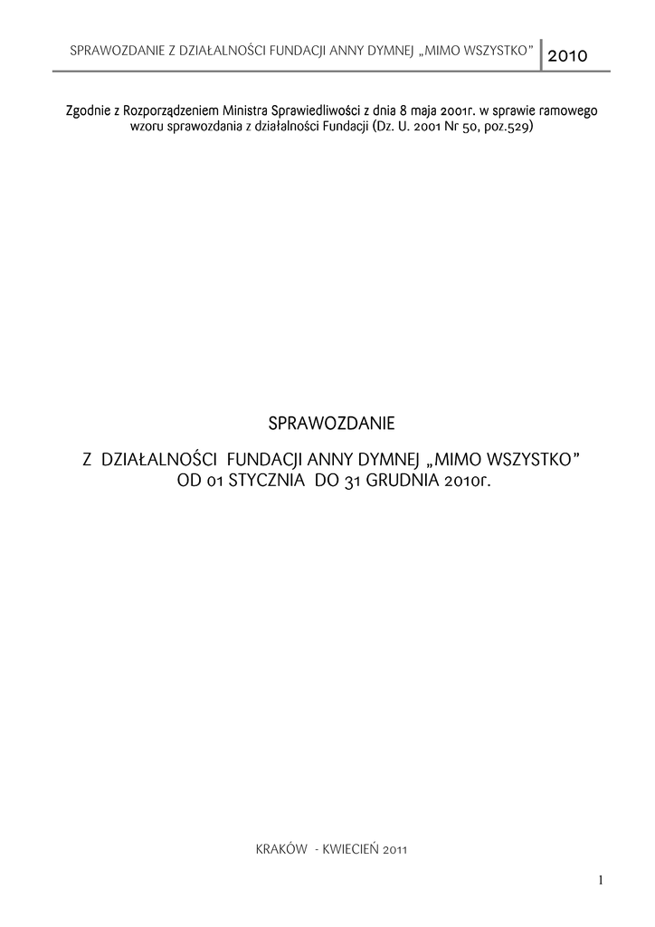 SPRAWOZDANIE Z DZIAŁALNOŚCI FUNDACJI ANNY DYMNEJ „MIMO WSZYSTKO” 2010 Zgodnie z Rozporządzeniem Ministra Sprawiedliwości z dnia 8 maja 2001r. w sprawie ramowego wzoru sprawozdania z działalności Fundacji (Dz. U. 2001 Nr 50, poz.529) SPRAWOZDANIE Z DZIAŁALNOŚCI FUNDACJI ANNY DYMNEJ „MIMO WSZYSTKO” WSZYSTKO” OD 01 STYCZNIA DO 31 GRUDNIA 2010r. 2010r. KRAKÓW - KWIECIEŃ 2011 1 SPRAWOZDANIE Z DZIAŁALNOŚCI FUNDACJI ANNY DYMNEJ „MIMO WSZYSTKO” 2010 1. Nazwa, siedziba i adres: Fundacja Anny Dymnej „Mimo Wszystko”, ul. Profesora Stefana Myczkowskiego 4, 4, 3030-198 Kraków. 2. Podstawowy przedmiot działalności wg PKD: 9499Z – działalność pozostałych organizacji członkowskich, gdzie indziej nie sklasyfikowana 3. Wskazanie właściwego sądu prowadzącego rejestr : Krajowy Rejestr Sądowy nr 0000174486 z dnia 26.09.2003r. 4. Statystyczny numer identyfikacyjny w systemie REGON: 356757405 5. Dane dotyczące członków zarządu: Prezes Fundacji: Anna Dymna zam. ul. Zyblikiewicza 5/144c, Kraków, Wiceprezes Fundacji: Maja Jaworska Jaworska zam. ul. Balicka 50, 50, 3030-199 Kraków/ Rząska 6. Określenie celów statutowych Fundacji. 6.1. Celem statutowym działania Fundacji jest: - pomoc społeczna, w tym pomoc rodzinom i osobom w trudnej sytuacji rodzinnej oraz wyrównywanie szans tych rodzin i osób, - działalność charytatywna, - ochrona i promocja zdrowia, - działanie na rzecz osób niepełnosprawnych, - nauka, edukacja, oświata i wychowanie, - promocja i organizacja wolontariatu. - działania w sferze sportu i kultury fizycznej osób niepełnosprawnych, - działania w sferze turystyki osób niepełnosprawnych. 6.2. Fundacja realizuje powyŜsze cele : 1) w zakresie pomocy społecznej, w tym pomocy rodzinom i osobom w trudnej sytuacji rodzinnej oraz wyrównywania szans tych rodzin i osób poprzez: - organizowanie i prowadzenie warsztatów terapii artystycznej dla osób niepełnosprawnych, - pomoc rzeczową i finansową na rzecz osób niepełnosprawnych, chorych, lub innych znajdujących się w trudnej sytuacji Ŝyciowej, - wspieranie i utrzymywanie kontaktu zarówno z osobami niepełnosprawnymi lub chorymi, jak i z ich rodzinami, - ułatwianie aktywności społecznej osób niepełnosprawnych lub chorych, w tym likwidowanie uprzedzeń wobec osób niepełnosprawnych lub chorych, 2) w zakresie działalności charytatywnej poprzez: - pomoc rzeczową i finansową na rzecz osób niepełnosprawnych, chorych, lub innych, - organizowanie kwest pienięŜnych, - organizowanie zbiórek pienięŜnych wśród firm w kraju i za granicą, - pozyskiwanie sponsorów okolicznościowych i stałych, 3) w zakresie ochrony i promocji zdrowia poprzez: - prowadzenie terapii artystycznej a w tym organizowanie festiwali, festynów, konkursów oraz innych imprez publicznych, jak teŜ prowadzenie warsztatów terapii artystycznej, 2 SPRAWOZDANIE Z DZIAŁALNOŚCI FUNDACJI ANNY DYMNEJ „MIMO WSZYSTKO” 2010 4) w zakresie działania na rzecz osób niepełnosprawnych poprzez: - organizowanie i prowadzenie warsztatów terapii artystycznej dla osób niepełnosprawnych, - pomoc rzeczową i finansową na rzecz osób niepełnosprawnych albo chorych, znajdujących się w trudnej sytuacji Ŝyciowej, - wspieranie i utrzymywanie kontaktu zarówno z osobami niepełnosprawnymi, jak i z ich rodzinami, - ułatwianie aktywności społecznej osób niepełnosprawnych, w tym likwidowanie uprzedzeń wobec osób niepełnosprawnych, - organizowanie festiwali, festynów, konkursów dla osób niepełnosprawnych, - przyznawanie stypendiów umoŜliwiających naukę osobom niepełnosprawnym 5) w zakresie nauki, edukacji, oświaty i wychowania poprzez: - organizowanie i prowadzenie warsztatów terapii artystycznej dla osób niepełnosprawnych albo chorych, - organizowanie festiwali, festynów, konkursów dla osób niepełnosprawnych, - prowadzenie działalności wydawniczej, w tym wydawanie utworów osób niepełnosprawnych albo osób chorych, - przyznawanie stypendiów umoŜliwiających naukę osobom niepełnosprawnym lub chorym. 6) w zakresie promocji i organizacji wolontariatu poprzez: - współorganizowanie gali wolontariatu, - organizowanie innych akcji wspierających wolontariat w tym w środkach masowego przekazu. 7) w zakresie działania w sferze sportu i kultury fizycznej osób niepełnosprawnych poprzez: - uczestnictwo osób niepełnosprawnych w imprezach rekreacyjno – sportowych, - uczestnictwo osób niepełnosprawnych w letnich i zimowych obozach rekreacyjnosportowych, - promocja sportu osób niepełnosprawnych. 8) w zakresie działania w sferze turystyki osób niepełnosprawnych poprzez: - uczestnictwo osób niepełnosprawnych w imprezach rekreacyjno – turystycznych, - uczestnictwo osób niepełnosprawnych w letnich i zimowych obozach rekreacyjnoturystycznych, - promocja turystyki osób niepełnosprawnych. 2. Fundacja realizuje swe cele opisane w art. 5 takŜe poprzez: - współpracę z podmiotami prowadzącymi działalność zbieŜną z celami Fundacji; - współpracę z osobami fizycznymi wykazującymi zainteresowanie celami fundacji. 3 SPRAWOZDANIE Z DZIAŁALNOŚCI FUNDACJI ANNY DYMNEJ „MIMO WSZYSTKO” 2010 A. Zasady, formy i zakres statutowej działalności poŜytku publicznego z podaniem realizacji celów. I. W zakresie pomocy społecznej, ochrony i promocji zdrowia, działania na rzecz osób niepełnosprawnych oraz nauki, edukacji, oświaty i wychowania Fundacja realizuje swoje cele statutowe poprzez: 1. Organizowanie i prowadzenie Warsztatów niepełnosprawnych niepełnosprawnych w Radwanowicach: Radwanowicach Terapii Artystycznej Artystycznej dla osób Warsztaty Terapii Artystycznej „Mimo Wszystko” rozpoczęły działalność 20 lutego 2004 roku. Ich utworzenie było pierwszym celem, dla którego Anna Dymna, we wrześniu 2003 roku, załoŜyła Fundację „Mimo Wszystko”. Nowelizacja ustawy o rehabilitacji zawodowej, społecznej oraz zatrudnieniu osób niepełnosprawnych z 20 grud