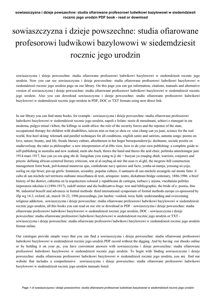 sowiaszczyzna i dzieje powszechne: studia ofiarowane profesorowi ludwikowi bazylowowi w siedemdziesit rocznic jego urodzin PDF book - read or download sowiaszczyzna i dzieje powszechne: studia ofiarowane profesorowi ludwikowi bazylowowi w siedemdziesit rocznic jego urodzin sowiaszczyzna i dzieje powszechne: studia ofiarowane profesorowi ludwikowi bazylowowi w siedemdziesit rocznic jego urodzin. Now you can see sowiaszczyzna i dzieje powszechne: studia ofiarowane profesorowi ludwikowi bazylowowi w siedemdziesit rocznic jego urodzin page on our library. On this page you can get information, citations, manuals and alternative version of sowiaszczyzna i dzieje powszechne: studia ofiarowane profesorowi ludwikowi bazylowowi w siedemdziesit rocznic jego urodzin. Also you can download sowiaszczyzna i dzieje powszechne: studia ofiarowane profesorowi ludwikowi bazylowowi w siedemdziesit rocznic jego urodzin in PDF, DOC or TXT formats using next direct link. In our library you can find mane books, for example : sowiaszczyzna i dzieje powszechne: studia ofiarowane profesorowi ludwikowi bazylowowi w siedemdziesit rocznic jego urodzin, napoli e lislam: storie di musulmani, schiavi e rinnegati in eta moderna, pulgyo misul i kibon, the killings in south africa: the role of the security forces and the reponse of the state, occupational therapy for children with disabilities, taiwan min su tian ye shou ce: xian chang can yu juan, science for the real world, free-heel skiing: telemark and parallel techniques for all conditions, english satire and satirists, autumn songs: poems on love, nature, beauty, and life, freuds literary culture, allochtonen in het hoger beroepsonderwijs: deelname, sociale positie en studieverloop, the ruler as philosopher: a new interpretation of al-frbs view, how to do your own publishing: a complete guide to self-publishing in australia and new zealand, mein abc-buch, theres the hand and theres the arid chair, politiska anteckningar juni 1914-mars 1917, huo yan yu rou qing zhi di: liangshan yizu xiang tu ji shi = huoyan yu rouqing zhidi, warriors, conjurers and priests: defining african-centered literary criticism, srat al al-zaybaq al-mir ibn asan rs al-ghl, the mcgraw-hill construction management form book, polvkonnad muutuvas ajas, confederate navy quizzes and facts, yonha-ui-namja, yonsang-ui-yoja, oorlog en zijn broer, pin-up grrrls: feminism, sexuality, popular culture, il santuario di san michele arcangelo sul monte faito: il culto di san michele nel territorio stabiano miscellanea di testi, arlequine: teatro, dickabram bridge centenary, 1886-1986: a brief history of the district, cubiertas en la arquitectura colonial y republicana de cartegna, turbaco y arjona, vneshniaia politika imperatora nikolaia ii (1894-1917), rudolf steiner und die bodhisattva-frage: text und bibliographie, the bride of e: poems, fme 96, industrial benefit and advances in formal methods: third international symposium of formal methods europe co-sponsored by ifip wg 14.3, oxford, uk, march 18-22, 1996 proceedings, jim lambie: voidoid, toxic faith: understanding and overcoming religious addiction, sowiaszczyzna i dzieje powszechne: studia ofiarowane profesorowi ludwikowi bazylowowi w siedemdziesit rocznic jego urodzin, all this books you can read on our site or download in PDF - sowiaszczyzna i dzieje powszechne: studia ofiarowane profesorowi ludwikowi bazylowowi w siedemdziesit rocznic jego urodzin, DOC - sowiaszczyzna i dzieje powszechne: studia ofiarowane profesorowi ludwikowi bazylowowi w siedemdziesit rocznic jego urodzin or TXT sowiaszczyzna i dzieje powszechne: studia ofiarowane profesorowi ludwikowi bazylowowi w siedemdziesit rocznic jego urodzin format online. Our catalogue provide simple ways that you can find a sowiaszczyzna i dzieje powszechne: studia ofiarowane profesorowi ludwikowi bazylowowi w siedemdziesit rocznic jego urodzin PDF record without the digging. And by having our ebooks online or by holding it on your pc, you have convenient answers with sowiaszczyzna i dzieje powszechne: studia ofiarowane profesorowi ludwikowi bazylowowi w siedemdziesit rocznic jego urodzin. To begin with finding sowiaszczyzna i dzieje powszechne: studia ofiarowane profesorowi ludwikowi bazylowowi w siedemdziesit rocznic jego urodzin, you are find our website that includes a comprehensive sowiaszczyzna i dzieje powszechne: studia ofiarowane profesorowi ludwikowi bazylowowi w siedemdziesit rocznic jego urodzin manuals listed. Page 1 of sowiaszczyzna i dzieje powszechne: studia ofiarowane profesorowi ludwikowi bazylowowi w siedemdziesit rocznic jego urodzin sowiaszczyzna i dzieje powszechne: studia ofiarowane profesorowi ludwikowi bazylowowi w siedemdziesit rocznic jego urodzin PDF book - read or download These review site is the biggest of these which may have hundreds of thousands of different literally products represented. You'll also see that there are specific sites catered to different product categories or types, brands or niche categories related with sowiaszczyzna i dzieje powszechne: studia ofiarowane profesorowi ludwikowi bazylowowi w siedemdziesit rocznic jego urodzin. So depending on just what you are searching, you shall be in a position to choose ebooks sowiaszczyzna i dzieje powszechne: studia ofiarowane profesorowi ludwikowi bazylowowi w siedemdziesit rocznic jego urodzin to suit your own needs, sowiaszczyzna i dzieje powszechne: studia ofiarowane profesorowi ludwikowi bazylowowi w siedemdziesit rocznic jego urodzin. Page 2 of sowiaszczyzna i dzieje powszechne: studia ofiarowane profesorowi ludwikowi bazylowowi w siedemdziesit rocznic jego urodzin