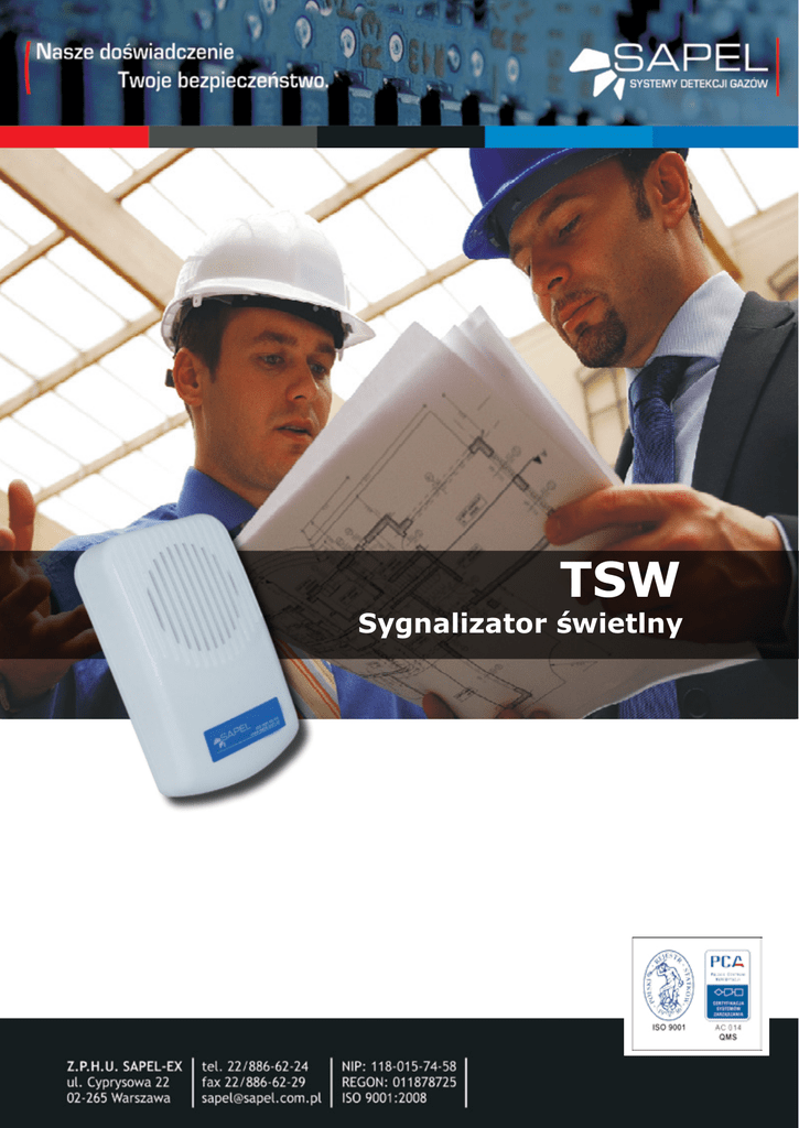 TSW Sygnalizator świetlny Opis ogólny W sygnalizatorze TSW-1/ TSW-2 źródłem sygnału akustycznego jest przetwornik piezoelektryczny, zaś źródłem sygnału optycznego (tylko TSW-2) są diody LED lub pulsująca żarówka (w zależności od wersji sygnalizatora). Włączenie sygnału alarmowego odbywa się przez niezależne podanie na wejścia wyzwalające STA (sygnał akustyczny) i STO (sygnał optyczny) napięć +12 V względem GND (GND – ujemny biegun zasilania). Napięcie sterujące może pochodzić z dowolnych źródeł. W przypadku sterowania sygnałem akustycznym i optycznym z jednego źródła, przewody sygnału sterującego muszą zostać dołączone do obu wejść (STA i STO). Sygnalizator TSW-2 Instrukcja obsługi – wersja 1.4 2008-04-04 zabezpieczony jest przed zmianą polaryzacji napięć sterujących. Zaciski oznaczone TAMP służą do podłączenia przewodów wejścia antysabotażowego centrali alarmowej. Dane techniczne Napięcie zasilania Pobór prądu - TSW-1 - TSW-2 (optyka LED) - TSW-2 (optyka żarówka) Energia błysków Poziom dźwięku Temperatura pracy Wymiary Masa Schemat podłączenia 12VDC ok. 25mA ok. 70mA 280mA ok. 4Ws ok. 90 dB -25° do +60°C 130x80x40 mm 0,15 kg