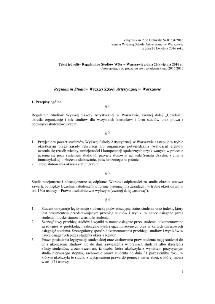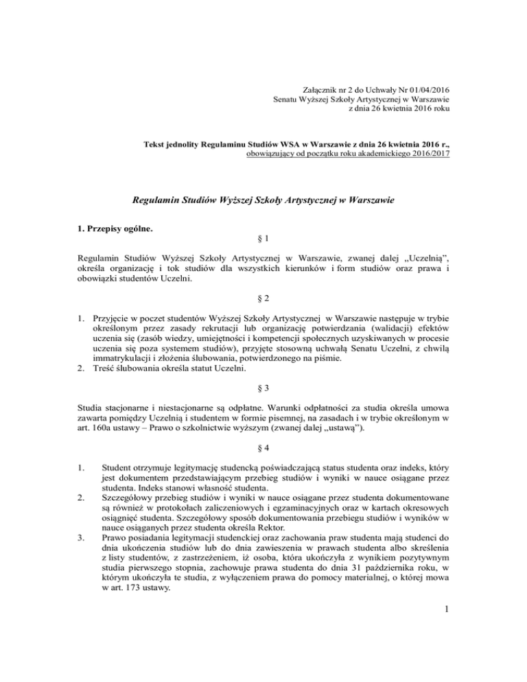 Załącznik nr 2 do Uchwały Nr 01/04/2016 Senatu Wyższej Szkoły Artystycznej w Warszawie z dnia 26 kwietnia 2016 roku Tekst jednolity Regulaminu Studiów WSA w Warszawie z dnia 26 kwietnia 2016 r., obowiązujący od początku roku akademickiego 2016/2017 Regulamin Studiów Wyższej Szkoły Artystycznej w Warszawie 1. Przepisy ogólne. §1 Regulamin Studiów Wyższej Szkoły Artystycznej w Warszawie, zwanej dalej „Uczelnią”, określa organizację i tok studiów dla wszystkich kierunków i form studiów oraz prawa i obowiązki studentów Uczelni. §2 1. Przyjęcie w poczet studentów Wyższej Szkoły Artystycznej w Warszawie następuje w trybie określonym przez zasady rekrutacji lub organizację potwierdzania (walidacji) efektów uczenia się (zasób wiedzy, umiejętności i kompetencji społecznych uzyskiwanych w procesie uczenia się poza systemem studiów), przyjęte stosowną uchwałą Senatu Uczelni, z chwilą immatrykulacji i złożenia ślubowania, potwierdzonego na piśmie. 2. Treść ślubowania określa statut Uczelni. §3 Studia stacjonarne i niestacjonarne są odpłatne. Warunki odpłatności za studia określa umowa zawarta pomiędzy Uczelnią i studentem w formie pisemnej, na zasadach i w trybie określonym w art. 160a ustawy – Prawo o szkolnictwie wyższym (zwanej dalej „ustawą”). §4 1. 2. 3. Student otrzymuje legitymację studencką poświadczającą status studenta oraz indeks, który jest dokumentem przedstawiającym przebieg studiów i wyniki w nauce osiągane przez studenta. Indeks stanowi własność studenta. Szczegółowy przebieg studiów i wyniki w nauce osiągane przez studenta dokumentowane są również w protokołach zaliczeniowych i egzaminacyjnych oraz w kartach okresowych osiągnięć studenta. Szczegółowy sposób dokumentowania przebiegu studiów i wyników w nauce osiąganych przez studenta określa Rektor. Prawo posiadania legitymacji studenckiej oraz zachowania praw studenta mają studenci do dnia ukończenia studiów lub do dnia zawieszenia w prawach studenta albo skreślenia z listy studentów, z zastrzeżeniem, iż osoba, która ukończyła z wynikiem pozytywnym studia pierwszego stopnia, zachowuje prawa studenta do dnia 31 października roku, w którym ukończyła te studia, z wyłączeniem prawa do pomocy materialnej, o której mowa w art. 173 ustawy. 1 4. Studenci innych uczelni realizujący część programu kształcenia w Wyższej Szkole Artystycznej w Warszawie stosują się do zapisów niniejszego Regulaminu w zakresie ich dotyczącym. §5 1. Najwyższym zwierzchnikiem wszystkich studentów Uczelni jest Rektor. Nadzór nad całością przebiegu procesu dydaktycznego i wychowawczego w Uczelni sprawuje prorektor do spraw dydaktycznych. 2. Prorektor, o którym mowa w ust. 1, sprawuje ponadto nadzór nad realizacją planów studiów i programów kształcenia. 3. Prorektor do spraw dydaktycznych może dokonywać czynności mieszczących się w ramach kompetencji Rektora, na podstawie pełnomocnictwa udzielonego mu przez Rektora w formie pisemnej 4. Od decyzji Rektora, z zastrzeżeniem ust. 3, studentowi przysługuje możliwość złożenia wniosku do Rektora o ponowne rozpatrzenie sprawy, w terminie 14 dni od otrzymania decyzji. Ponowna decyzja Rektora w sprawie jest ostateczna. §6 1. 2. 3. 4. Na studiach pierwszego stopnia oraz drugiego stopnia mogą zostać powołani spośród nauczycieli akademickich opiekunowie poszczególnych roczników. Opiekunów roczników powołuje Rektor na czas określony. Rektor może powołać pełnomocnika ds. osób niepełnosprawnych. Do zadań pełnomocnika rektora ds. osób niepełnosprawnych należy przede wszystkim określenie szczególnych potrzeb studentów niepełnosprawnych dotyczących organizacji i realizacji procesu dydaktycznego, w tym dostosowania warunków odbywania studiów do rodzaju niepełnosprawności. §7 1. Wszyscy studenci Uczelni tworzą Samorząd Studentów, którego organy, pochodzące z wyboru, są wyłącznym reprezentantem ogółu studentów Uczelni. 2. Samorząd Studentów działa na podstawie Regulaminu Samorządu Studentów, zatwierdzonego przez Senat Uczelni pod względem jego zgodności z ustawą i statutem Uczelni. 3. Samorząd Studentów prowadzi na terenie Uczelni działalność w zakresie spraw studenckich, w tym socjalno-bytowych, artystycznych i kulturalnych. 4. Organy Samorządu Studentów, w zakresie ich działalności, upoważnione są do występowania wobec władz Uczelni w sprawach dotyczących studentów, w szczególności mogą wyrażać opinie i przedstawiać wnioski. 2. Obowiązki i prawa studenta. §8 Student ma obowiązek systematycznego zdobywania wiedzy i umiejętności zgodnie z planem studiów i programem kształcenia. 2 §9 W szczególności, w toku odbywania studiów, student jest zobowiązany do: 1) postępowania zgodnego z treścią ślubowania i regulaminem studiów oraz pełnego wykorzystania możliwości kształcenia się, 2) aktywnego uczestniczenia w zajęciach dydaktycznych, naukowych i innych organizowanych przez Uczelnię, uzyskiwania zaliczeń i składania egzaminów, odbywania praktyk studenckich i innych zajęć określonych w planach studiów i programach kształcenia, 3) przestrzegania przepisów obowiązujących w Uczelni, 4) poszanowania mienia Uczelni oraz własności koleżanek i kolegów, 5) dbania o godność studenta i dobre imię Uczelni, 6) terminowego wnoszenia opłat za usługi edukacyjne, określonych w odrębnych przepisach, 7) dostarczenia na żądanie Rektora orzeczenia lekarskiego o istnieniu lub braku przeciwwskazań zdrowotnych do udziału w zajęciach dydaktycznych lub innych zajęciach określonych w planach studiów i programach kształcenia, 8) przestrzegania dobrych obyczajów wspólnoty akademickiej. § 10 1. Student ma prawo do: 1) wyrażania opinii w formie ankiet o prowadzonych w Uczelni zajęciach dydaktycznych, zgodnie z przepisami obowiązującymi w Uczelni , 2) zdobywania wiedzy na wybranym kierunk