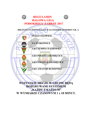 REGULAMIN HALOWA LIGA PODOKRĘGU ZABRZE 2017 DRUŻYNY UCZESTNICZĄCE W KATEGORII JUNIORZY GR. A PIAST I GLIWICE FA PYSKOWICE LKS TEMPO I PANIÓWKI LKS POGOŃ I ZIEMIĘCICE LKS POGOŃ II ZIEMIĘCICE LKS AMATOR RUDZINIEC WSZYSTKIE MECZE W GRUPIE BĘDĄ ROZGRYWANE SYSTEMEM „KAŻDY Z KAŻDYM” W WYMIARZE CZASOWYM 1 x 18 MINUT. REGULAMIN HALOWA LIGA PODOKRĘGU ZABRZE 2017 DRUŻYNY UCZESTNICZĄCE W KATEGORII JUNIORZY GR. B LKS TEMPO II PANIÓWKI MSPN GÓRNIK ZABRZE PIAST II GLIWICE MRKS CZARNI PYSKOWICE AFC SOLDADOS KS MOSiR SPARTA ZABRZE WSZYSTKIE MECZE W GRUPIE BĘDĄ ROZGRYWANE SYSTEMEM „KAŻDY Z KAŻDYM” W WYMIARZE CZASOWYM 1 x 18 MINUT. REGULAMIN HALOWA LIGA PODOKRĘGU ZABRZE 2017 1. Cel zawodów popularyzacja zdrowego trybu życia oraz gry w piłkę nożną na hali - futsal wyłonienie najlepszych drużyn juniorskich w „HLPZ Śl. ZPN Podokręg Zabrze 2017” 2. Terminy zawodów i miejsce Halowa Liga w dniach: - Gr. A - 21.01.2017 r. w godzinach 10:00-15:00 hala sportowa przy ulicy Sikorskiego 130 w Gliwicach-Sośnica - Gr. B - 21.01.2017 r. w godzinach 15:00-20:00 hala sportowa przy ulicy Sikorskiego 130 w Gliwicach-Sośnica Osoba kontaktowa Barbara Knebel – Tel. 501-857-917 3. Uczestnictwo a/ zasady udziału w rozgrywkach turniej organizowany jest dla drużyn piłkarskich występujących w różnych klasach rozgrywkowych drużyny mogą również składać się z dowolnie dobranych zawodników którzy wystąpią pod jedną wspólną nazwą w rozgrywkach mogą brac udział zawodnicy z roczników 1998, 1999, 2000 i 2001 b/ warunkiem uczestnictwa jest zgłoszenie zespołu maksymalnie 12 osobowego plus trener-opiekun (lista zgłoszeniowa drużyny jest taka sama podczas rozgrywek grupowych jak i podczas Wielkiego Finału) dokonanie opłaty startowej bezzwrotnej posiadanie przez cały czas trwania dowodu tożsamości posiadanie przez zawodników aktualnych badań lekarskich (odpowiedzialność spada na opiekuna drużyny) c/ przystąpienie drużyny do rozgrywek jest jednoznaczne z akceptacją niniejszego regulaminu REGULAMIN HALOWA LIGA PODOKRĘGU ZABRZE 2017 4. Sposób punktowania zwycięstwo – 3 pkt remis – 1 pkt porażka – 0 pkt 5. Dyskwalifikacje podejmuje organizator oraz sędzia prowadzący zawody na pisemny wniosek opiekuna drużyny biorącej udział w turnieju protesty przyjmowane są przez organizatora tylko podczas trwania turnieju w danym dniu przy składaniu wniosku wnioskodawca jest zobowiązany podać dane dotyczące zawodnika, co do którego wnosi się protest tj. imię , nazwisko, drużynę w której występował po zakończeniu turnieju wyniki nie podlegają weryfikacji 6. Nagrody i wyróżnienia Drużynowe – trzy najlepsze drużyny w turniej Nagrody indywidualne (najlepszy strzelec, najlepszy bramkarz i najlepszy zawodnik) 7. Postanowienia końcowe obowiązuje obuwie sportowe parking znajduje się przy hali i jest niestrzeżony wszyscy uczestnicy ubezpieczają się od następstw nieszczęśliwych wypadków we własnym zakresie; na żądanie organizatora należy je przedstawić pod rygorem nie dopuszczenia do gry organizator nie odpowiada za rzeczy osobiste i inne pozostawione na obiekcie sportowym rozstrzyganie spraw spornych oraz interpretacja niniejszego regulaminu należy do organizatora Skrócone przepisy gry 1. Zasady ogólne czas gry wynosi raz 18min., bez przerwy , czas odmierza zegar boiskowy lub osoba prowadząca zawody, który kończy grę syreną bądź sędzia gwizdkiem mierzący czas zatrzymuje zegar w trakcje meczu na wyraźne wskazanie przez sędziego głównego gra odbywa się na boisku o wymiarach 20 x 40 m bramka ma wymiary 3 x 2 m pole bramkowe wyznacza linia 6 m od piłki ręcznej REGULAMIN HALOWA LIGA PODOKRĘGU ZABRZE 2017 2. Zawodnicy: drużyna liczy z rezerwowymi max 12 zawodników w turnieju (w przypadku gdy klub-stowarzyszenie zgłosi więcej niż jedną drużynę rozgrywkach danej kategorii wiekowej lub w całych rozgrywkach HLPZ zawodnicy mogą być wpisani tylko do jednej drużyny) w grze bezpośrednio bierze udział 5 zawodników w tym bramkarz, ilość zmian w trakcie meczu dowolna, zmiany tzw. hokejowe w wyznaczonej od strony trybun od strony własnej ławki rezerwowych a. Rzuty: bramka jest uznana gdy piłka całym obwodem przejdzie za linię bramkową, rzut karny wykonuje się z linii 7 m., auty boczne wykonuje się nogą z linii boiska, aut bramkowy bramkarz wybija nogą lub ręką w obrębie całego boiska, za dotknięcie piłką konstrukcji dachu przyznaje się rzut autowy z boku bramkę można zdobyć bezpośrednio z rzutu wolnego bezpośredniego, rozpoczęcia gry, rzutu rożnego lub dowolnego strzału samobójczego, nie uznaje się bramki zdobytej bezpośrednio z autu bocznego i bramkowego oraz rzutu pośredniego sygnalizowanego przez sędziego przez podniesienie ręki, na wykonanie wszystkich tzw. stałych fragmentów gry drużyna ma 4 sekundy przy prawidłowym ustawieniu rywali. Po przekroczeniu czasu piłkę przejmuje drużyna przeciwna, odległość obrońcy od piłki podczas wykonywania rzutów i autów wynosi minimum 3 m (kara ostrzeżenia, a następnie żółta kartka) b. Gra niedozwolona: jak w przepisach Futsalu PZPN c. Kary: za niesportowe zachowanie lub przewinienie sędzia każe zawodników dwu minutową karą przy ukaraniu drużyny karą 2 minut, po stracie bramki w tym czasie przez tą drużynę, zawodnik wykluczony wraca do gry, wyjątek - nie liczy się jako bramka zdobyta sytuacji gdy faul ukarany jest rzutem karnym, dopiero następna bramka upoważnia do powrotu na boisko za zachowania brutalne i obraźliwe następuje dyskwalifikacja zawodnika i po upływie 2 minut w miejsce ukaranego może wejść rezerwowy zawodnik (nie po stracie bramki). ukarany zawodnik dyskwalifikacją nie ma prawa brać udziału w meczach już do końca danego turnieju, oraz zasiadać na ławce rezerwowych. REGULAMIN HALOWA LIGA PODOKRĘGU ZABRZE 2017 Rozstrzygnięcia końcowe: d. przy rozgrywkach grupowych mecz może kończyć 