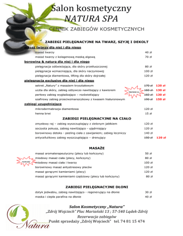 Salon kosmetyczny NATURA SPA CENNIK ZABIEGÓW KOSMETYCZNYCH ZABIEGI PIELĘGNACYJNE NA TWARZ, SZYJĘ I DEKOLT masaż twarzy dla niej i dla niego masaż twarzy 40 zł masaż twarzy z kolagenową maską algową 70 zł borowina & natura dla niej i dla niego pielęgnacja odświeżająca, dla skóry przetłuszczonej 80 zł pielęgnacja wzmacniająca, dla skóry naczyniowej 100 zł pielęgnacja diamentowa, lifting dla skóry dojrzałej 120 zł pielęgnacja exclusive dla niej i dla niego sekret „Natury” z masażem kryształowym 170 zł 120 zł 160 zł 130 zł perłowy zabieg wygładzająco – rozświetlający 160 zł 130 zł szafirowy zabieg przeciwzmarszczkowy z kwasem hialuronowym 190 zł 150 zł uczta dla skóry, zabieg odżywczo nawilżający z kawiorem PROMOCJA zabiegi uzupełniające mikrodermabrazja diamentowa 120 zł henna brwi 15 zł ZABIEGI PIELĘGNACYJNE NA CIAŁO zmysłowy raj – zabieg wyszczuplający z zielonym jabłkiem 120 zł soczysta pokusa, zabieg nawilżająco - ujędrniający 120 zł borowinowy detoks - peeling ciała z zawijaniem; zabieg leczniczy 140 zł antycellulitowy zabieg wyszczuplająco – drenujący 150 zł MASAŻE NOWOŚĆ masaż aromaterapeutyczny (plecy lub kończyny) 50 zł miodowy masaż ciała (plecy, kończyny) 80 zł miodowy masaż ciała i twarzy 100 zł borowinowy masaż antystresowy pleców 120 zł masaż gorącymi kamieniami (plecy) 120 zł masaż gorącymi kamieniami częściowy (plecy lub kończyny) 80 zł ZABIEGI PIELĘGNACYJNE DŁONI dotyk jedwabiu, zabieg nawilżająco - regenerujący na dłonie 30 zł maska i ciepła parafina na dłonie 40 zł Salon Kosmetyczny „Natura” „Zdrój Wojciech” Plac Mariański 13 ; 57-540 Lądek-Zdrój Rezerwacja zabiegów Punkt sprzedaży „Zdrój Wojciech” tel. 74 81 15 474 120 zł