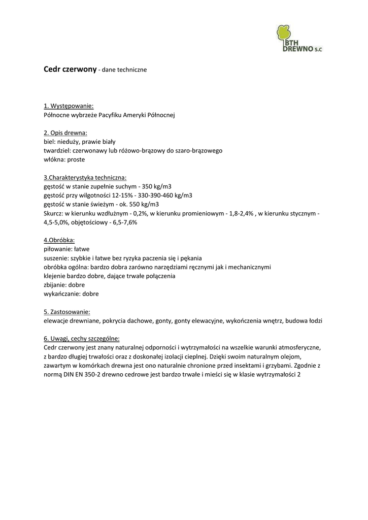 Cedr czerwony - dane techniczne 1. Występowanie: Północne wybrzeże Pacyfiku Ameryki Północnej 2. Opis drewna: biel: nieduży, prawie biały twardziel: czerwonawy lub różowo-brązowy do szaro-brązowego włókna: proste 3.Charakterystyka techniczna: gęstość w stanie zupełnie suchym - 350 kg/m3 gęstość przy wilgotności 12-15% - 330-390-460 kg/m3 gęstość w stanie świeżym - ok. 550 kg/m3 Skurcz: w kierunku wzdłużnym - 0,2%, w kierunku promieniowym - 1,8-2,4% , w kierunku stycznym 4,5-5,0%, objętościowy - 6,5-7,6% 4.Obróbka: piłowanie: łatwe suszenie: szybkie i łatwe bez ryzyka paczenia się i pękania obróbka ogólna: bardzo dobra zarówno narzędziami ręcznymi jak i mechanicznymi klejenie bardzo dobre, dające trwałe połączenia zbijanie: dobre wykańczanie: dobre 5. Zastosowanie: elewacje drewniane, pokrycia dachowe, gonty, gonty elewacyjne, wykończenia wnętrz, budowa łodzi 6. Uwagi, cechy szczególne: Cedr czerwony jest znany naturalnej odporności i wytrzymałości na wszelkie warunki atmosferyczne, z bardzo długiej trwałości oraz z doskonałej izolacji cieplnej. Dzięki swoim naturalnym olejom, zawartym w komórkach drewna jest ono naturalnie chronione przed insektami i grzybami. Zgodnie z normą DIN EN 350-2 drewno cedrowe jest bardzo trwałe i mieści się w klasie wytrzymałości 2