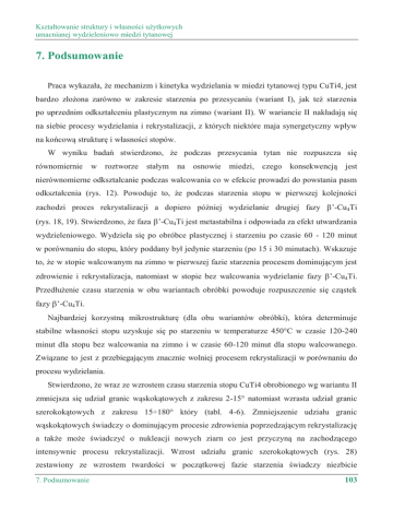Kształtowanie struktury i własności użytkowych umacnianej wydzieleniowo miedzi tytanowej 7. Podsumowanie Praca wykazała, że mechanizm i kinetyka wydzielania w miedzi tytanowej typu CuTi4, jest bardzo złożona zarówno w zakresie starzenia po przesycaniu (wariant I), jak też starzenia po uprzednim odkształceniu plastycznym na zimno (wariant II). W wariancie II nakładają się na siebie procesy wydzielania i rekrystalizacji, z których niektóre maja synergetyczny wpływ na końcową strukturę i własności stopów. W wyniku badań stwierdzono, że podczas przesycania tytan nie rozpuszcza się równomiernie w roztworze stałym na osnowie miedzi, czego konsekwencją jest nierównomierne odkształcanie podczas walcowania co w efekcie prowadzi do powstania pasm odkształcenia (rys. 12). Powoduje to, że podczas starzenia stopu w pierwszej kolejności zachodzi proces rekrystalizacji a dopiero później wydzielanie drugiej fazy E’-Cu4Ti (rys. 18, 19). Stwierdzono, że faza E’-Cu4Ti jest metastabilna i odpowiada za efekt utwardzania wydzieleniowego. Wydziela się po obróbce plastycznej i starzeniu po czasie 60 - 120 minut w porównaniu do stopu, który poddany był jedynie starzeniu (po 15 i 30 minutach). Wskazuje to, że w stopie walcowanym na zimno w pierwszej fazie starzenia procesem dominującym jest zdrowienie i rekrystalizacja, natomiast w stopie bez walcowania wydzielanie fazy E’-Cu4Ti. Przedłużenie czasu starzenia w obu wariantach obróbki powoduje rozpuszczenie się cząstek fazy E’-Cu4Ti. Najbardziej korzystną mikrostrukturę (dla obu wariantów obróbki), która determinuje stabilne własności stopu uzyskuje się po starzeniu w temperaturze 450°C w czasie 120-240 minut dla stopu bez walcowania na zimno i w czasie 60-120 minut dla stopu walcowanego. Związane to jest z przebiegającym znacznie wolniej procesem rekrystalizacji w porównaniu do procesu wydzielania. Stwierdzono, że wraz ze wzrostem czasu starzenia stopu CuTi4 obrobionego wg wariantu II zmniejsza się udział granic wąskokątowych z zakresu 2-15q natomiast wzrasta udział granic szerokokątowych z zakresu 15÷180° który (tabl. 4-6). Zmniejszenie udziału granic wąskokątowych świadczy o dominującym procesie zdrowienia poprzedzającym rekrystalizację a także może świadczyć o nukleacji nowych ziarn co jest przyczyną na zachodzącego intensywnie procesu rekrystalizacji. Wzrost udziału granic szerokokątowych (rys. 28) zestawiony ze wzrostem twardości w początkowej fazie starzenia świadczy niezbicie 7. Podsumowanie 103 Open Access Library Volume 4 (22) 2013 o zachodzącym wydzielaniu się fazy E’-Cu4Ti. Ponieważ ściśle określony kierunek ruchu granicy ziarn (w kierunku środka jej krzywizny) sprawia, że rozrost ziarn jest selektywny, więc rozrastają się ziarna o liczbie boków większej od sześciu a zanikają ziarna o liczbie boków mniejszej od sześciu. Najintensywniejsze zmniejszenie udziału wąskokątowych granic ziarn w stosunku do stanu przesyconego i walcowanego na zimno następuje w ciągu pierwszej godziny starzenia (40%) a później jest on już znacznie mniejszy (4%). Z wykonanych badań wynika, że zachodzące podczas obróbki cieplnej oraz cieplnoplastycznej (wariant I oraz II) zmiany struktury nie pozwalają na oddzielenie procesu zdrowienia od rekrystalizacji [146]. Proces rekrystalizacji zachodzi bez przemieszczania granic ziarn w zakresie dużego kąta, natomiast proces starzenia zachodzi w wyższej temperaturze (550 i 600°C) w czasie 420 minut, gdzie dominującym mechanizmem jest rozrost ziaren i zerwanie koherencji z osnową. W pracy wykazano, że zastosowanie odkształcenia plastycznego po przesycaniu z następującym starzeniem sprzyja procesowi wydzielania cząstek fazy E’-Cu4Ti (rys. 44). Przedstawione wyniki badań stopu obrobionego wg wariantu II wskazują istotny wpływ parametrów obróbki na mikrostrukturę i własności stopu. W szczególności mikrostruktura stopów walcowanych na zimno i starzonych w temp. 550°C przez 1 minutę jest bogata w pasma bliźniaków odkształcenia (rys. 45). Stwierdzono, że występuje przemiana spinodalna, której efektem są obszary wydzielenia ciągłego i nieciągłego (rys. 43). Stwierdzono, że za efekt umocnienia stopu odpowiada faza E’-Cu4Ti (rys. 46). Jej obecność potwierdzono w stopie walcowanym na zimno po przesycaniu i po starzeniu (wariant II) po 1 mincie w temperaturze 550°C. W stopach CuTi odkształconych na zimno wydzielanie nieciągłe podczas starzenia przebiega tylko dla stopu o określonej zawartości tytanu. Wydzielanie to następuje po przemianie ciągłej. Skutkiem tego jest między innymi większa liczba obszarów takich jak pasma odkształceń i granice podziarn w stopie walcowanym (rys. 41), w których inicjowane jest zarodkowanie. Ponieważ tekstura ziarn sprzyja ukierunkowaniu pasm przemiany nieciągłej umożliwia to uzyskanie stopów CuTi o ukierunkowanej strukturze włóknistej [31]. Jednak w stopach odkształconych plastycznie na zimno, szczególnie z dużym stopniem gniotu w mikrostrukturze występują pasma wolne od odkształceń, które mogą być przyczyną lokalnego obniżenia własności wytrzymałościowych lub użytkowych (rys. 68-70). Skutkuje to spadkiem odporności na zużycie trybologiczne w porównaniu ze stopami nieodkształconymi plastycznie na zimno. 104 J. Konieczny Kształtowanie struktury i własności użytkowych umacnianej wydzieleniowo miedzi tytanowej Wykonana analiza struktury stopu pozwoliła na wykazanie wzrostu rozdrobnienia struktury wraz z wydłużeniem czasu starzenia stopu walcowanego na zimno po przesycaniu. Walcowanie na zimno przesyconego roztworu stałego wpływa istotnie na wartość twardości (rys. 8, 9) i konduktywności elektrycznej (rys. 51). W przypadku odporności na zużycie trybologiczne zastosowanie odkształcenia plastycznego na zimno (wariant II) powoduje jej obniżenie (rys. 68-70). Stwierdzono, że odporność na ścieranie st