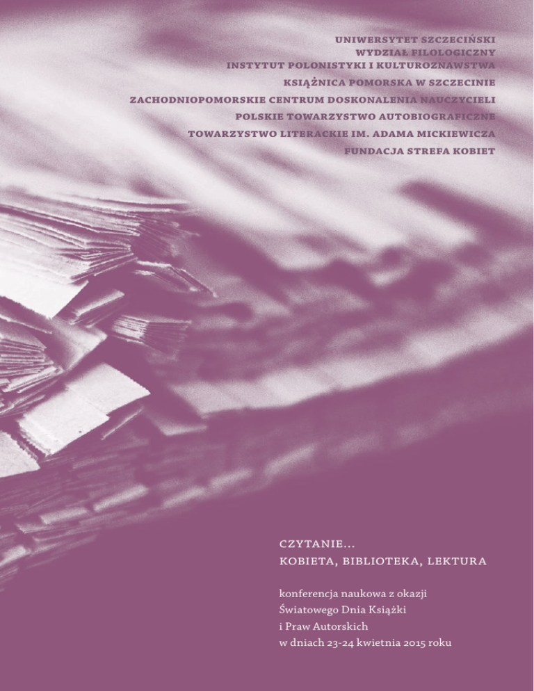 uniwersytet szczeciński wydział filologiczny instytut polonistyki i kulturoznawstwa książnica pomorska w szczecinie zachodniopomorskie centrum doskonalenia nauczycieli polskie towarzystwo autobiograficzne towarzystwo literackie im. adama mickiewicza fundacja strefa kobiet czytanie… kobieta, biblioteka, lektura konferencja naukowa z okazji Światowego Dnia Książki i Praw Autorskich w dniach 23-24 kwietnia 2015 roku czwartek, 23. kwietnia 2015 r. Książnica Pomorska im. Stanisława Staszica w Szczecinie, ul. Podgórna 15/16 piątek, 24. kwietnia 2015 r. Zachodniopomorskie Centrum Doskonalenia Nauczycieli, ul. Gen. Józefa Sowińskiego 68 g. 9.00 Sala im. Henryka Markiewicza – otwarcie konferencji Inga Iwasiów, Kobieta czytająca dzisiaj, wczoraj i jutro Ursula Phillips, Samodzielny uniwersytet kobiecy. Lektury Narcyzy Żmichowskiej Ewa Kraskowska, Niezwykłe skutki lektur Zofii Urbanowskiej g. 9.00-11.30 Joanna Kościelna, „Die Lieb‘ ist mein Begin“ – w kręgu lektur Sibylle Schwarz (1621-1638). Dialog z mistrzami Elżbieta Mikiciuk, Od męczennicy do nihilistki. O kobiecych lekturach, literackich wzorcach i życiowych wyborach w oparciu o „Nihilistkę” oraz „Wspomnienia z dzieciństwa” Zofii Kowalewskiej Monika Bednarczuk, Helena Bławatska jako czytelniczka, pisarka i krytyczka kultury Lena Magnone, Helena Deutsch czyta George Sand Maciej Duda, Lektury Dubravki Ugrešić g. 10.45-11.00 Sala im. Stefana Flukowskiego – przerwa kawowa g.11.00-12.30 Anna Pekaniec, Lektury w kobiecej literaturze dokumentu osobistego po 1864 roku. Co czytały autorki? Joanna Krajewska, Książki, które zmieniły moje życie. Kobiecy projekt biblioterapeutyczny Bożena Karwowska, Co czytają emigrantki? g. 12.30 Sala im. Zbigniewa Herberta – otwarcie wystawy Ciche czytanie na głos * prezentującej prace studentów Wzornictwa, Zachodniopomorskiego Uniwersytetu Technologicznego. Kuratorka – Agata Kosmacz g. 13.00-14.30 Aula – przerwa obiadowa g.14.30-17.00 Sekcja 1 – p. VI, s. 613 Ewa Szczepan, Edukacja romansowa kobiet w XIX wieku, czyli długie trwanie sentymentalizmu Monika Sieradzka, Maryla Wolska – czytanie trzech epok (Słowacki, Orzeszkowa, Staff) Anna Dzhabagina, Czytelniczki Nietzschego i ich głosy w pierwszych sporach o „wiedzę radosną” – Maria Cz. Przewóska i Zofia Daszyńska-Golińska Joanna Szyszko, Lektury Cecylii Walewskiej Agata Siwiec, Izabela Moszczeńska czyta Ellen Key Sekcja 2 – p. VI, s. 613 Aleksandra Banot, Eliza Orzeszkowa i Zofia Nałkowska czytają modernistów Anna Godzińska, „Każda godzina nad książką jest wykroczeniem”. Wojenne lektury Zofii Nałkowskiej Lucyna Marzec, „Dlaczego nie lubię książek”. Lektury Kazimiery Iłłakowiczówny Urszula Glensk, Klasztor bibliofilów Julia Poświatowska, Mroczne lektury królowej polskiego kryminału – Gaja Grzegorzewska w bibliotece g.18.00 Kolacja – Secesja Cafe g. 19.00-20.30 Secesja Cafe Lektury twórczości, lektury biografii – Arleta Galant rozmawia z Anną Marchewką, Moniką Świerkosz i Lucyną Marzec g. 11.30-12.15 Literatura i życie – Tatiana Czerska rozmawia z Urszulą Glensk g. 12.15-12.30 Przerwa kawowa g. 12. 30-15.00 Danuta Dąbrowska, Lektury Gabrieli Zapolskiej Monika Ładoń, Lektura w chorobie. Krystyny Kofty „Lewa, wspomnienie prawej” Monika Świerkosz, Dąbrowska i Kowalska we wzajemnej lekturze Tatiana Czerska, Lektury i biblioteki w dziennikach pisarek (A. Kowalska, J. Hartwig, K. Kofta) Aleksandra Grzemska, Odczytywanie rodzinnego archiwum. O współczesnych narracjach autobiograficznych g. 15.00-16.00 Stołówka Zespołu Szkół nr 6, ul. Gen. Józefa Sowińskiego 3 – przerwa obiadowa g. 16.00-18.30 Anna Marchewka, Lektura jako źródło cierpień. Umęczone czytelniczki w prozie Agnieszki Drotkiewicz Ewa Tierling-Śledź, Co czytają bohaterki „Jeżycjady” Małgorzaty Musierowicz? Arleta Galant, Kobieta, lektura, miasto Agata Zawiszewska, Służąca czyta. Na przykładzie „Dziewcząt z Nowolipek” Poli Gojawiczyńskiej Aleksandra Krukowska, Mieszczka jako kobieta nieczytająca w „Kaśce Kariatydzie” Gabrieli Zapolskiej g. 18.30 Arleta Galant, Agata Zawiszewska, Zakończenie konferencji g. 18.30 Stołówka Zespołu Szkół nr 6, ul. Gen. Józefa Sowińskiego 3 – kolacja * W wystawie udział biorą: Agnieszka Cudnik, Kamila Czerniawska, Grzegorz Gębuś, Agata Graś, Karolina Grębowska, Agnieszka Mosińska, Joanna Mosińska, Karolina Nowaczewska, Magdalena Noworyta, Anna Pacewicz, Aleksandra Pasternak, Natalia Plajzer, Agnieszka Podlecka, Katarzyna Pyrek, Karolina Rompa, Michał Siełacz, Zofia Szczepaniak, Anna Szymanek, Agata Zalewska, Paweł Żuberek. CZYTANIE… KOBIETA, BIBLIOTEKA, LEKTURA W XVII i XVIII wieku w Europie zmieniła się sytuacja kobiet piszących, przede wszystkim ich liczba znacznie wzrosła. Stało się to wskutek trzech wielkich rewolucji czytelniczych, jakie dokonały się od czasów odrodzenia do oświecenia: upowszechnienia się najpierw sztuki czytania i pisania, następnie sztuki cichego czytania, a wreszcie druku. Opanowanie sztuki czytania i pisania oraz cichej lektury uważane są za kwestie fundamentalne dla powstania nowoczesnego podmiotu, człowieka rozumianego jako indywiduum, a nie wyłącznie część zbiorowości, jednostki znajdującej uzasadnienie własnych myśli, emocji i czynów w samej sobie, a nie tylko na zewnątrz, osoby emancypującej się spod władzy tradycyjnych autorytetów. Rewolucje czytelnicze wydały imponujące owoce na przełomie XIX i XX wieku, kiedy do czytelni publicznych i bibliotek prywatnych weszły nowe pokolenia kobiet. One bowiem napisały – zarówno w Polsce, jak w Europie i Stanach Zjednoczonych – ważną część nowoczesnego kanonu literackiego. Konferencja Czytanie… Kobieta, biblioteka, lektura ma na celu zaprezentowanie literackich skutków kobiecych lektur w ostatnich dekadach wieku XIX i w wieku XX. Czytanie i pisanie, cicha lektura i druk dały