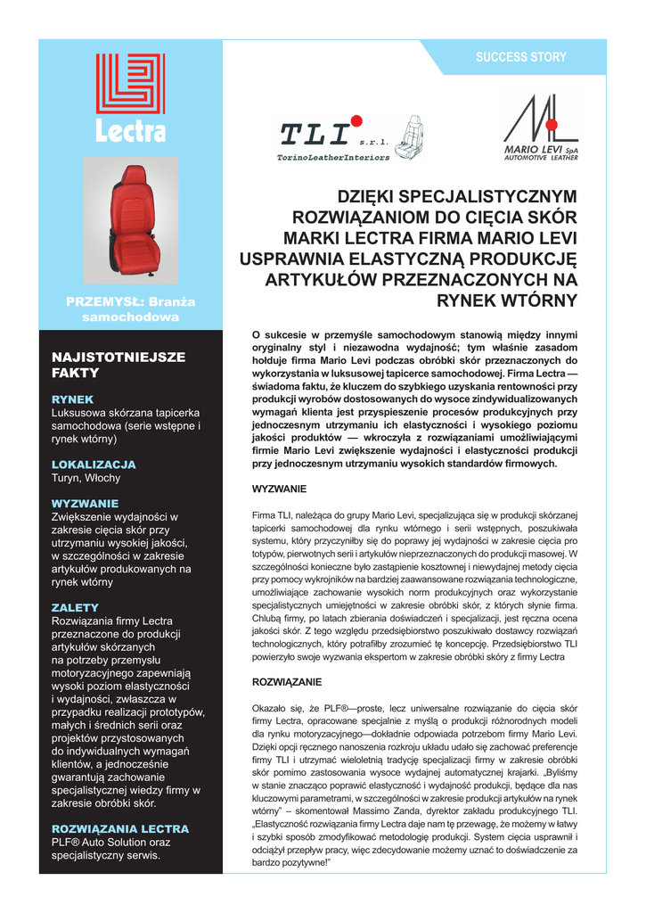 Success story PRZEMYSŁ: Branża samochodowa NAJISTOTNIEJSZE FAKTY RYNEK Luksusowa skórzana tapicerka samochodowa (serie wstępne i rynek wtórny) LOKALIZACJA Turyn, Włochy WYZWANIE Zwiększenie wydajności w zakresie cięcia skór przy utrzymaniu wysokiej jakości, w szczególności w zakresie artykułów produkowanych na rynek wtórny ZALETY Rozwiązania firmy Lectra przeznaczone do produkcji artykułów skórzanych na potrzeby przemysłu motoryzacyjnego zapewniają wysoki poziom elastyczności i wydajności, zwłaszcza w przypadku realizacji prototypów, małych i średnich serii oraz projektów przystosowanych do indywidualnych wymagań klientów, a jednocześnie gwarantują zachowanie specjalistycznej wiedzy firmy w zakresie obróbki skór. ROZWIĄZANIA LECTRA PLF® Auto Solution oraz specjalistyczny serwis. DZIĘKI SPECJALISTYCZNYM ROZWIĄZANIOM DO CIĘCIA SKÓR MARKI LECTRA FIRMA MARIO LEVI USPRAWNIA ELASTYCZNĄ PRODUKCJĘ ARTYKUŁÓW PRZEZNACZONYCH NA RYNEK WTÓRNY O sukcesie w przemyśle samochodowym stanowią między innymi oryginalny styl i niezawodna wydajność; tym właśnie zasadom hołduje firma Mario Levi podczas obróbki skór przeznaczonych do wykorzystania w luksusowej tapicerce samochodowej. Firma Lectra — świadoma faktu, że kluczem do szybkiego uzyskania rentowności przy produkcji wyrobów dostosowanych do wysoce zindywidualizowanych wymagań klienta jest przyspieszenie procesów produkcyjnych przy jednoczesnym utrzymaniu ich elastyczności i wysokiego poziomu jakości produktów — wkroczyła z rozwiązaniami umożliwiającymi firmie Mario Levi zwiększenie wydajności i elastyczności produkcji przy jednoczesnym utrzymaniu wysokich standardów firmowych. WYZWANIE Firma TLI, należąca do grupy Mario Levi, specjalizująca się w produkcji skórzanej tapicerki samochodowej dla rynku wtórnego i serii wstępnych, poszukiwała systemu, który przyczyniłby się do poprawy jej wydajności w zakresie cięcia pro totypów, pierwotnych serii i artykułów nieprzeznaczonych do produkcji masowej. W szczególności konieczne było zastąpienie kosztownej i niewydajnej metody cięcia przy pomocy wykrojników na bardziej zaawansowane rozwiązania technologiczne, umożliwiające zachowanie wysokich norm produkcyjnych oraz wykorzystanie specjalistycznych umiejętności w zakresie obróbki skór, z których słynie firma. Chlubą firmy, po latach zbierania doświadczeń i specjalizacji, jest ręczna ocena jakości skór. Z tego względu przedsiębiorstwo poszukiwało dostawcy rozwiązań technologicznych, który potrafiłby zrozumieć tę koncepcję. Przedsiębiorstwo TLI powierzyło swoje wyzwania ekspertom w zakresie obróbki skóry z firmy Lectra ROZWIĄZANIE Okazało się, że PLF®—proste, lecz uniwersalne rozwiązanie do cięcia skór firmy Lectra, opracowane specjalnie z myślą o produkcji różnorodnych modeli dla rynku motoryzacyjnego—dokładnie odpowiada potrzebom firmy Mario Levi. Dzięki opcji ręcznego nanoszenia rozkroju układu udało się zachować preferencje firmy TLI i utrzymać wieloletnią tradycję specjalizacji firmy w zakresie obróbki skór pomimo zastosowania wysoce wydajnej automatycznej krajarki. „Byliśmy w stanie znacząco poprawić elastyczność i wydajność produkcji, będące dla nas kluczowymi parametrami, w szczególności w zakresie produkcji artykułów na rynek wtórny” – skomentował Massimo Zanda, dyrektor zakładu produkcyjnego TLI. „Elastyczność rozwiązania firmy Lectra daje nam tę przewagę, że możemy w łatwy i szybki sposób zmodyfikować metodologię produkcji. System cięcia usprawnił i odciążył przepływ pracy, więc zdecydowanie możemy uznać to doświadczenie za bardzo pozytywne!” ROZWIĄZANIE DO CIĘCIA SKÓR PLF Prostota, wydajność i uniwersalność nanoszenia układów kroju i cięcia skóry Rozwiązanie PLF, dostępne w wersji z jedną lub dwoma strefami cięcia, nadaje się do produkcji różnorodnych modeli, począwszy od prototypów, poprzez krótkie i średnie serie, do projektów indywidualnych. Rozwiązanie PLF zaspokaja wszelkie wymagania pod względem elastyczności dzięki możliwości przełączenia urządzenia w ciągu kilku sekund z funkcji krojenia skóry (na dwóch oddzielnych obszarach) na funkcję cięcia tkaniny (na jednym przestronnym obszarze cięcia), a także dzięki możliwości szybkiego aktualizowania kolejności cięcia i parametrów skanowania. ®: PLF jest zastrzeżonym znakiem towarowym firmy Lectra. The benchmark pattern-making and Mariosolution Levi grading for the apparel market Grupa Mario Levi prowadzi główną działalność w sektorze motoryzacyjnym, jako producent i dostawca skórzanych komponentów wyposażenia wnętrz samochodów dla takich znanych firm jak Grupa Fiat. Jej siedziba mieści się w Turynie, stolicy włoskiego przemysłu motoryzacyjnego. Geograficzna ekspansja grupy, zwiększenie zdolności produkcyjnej i samowystarczalność w zakresie zaopatrywania się w surowce i ich selekcji, a także niezwykła fachowość pod względem garbowania, wykańczania, cięcia i szycia skór umożliwiły grupie Mario Levi świadczenie usług na rzecz producentów oryginalnego wyposażenia oraz zapewnienie im partnerskiej współpracy w rozwoju produktów, począwszy od najwcześniejszego etapu opracowywania pomysłu aż po standardową produkcję masową. Grupa Mario Levi jest jednym z niewielu przedsiębiorstw na świecie, które może poszczycić się certyfikacją obejmującą cały łańcuch kreowania wartości. Nacisk na poprawę efektywności przy zachowaniu całkowitej elastyczności Aby nadążyć za szybko zmieniającymi się tendencjami w przemyśle motoryzacyjnym, konieczne jest utrzymanie wysokiej wydajności, a w związku z tym, że zindywidualizowana produkcja masowa przestaje być nowinką i jest coraz powszechniejsza, karierę robi pojęcie elastyczności. Wzrasta popyt na krótsze serie i zróżnicowane style — oczywiście przy zachowan