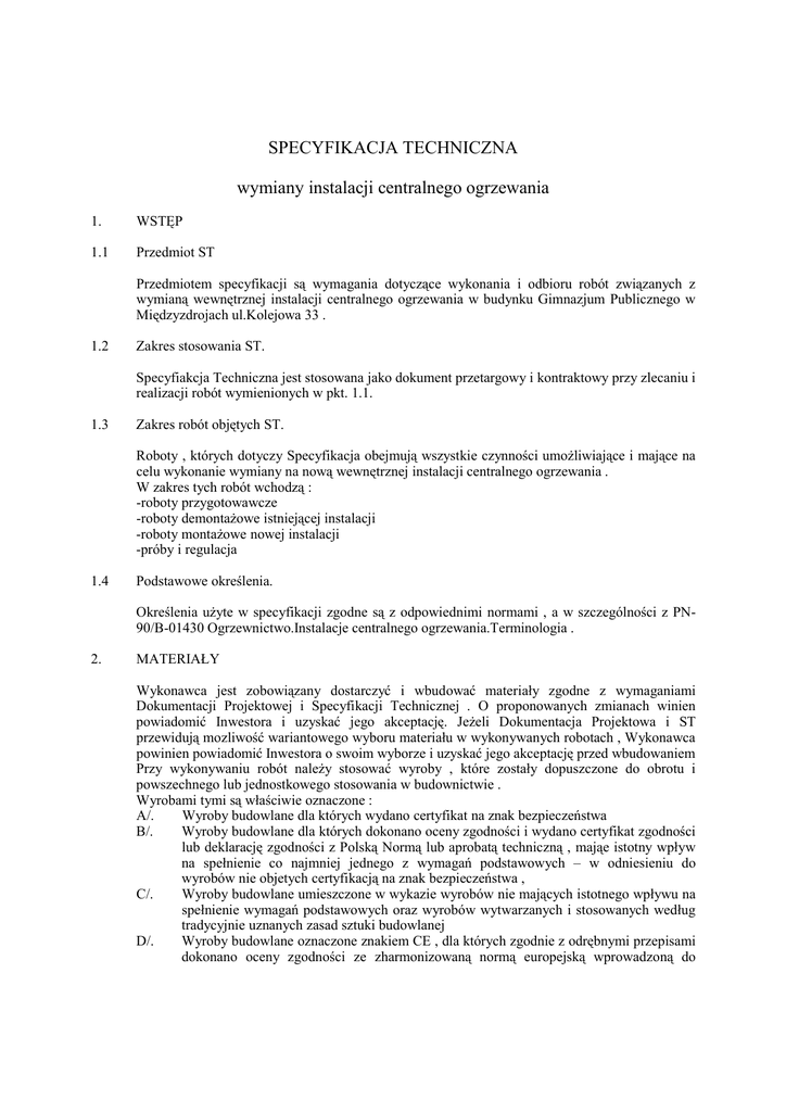 SPECYFIKACJA TECHNICZNA wymiany instalacji centralnego