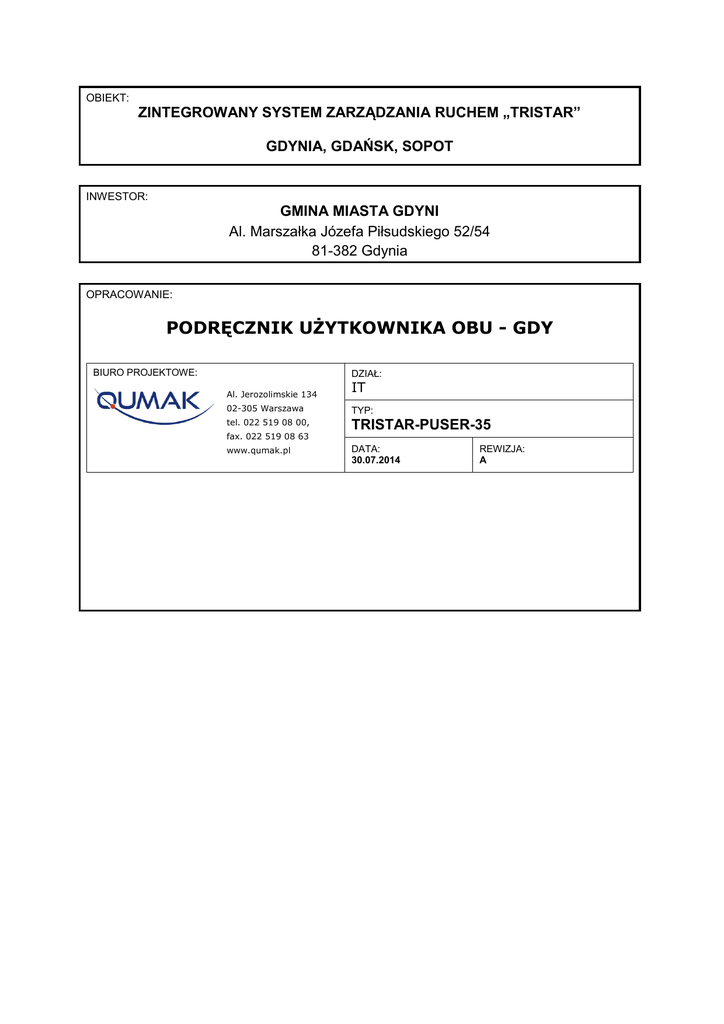 OBIEKT: ZINTEGROWANY SYSTEM ZARZĄDZANIA RUCHEM „TRISTAR” GDYNIA, GDAŃSK, SOPOT INWESTOR: GMINA MIASTA GDYNI Al. Marszałka Józefa Piłsudskiego 52/54 81-382 Gdynia OPRACOWANIE: PODRĘCZNIK UŻYTKOWNIKA OBU - GDY DZIAŁ: BIURO PROJEKTOWE: Al. Jerozolimskie 134 IT 02-305 Warszawa TYP: tel. 022 519 08 00, TRISTAR-PUSER-35 fax. 022 519 08 63 www.qumak.pl DATA: 30.07.2014 REWIZJA: A ZINTEGROWANY SYSTEM ZARZĄDZANIA RUCHEM „TRISTAR” Podręcznik użytkownika OBU - GDY 2 ZINTEGROWANY SYSTEM ZARZĄDZANIA RUCHEM „TRISTAR” Podręcznik użytkownika OBU - GDY Spis treści 1. WPROWADZENIE .............................................................................................................................. 5 1.1. CEL ......................................................................................................................................... 5 2. WPROWADZENIE – MENU GŁÓWNE.................................................................................................... 5 2.1. TRYB DZIEŃ / NOC .................................................................................................................. 6 3. WPROWADZANIE INFORMACJI W CELU ZALOGOWANIA ...................................................................... 7 3.1. WPROWADZANIE KODU ZADANIA PRZEWOZOWEGO ................................................................. 7 3.2. ZMIANA KODU ZADANIA PRZEWOZOWEGO .............................................................................. 8 4. WYLOGOWYWANIE ......................................................................................................................... 10 5. STAN OBU ...................................................................................................................................... 11 5.1. KOMUNIKACJA GPRS.............................................................................................................. 11 5.2. SYGNAŁ GPS ......................................................................................................................... 11 5.3. INFORMACJA O NADSPIESZENIU/OPÓŹNIENIU ........................................................................ 12 6. OPCJE W MENU KIEROWCY.............................................................................................................. 14 6.1. JAK WYSŁAĆ WIADOMOŚĆ PREDEFINIOWANĄ......................................................................... 14 6.2. ODCZYTYWANIE ODEBRANYCH WIADOMOŚCI......................................................................... 15 6.3. ODBIERANIE WIADOMOŚCI.................................................................................................... 16 7. NAJCZĘŚCIEJ ZADAWANE PYTANIA .................................................................................................. 18 7.1. NIE OTRZYMANO ZADANIA PRZEWOZOWEGO ......................................................................... 18 7.2. BŁĄD GPS ............................................................................................................................. 18 7.3. NIE WŁĄCZA SIĘ EKRAN DOTYKOWY ...................................................................................... 18 7.4. EKRAN NIE REAGUJE NA DOTYK ............................................................................................. 18 7.5. PANELE NA ULICACH NIE POKAZUJĄ REALNEGO CZASU PRZYJAZDU AUTOBUSU ....................... 18 7.6. OBU NIEUSTANNIE SIĘ RESTARTUJE....................................................................................... 18 7.7. LINIA LUB BRYGADA SĄ NIEWŁAŚCIWE .................................................................................. 18 7.8. NIE MOŻNA WYSŁAĆ WIADOMOŚCI ........................................................................................ 19 7.9. INFORMACJA O ODCHYLENIU (OPÓŹNIENIE, NADSPIESZENIE) JEST NIEPRAWIDŁOWA.............. 19 3 ZINTEGROWANY SYSTEM ZARZĄDZANIA RUCHEM „TRISTAR” Podręcznik: OBU z Ekranem Dotykowym. Podręcznik dla kierującego GDY Lista tabel i rysunków Rysunek 1 menu główne ...................................................................................................... 5 Rysunek 2 Menu Kierowcy .................................................................................................... 5 Rysunek 3 Tryb dzień/noc .................................................................................................... 6 Rysunek 4 Menu Kierowcy .................................................................................................... 7 Rysunek 5 Menu logowania ................................................................................................... 7 Rysunek 6 Opcja wprowadzenia brygady i linii ........................................................................ 8 Rysunek 7 Menu Kierowcy .................................................................................................... 8 Rysunek 8 Aktualna informacja o brygadzie i linii .................................................................... 8 Rysunek 9 Opcja zmiany brygady i linii .................................................................................. 9 Rysunek 10 Menu Kierowcy ................................................................................................. 10 Rysunek 11 Wylogowanie .................................................................................................... 10 Rysunek 12 Ekran główny ................................................................................................... 11 Rysunek 13 Ekran główny ................................................................................................... 11 Rysunek 14 Przyjazd o czasie .............................................................................................. 12 Rysunek 15 Opóźnienie wynoszące 1 minutę ......................................................................... 12 Rysunek 16 Nadspieszenie 3 