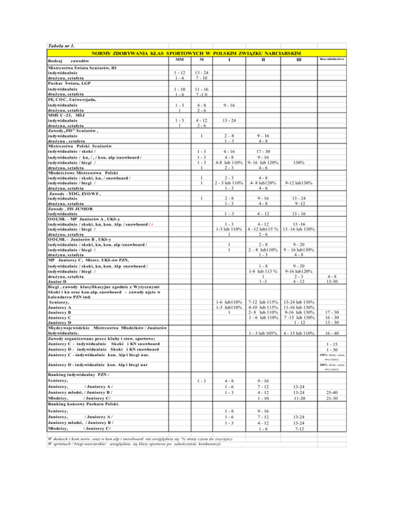 Tabela nr 1. NORMY ZDOBYWANIA KLAS SPORTOWYCH W POLSKIM ZWIĄZKU NARCIARSKIM Rodzaj zawodów Mistrzostwa Świata Seniorów, IO indywidualnie drużyna, sztafeta Puchar Świata, LGP indywidualnie drużyna, sztafeta PE, CO C, Uniwersjada, indywidualnie drużyna, sztafeta MMŚ U -23, MŚJ indywidualnie drużyna, sztafeta Zawody„FIS” Seniorów , indywidualnie drużyna , sztafeta Mistrzostwa Polski Seniorów indywidualnie / skoki / indywidualnie / kn, / , / kon. alp /snowboard / indywidualnie / biegi / drużyna, sztafeta Młodzieżowe Mistrzostwa Polski indywidualnie / skoki, kn, / snowboard / indywidualnie / biegi / drużyna, sztafeta Zawody – YOG, EYO WF , indywidualnie drużyna, sztafeta Zawody , FIS JUNIO R indywidualnie O O LMŁ – MP Juniorów A , UKS-y indywidualnie / skoki, kn, kon. Alp. / snowboard / / indywidualnie / biegi / drużyna, sztafeta O O LMŁ - Juniorów B , UKS-y indywidualnie / skoki, kn, kon. alp /snowboard / indywidualnie / biegi / drużyna, sztafeta MP Juniorzy C, Mistrz. UKS-ów PZN, MM M 1 - 12 1-6 13 - 24 7 - 10 1 - 10 1-6 11 - 16 7 -1 0 1-3 1 4-8 2-6 9 - 16 1-3 1 4 - 12 2-6 13 - 24 1 2–8 1–3 9 – 16 4-8 1-3 1-3 1-3 1 4 - 16 4-8 4-8 lub 110% 2-3 17 - 30 9 - 16 9- 16 lub 120% 4-6 1 1 2-3 2 - 3 lub 110% 1-3 4-8 4- 8 lub120% 4-6 9-12 lub130% 1 2-8 1-3 9 - 16 4-8 13 - 24 9 -12 1–3 4 – 12 13 - 16 I 1-3 1-3 lub 110% 1 1 1 indywidualnie / skoki, kn, kon. Alp snowboard / indywidualnie / biegi / drużyna, sztafeta Junior D Biegi , zawody klasyfikacyjne zgodnie z Wytycznymi Skoki i kn oraz kon.alp, snowboard - zawody ujęte w kalendarzu PZN ind. Seniorzy, Juniorzy A Juniorzy B Juniorzy C Juniorzy D Międzywojewódzkie Mistrzostwa Młodzików / Juniorów Indywidualnie. Zawody organizowane przez kluby i stow. sportowe; Juniorzy C - indywidualnie Skoki i KN snowboard Juniorzy D – indywidualnie Skoki i KN snowboard Juniorzy C - indywidualnie kon. Alp i biegi nar. 1-6 lub110% 1-3 lub110% 1 II III klasa młodzieżowa 130% 4 - 12 13 -16 4 –12 lub115`% 13 -16 lub 130% 2-6 2-8 2 – 8 lub110% 1-3 9 - 20 9 – 16 lub130% 4-8 1-8 1-8 lub 113 % 1 1 -3 9 - 20 9-16 lub120% 2-3 4 - 12 4-8 13-30 lub 115% lub 115% lub 110% lub 110% 13-24 lub 130% 11-16 lub 130% 9-16 lub 130% 7 -15 lub 130% 1 - 12 17 - 30 16 - 30 13 - 30 1 - 3 lub 105% 4 - 15 lub 110% 16 - 40 7-12 4-10 2- 8 1-6 1 - 15 1 - 30 150% straty czasu zwy cięscy Juniorzy D - indywidualnie kon. Alp i biegi nar 180% straty czasu zwy cięscy Ranking indywidualny PZN : Seniorzy, Juniorzy, / Juniorzy A / Juniorzy młodsi, / Juniorzy B / Młodzicy, / Juniorzy C/ Ranking końcowy Pucharu Polski . Seniorzy, Juniorzy, / Juniorzy A / Juniorzy młodsi, / Juniorzy B / Młodzicy, / Juniorzy C/ 1-3 4-8 1-6 1-3 9 - 16 7 - 12 4 - 12 1 - 10 13-24 13-24 11-20 1-8 1-6 1-3 9 - 16 7 - 12 4 - 12 1-6 13-24 13-24 7-12 W skokach i kom.norw. oraz w kon.alp i snowboard nie uwzględnia się % straty czasu do zwycięscy. W sprintach / biegi narciarskie/ uwzględnia się klasy sportowe po zakończeniu konkurencji. 25-40 21-30