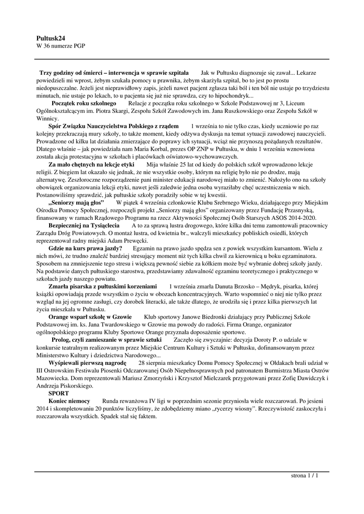 Pultusk24 W 36 numerze PGP Trzy godziny od śmierci – interwencja w sprawie szpitala Jak w Pułtusku diagnozuje się zawał... Lekarze powiedzieli mi wprost, żebym szukała pomocy u prawnika, żebym skarżyła szpital, bo to jest po prostu niedopuszczalne. Jeżeli jest nieprawidłowy zapis, jeżeli nawet pacjent zgłasza taki ból i ten ból nie ustaje po trzydziestu minutach, nie ustaje po lekach, to u pacjenta się już nie sprawdza, czy to hipochondryk... Początek roku szkolnego Relacje z początku roku szkolnego w Szkole Podstawowej nr 3, Liceum Ogólnokształcącym im. Piotra Skargi, Zespołu Szkół Zawodowych im. Jana Ruszkowskiego oraz Zespołu Szkół w Winnicy. Spór Związku Nauczycielstwa Polskiego z rządem 1 września to nie tylko czas, kiedy uczniowie po raz kolejny przekraczają mury szkoły, to także moment, kiedy odżywa dyskusja na temat sytuacji zawodowej nauczycieli. Prowadzone od kilku lat działania zmierzające do poprawy ich sytuacji, wciąż nie przynoszą pożądanych rezultatów. Dlatego właśnie – jak powiedziała nam Maria Korbal, prezes OP ZNP w Pułtusku, w dniu 1 września wznowiona została akcja protestacyjna w szkołach i placówkach oświatowo-wychowawczych. Za mało chętnych na lekcje etyki Mija właśnie 25 lat od kiedy do polskich szkół wprowadzono lekcje religii. Z biegiem lat okazało się jednak, że nie wszystkie osoby, którym na religię było nie po drodze, mają alternatywę. Zeszłoroczne rozporządzenie pani minister edukacji narodowej miało to zmienić. Nałożyło ono na szkoły obowiązek organizowania lekcji etyki, nawet jeśli zaledwie jedna osoba wyraziłaby chęć uczestniczenia w nich. Postanowiliśmy sprawdzić, jak pułtuskie szkoły poradziły sobie w tej kwestii. „Seniorzy mają głos” W piątek 4 września członkowie Klubu Srebrnego Wieku, działającego przy Miejskim Ośrodku Pomocy Społecznej, rozpoczęli projekt „Seniorzy mają głos” organizowany przez Fundację Przasnyską, finansowany w ramach Rządowego Programu na rzecz Aktywności Społecznej Osób Starszych ASOS 2014-2020. Bezpieczniej na Tysiąclecia A to za sprawą lustra drogowego, które kilka dni temu zamontowali pracownicy Zarządu Dróg Powiatowych. O montaż lustra, od kwietnia br., walczyli mieszkańcy pobliskich osiedli, których reprezentował radny miejski Adam Prewęcki. Gdzie na kurs prawa jazdy? Egzamin na prawo jazdo spędza sen z powiek wszystkim kursantom. Wielu z nich mówi, że trudno znaleźć bardziej stresujący moment niż tych kilka chwil za kierownicą u boku egzaminatora. Sposobem na zmniejszenie tego stresu i większą pewność siebie za kółkiem może być wybranie dobrej szkoły jazdy. Na podstawie danych pułtuskiego starostwa, przedstawiamy zdawalność egzaminu teoretycznego i praktycznego w szkołach jazdy naszego powiatu. Zmarła pisarska z pułtuskimi korzeniami 1 września zmarła Danuta Brzosko – Mędryk, pisarka, której książki opowiadają przede wszystkim o życiu w obozach koncentracyjnych. Warto wspomnieć o niej nie tylko przez wzgląd na jej ogromne zasługi, czy dorobek literacki, ale także dlatego, że urodziła się i przez kilka pierwszych lat życia mieszkała w Pułtusku. Orange wsparł szkołę w Gzowie Klub sportowy Janowe Biedronki działający przy Publicznej Szkole Podstawowej im. ks. Jana Twardowskiego w Gzowie ma powody do radości. Firma Orange, organizator ogólnopolskiego programu Kluby Sportowe Orange przyznała doposażenie sportowe. Prolog, czyli zamieszanie w sprawie sztuki Zaczęło się zwyczajnie: decyzja Doroty P. o udziale w konkursie teatralnym realizowanym przez Miejskie Centrum Kultury i Sztuki w Pułtusku, dofinansowanym przez Ministerstwo Kultury i dziedzictwa Narodowego... Wyśpiewali pierwszą nagrodę 28 sierpnia mieszkańcy Domu Pomocy Społecznej w Ołdakach brali udział w III Ostrowskim Festiwalu Piosenki Odczarowanej Osób Niepełnosprawnych pod patronatem Burmistrza Miasta Ostrów Mazowiecka. Dom reprezentowali Mariusz Zmorzyński i Krzysztof Mielczarek przygotowani przez Zofię Dawidczyk i Andrzeja Piskorskiego. SPORT Koniec niemocy Runda rewanżowa IV ligi w poprzednim sezonie przyniosła wiele rozczarowań. Po jesieni 2014 i skompletowaniu 20 punktów liczyliśmy, że zdobędziemy miano „rycerzy wiosny”. Rzeczywistość zaskoczyła i rozczarowała wszystkich. Spadek stał się faktem. strona 1 / 1