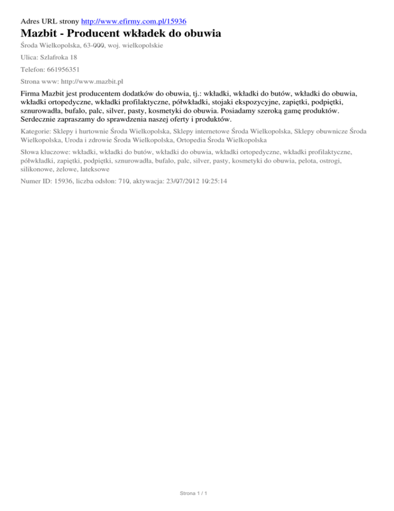 Adres URL strony http://www.efirmy.com.pl/15936 Mazbit - Producent wkładek do obuwia Środa Wielkopolska, 63-000, woj. wielkopolskie Ulica: Szlafroka 18 Telefon: 661956351 Strona www: http://www.mazbit.pl Firma Mazbit jest producentem dodatków do obuwia, tj.: wkładki, wkładki do butów, wkładki do obuwia, wkładki ortopedyczne, wkładki profilaktyczne, półwkładki, stojaki ekspozycyjne, zapiętki, podpiętki, sznurowadła, bufalo, palc, silver, pasty, kosmetyki do obuwia. Posiadamy szeroką gamę produktów. Serdecznie zapraszamy do sprawdzenia naszej oferty i produktów. Kategorie: Sklepy i hurtownie Środa Wielkopolska, Sklepy internetowe Środa Wielkopolska, Sklepy obuwnicze Środa Wielkopolska, Uroda i zdrowie Środa Wielkopolska, Ortopedia Środa Wielkopolska Słowa kluczowe: wkładki, wkładki do butów, wkładki do obuwia, wkładki ortopedyczne, wkładki profilaktyczne, półwkładki, zapiętki, podpiętki, sznurowadła, bufalo, palc, silver, pasty, kosmetyki do obuwia, pelota, ostrogi, silikonowe, żelowe, lateksowe Numer ID: 15936, liczba odsłon: 710, aktywacja: 23/07/2012 10:25:14 Strona 1 / 1