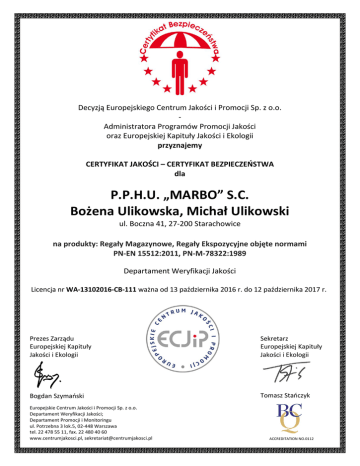 Decyzją Europejskiego Centrum Jakości i Promocji Sp. z o.o. Administratora Programów Promocji Jakości oraz Europejskiej Kapituły Jakości i Ekologii przyznajemy CERTYFIKAT JAKOŚCI – CERTYFIKAT BEZPIECZEŃSTWA dla P.P.H.U. „MARBO” S.C. Bożena Ulikowska, Michał Ulikowski ul. Boczna 41, 27-200 Starachowice na produkty: Regały Magazynowe, Regały Ekspozycyjne objęte normami PN-EN 15512:2011, PN-M-78322:1989 Departament Weryfikacji Jakości Licencja nr WA-13102016-CB-111 ważna od 13 października 2016 r. do 12 października 2017 r. Prezes Zarządu Europejskiej Kapituły Jakości i Ekologii Sekretarz Europejskiej Kapituły Jakości i Ekologii Bogdan Szymaoski Tomasz Staoczyk Europejskie Centrum Jakości i Promocji Sp. z o.o. Departament Weryfikacji Jakości; Departament Promocji i Monitoringu ul. Potrzebna 3 lok.5, 02-448 Warszawa tel. 22 478 55 11, fax. 22 480 40 60 www.centrumjakosci.pl, [email protected] ACCREDITATION NO.0112
