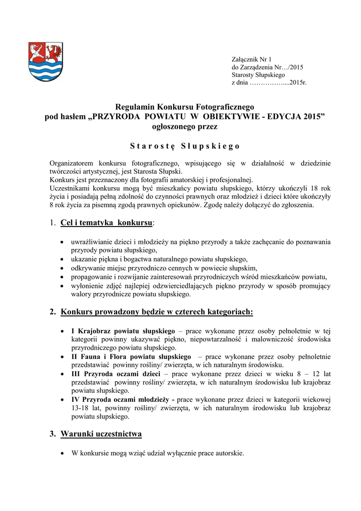 Załącznik Nr 1 do Zarządzenia Nr…/2015 Starosty Słupskiego z dnia ……………....2015r. Regulamin Konkursu Fotograficznego pod hasłem „PRZYRODA POWIATU W OBIEKTYWIE - EDYCJA 2015” ogłoszonego przez Starostę Słupskiego Organizatorem konkursu fotograficznego, wpisującego się w działalność w dziedzinie twórczości artystycznej, jest Starosta Słupski. Konkurs jest przeznaczony dla fotografii amatorskiej i profesjonalnej. Uczestnikami konkursu mogą być mieszkańcy powiatu słupskiego, którzy ukończyli 18 rok życia i posiadają pełną zdolność do czynności prawnych oraz młodzież i dzieci które ukończyły 8 rok życia za pisemną zgodą prawnych opiekunów. Zgodę należy dołączyć do zgłoszenia. 1. Cel i tematyka konkursu: uwrażliwianie dzieci i młodzieży na piękno przyrody a także zachęcanie do poznawania przyrody powiatu słupskiego, ukazanie piękna i bogactwa naturalnego powiatu słupskiego, odkrywanie miejsc przyrodniczo cennych w powiecie słupskim, propagowanie i rozwijanie zainteresowań przyrodniczych wśród mieszkańców powiatu, wyłonienie zdjęć najlepiej odzwierciedlających piękno przyrody w sposób promujący walory przyrodnicze powiatu słupskiego. 2. Konkurs prowadzony będzie w czterech kategoriach: I Krajobraz powiatu słupskiego – prace wykonane przez osoby pełnoletnie w tej kategorii powinny ukazywać piękno, niepowtarzalność i malowniczość środowiska przyrodniczego powiatu słupskiego. II Fauna i Flora powiatu słupskiego – prace wykonane przez osoby pełnoletnie przedstawiać powinny rośliny/ zwierzęta, w ich naturalnym środowisku. III Przyroda oczami dzieci – prace wykonane przez dzieci w wieku 8 – 12 lat przedstawiać powinny rośliny/ zwierzęta, w ich naturalnym środowisku lub krajobraz powiatu słupskiego. IV Przyroda oczami młodzieży - prace wykonane przez dzieci w kategorii wiekowej 13-18 lat, powinny rośliny/ zwierzęta, w ich naturalnym środowisku lub krajobraz powiatu słupskiego. 3. Warunki uczestnictwa W konkursie mogą wziąć udział wyłącznie prace autorskie. W konkursie nie mogą brać udziału członkowie Komisji Konkursowej oraz ich osoby bliskie. Uczestnik konkursu może zgłosić maksymalnie 5 zdjęć z jednej kategorii w formacie 15 x 21 cm. Dodatkowo w wersji elektronicznej należy dołączyć plik źródłowy (lub negatyw), tak aby można było wykonać większy format zdjęcia. Każde zdjęcie należy na odwrocie podpisać: imieniem i nazwiskiem autora, tytułem, wskazaniem kategorii tematycznej oraz informacją na temat miejsca i daty wykonania zdjęcia. Zdjęcia przyrodnicze muszą być wykonane w sposób uwzględniający zasady ochrony zwierząt wynikających z ustawy z dnia 16 kwietnia 2004 r. o ochronie przyrody. Udział w konkursie wezmą osoby, które do dnia 30 września 2015 r. złożą osobiście w Biurze Obsługi Interesanta lub nadeślą drogą pocztową swoje prace wraz z kartą zgłoszeniową na adres: Starostwo Powiatowe w Słupsku Wydział Środowiska i Rolnictwa ul. Szarych Szeregów 14 76-200 Słupsk z dopiskiem: Konkurs fotograficzny – „Przyroda powiatu w obiektywie - edycja 2015” Do zdjęć należy dołączyć wypełnioną i podpisaną kartę zgłoszenia uczestnika oraz w przypadku dzieci i młodzieży pisemną zgodą rodziców, które stanowią załącznik do niniejszego Regulaminu. 4. Organizacja konkursu Konkurs rozstrzygnięty zostanie przez Komisję Konkursową. Werdykt komisji konkursowej jest ostateczny i nie podlega odwołaniu. Wyniki konkursu zostaną podane do publicznej wiadomości na stronie: www.powiat.slupsk.pl po upływie 30 dni licząc od dnia zakończenia przyjmowania prac konkursowych. 5. Nagrody Przewiduje się przyznanie nagród w każdej z 4 kategorii tematycznych, w wysokości: I miejsce – 500 zł II miejsce – 300 zł III miejsce – 200 zł z zastrzeżeniem, iż nagrody w kategorii III i IV przyznawane będą w formie rzeczowej. Organizator zastrzega sobie prawo do przyznania nagród równorzędnych. Wszystkie nagrodzone prace zostaną zaprezentowane na wystawie podczas uroczystego wręczenia nagród. Organizatorzy zastrzegają sobie prawo zaprezentowania również innych, nienagrodzonych prac. Uroczyste podsumowanie konkursu oraz wręczenie nagród odbędzie się w Starostwie Powiatowym w Słupsku. O terminie laureaci powiadomieni zostaną drogą pocztową. 6. Inne postanowienia Prace nadesłane w konkursie przechodzą na własność organizatora konkursu. Udział w konkursie jest równoznaczny z wyrażeniem zgody uczestnika konkursu na przekazanie organizatorom majątkowych praw autorskich do fotografii i na ich bezpłatne wykorzystywanie w celach promocyjnych na zasadach określonych w niniejszym punkcie (udzielenie licencji). Zgoda na korzystanie z fotografii obejmuje następujące pola eksploatacji: prasę, radio, rozpowszechnianie w sieci Internet, materiały drukowane (w tym Biuletyn Powiat Słupski), wystawy, konferencje, targi i inne imprezy specjalne, skierowane do społeczeństwa. Upoważnienie do korzystania z fotografii na wszystkich wyżej wymienionych polach eksploatacji następuje nieodpłatnie. Ustalenia określone w niniejszym regulaminie uczestnik konkursu akceptuje przez złożenie stosownego oświadczenia woli w formie pisemnej na karcie zgłoszenia. Regulamin niniejszy jest jedynym dokumentem określającym zasady konkursu. Organizatorzy nie ponoszą odpowiedzialności za uszkodzenie lub zaginięcie prac z winy poczty lub nadawcy. Organizatorzy zastrzegają sobie możliwość dokonania zmian w niniejszym Regulaminie.
