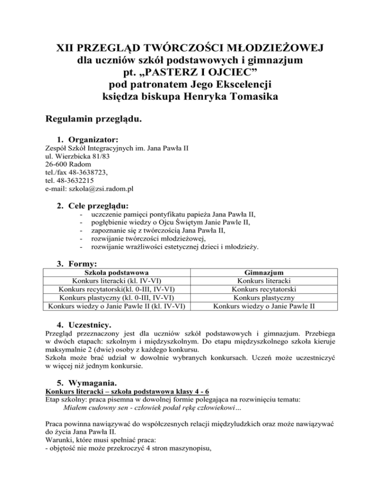XII PRZEGLĄD TWÓRCZOŚCI MŁODZIEŻOWEJ dla uczniów szkół podstawowych i gimnazjum pt. „PASTERZ I OJCIEC” pod patronatem Jego Ekscelencji księdza biskupa Henryka Tomasika Regulamin przeglądu. 1. Organizator: Zespół Szkół Integracyjnych im. Jana Pawła II ul. Wierzbicka 81/83 26-600 Radom tel./fax 48-3638723, tel. 48-3632215 e-mail: [email protected] 2. Cele przeglądu: - uczczenie pamięci pontyfikatu papieża Jana Pawła II, pogłębienie wiedzy o Ojcu Świętym Janie Pawle II, zapoznanie się z twórczością Jana Pawła II, rozwijanie twórczości młodzieżowej, rozwijanie wrażliwości estetycznej dzieci i młodzieży. 3. Formy: Szkoła podstawowa Konkurs literacki (kl. IV-VI) Konkurs recytatorski(kl. 0-III, IV-VI) Konkurs plastyczny (kl. 0-III, IV-VI) Konkurs wiedzy o Janie Pawle II (kl. IV-VI) Gimnazjum Konkurs literacki Konkurs recytatorski Konkurs plastyczny Konkurs wiedzy o Janie Pawle II 4. Uczestnicy. Przegląd przeznaczony jest dla uczniów szkół podstawowych i gimnazjum. Przebiega w dwóch etapach: szkolnym i międzyszkolnym. Do etapu międzyszkolnego szkoła kieruje maksymalnie 2 (dwie) osoby z każdego konkursu. Szkoła może brać udział w dowolnie wybranych konkursach. Uczeń może uczestniczyć w więcej niż jednym konkursie. 5. Wymagania. Konkurs literacki – szkoła podstawowa klasy 4 - 6 Etap szkolny: praca pisemna w dowolnej formie polegająca na rozwinięciu tematu: Miałem cudowny sen - człowiek podał rękę człowiekowi… Praca powinna nawiązywać do współczesnych relacji międzyludzkich oraz może nawiązywać do życia Jana Pawła II. Warunki, które musi spełniać praca: - objętość nie może przekroczyć 4 stron maszynopisu, - czcionka 14, - kryteria oceny: ujęcie tematu, oryginalność, zgodność z faktami, poprawność stylistyczna, - praca w formie wydruku (nie rękopis). - stopka w nagłówku pracy powinna zawierać: imię i nazwisko ucznia, klasę, nazwę i adres szkoły, dane opiekuna, temat pracy. Do etapu międzyszkolnego każda szkoła może zgłosić dwie prace. Konkurs literacki – gimnazjum Etap szkolny: praca pisemna w dowolnej formie polegająca na rozwinięciu tematu: Ludzi można spostrzec, zamykając oczy. Praca powinna nawiązywać do współczesnych relacji międzyludzkich oraz może nawiązywać do życia Jana Pawła II. Warunki, które musi spełniać praca: - objętość nie może przekroczyć 4 stron maszynopisu, - czcionka 14, - kryteria oceny: ujęcie tematu, oryginalność, zgodność z faktami, poprawność stylistyczna, - praca w formie wydruku (nie rękopis), - stopka w nagłówku pracy powinna zawierać: imię i nazwisko ucznia, klasę, nazwę i adres szkoły, dane opiekuna, temat pracy. Do etapu międzyszkolnego każda szkoła może zgłosić dwie prace. Konkurs recytatorski – szkoła podstawowa i gimnazjum Etap szkolny: recytacja 1 (jednego) dowolnego utworu z twórczości Karola Wojtyły i 1 (jednego) o Janie Pawle II (czas recytacji - max 5 minut). Do etapu międzyszkolnego szkoła może zgłosić po 2 (dwóch) uczniów z każdej kategorii wiekowej (kl. 0 - III, IV - VI, gimnazjum). Konkurs plastyczny – szkoła podstawowa i gimnazjum Konkurs odbywa się w trzech grupach wiekowych: 0 – III, IV – VI, gimnazjum. Etap szkolny: * dla klas 0 - III szkoły podstawowej: Temat: Cuda Pana Jezusa Pan Jezus okazywał miłosierdzie ludziom poprzez liczne cuda. Można tu wymienić chociaż niektóre, takie jak cud w Kanie Galilejskiej, rozmnożenie chleba i ryb, by móc nakarmić zebrany tłum, uzdrawianie chorych, wskrzeszenie Łazarza, ustanowienie Eucharystii podczas Ostatniej Wieczerzy i ostatecznie Zmartwychwstanie. Jan Paweł II pisał „Miłosierdzie czynów nadaje nieodpartą moc miłosierdziu słów” (list Apostolski Novo Milennio Ineunte 6.01.01). Rok 2016 został ogłoszony przez papieża Franciszka Rokiem Miłosierdzia – współczucia i bezinteresownej pomocy. Pan Jezus był czuły na cierpienie, problemy i niedostatki ludzi. W tym roku zachęcamy Was do wykonania pracy plastycznej, której celem jest ukazanie jednego z licznych cudów Pana Jezusa. Technika i format prac dowolny. * dla klas IV – VI szkoły podstawowej Temat: Jak być wrażliwym i miłosiernym? Jan Paweł II zwraca uwagę na akty miłosierdzia: „Potrzeba wyobraźni miłosierdzia, aby przyjść z pomocą dziecku zaniedbanemu duchowo i materialnie, aby nie odwracać się od chłopca czy dziewczyny, którzy zagubili się w świecie różnorakich uzależnień lub przestępstwa, aby nieść radę, pocieszenie, duchowe i moralne wsparcie tym, którzy podejmują wewnętrzną walkę ze złem.” Postawione w temacie pytanie odnosi się do codziennej ludzkiej pomocy, która może skupiać się na rozmowie, czynie miłosiernym, modlitwie, poście czy jałmużnie. W tegorocznej edycji konkursu kierujemy uwagę na to, komu i jak możemy pomóc. Technika i format prac dowolny. * Dla klas gimnazjalnych Temat: Moja młodość – chrześcijańskie ideały – plakat Jan Paweł II zachęcał młodych: „Nie popadajcie w przeciętność, nie ulegajcie dyktatom zmieniającej się mody, która narzuca styl życia niezgodny z chrześcijańskimi ideałami, nie pozwólcie się mamić złudzeniom konsumizmu. Chrystus wzywa was do rzeczy wielkich. Nie sprawcie Mu zawodu, bo w ten sposób wy sami spotkalibyście się z zawodem.” (Przemówienie pożegnalne do młodzieży, Częstochowa, 15.08.1991 r.) W tym roku zachęcamy Was do wykonania plakatu ukazującego m.in. marzenia, pragnienia oraz potrzeby młodości w duchu chrześcijańskiego powołania. Technika i format prac dowolny. Prac nie należy oprawiać. Każda praca powinna być na odwrocie opatrzona tabliczką zawierającą: tytuł pracy, imię i nazwisko autora, wiek, imię i nazwisko opiekuna, nazwę i adres szkoły wraz z telefonem. Do etapu międzyszkolnego szkoła przekazuje po 2 (dwie) prace z każdej grupy wiekowej. Konkurs wiedzy o Papieżu Janie Pawle II – szkoła pods
