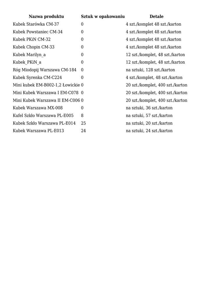 Nazwa produktu Sztuk w opakowaniu Detale Kubek Starówka CM-37 0 4 szt./komplet 48 szt./karton Kubek Powstaniec CM-34 0 4 szt./komplet 48 szt./karton Kubek PKiN CM-32 0 4 szt./komplet 48 szt./karton Kubek Chopin CM-33 0 4 szt./komplet 48 szt./karton Kubek Marilyn_a 0 12 szt./komplet, 48 szt./karton Kubek_PKiN_a 0 12 szt./komplet, 48 szt./karton Róg Miodopij Warszawa CM-184 0 na sztuki, 128 szt./karton Kubek Syrenka CM-C224 0 4 szt./komplet, 48 szt./karton Mini kubek EM-B002-1,2 Łowickie 0 20 szt./komplet, 400 szt./karton Mini Kubek Warszawa I EM-C078 0 20 szt./komplet, 400 szt./karton Mini Kubek Warszawa II EM-C006 0 20 szt./komplet, 400 szt./karton Kubek Warszawa MX-008 0 na sztuki, 36 szt./karton Kufel Szkło Warszawa PL-E005 8 na sztuki, 57 szt./karton Kubek Szkło Warszawa PL-E014 25 na sztuki, 20 szt./karton Kubek Warszawa PL-E013 24 na sztuki, 24 szt./karton