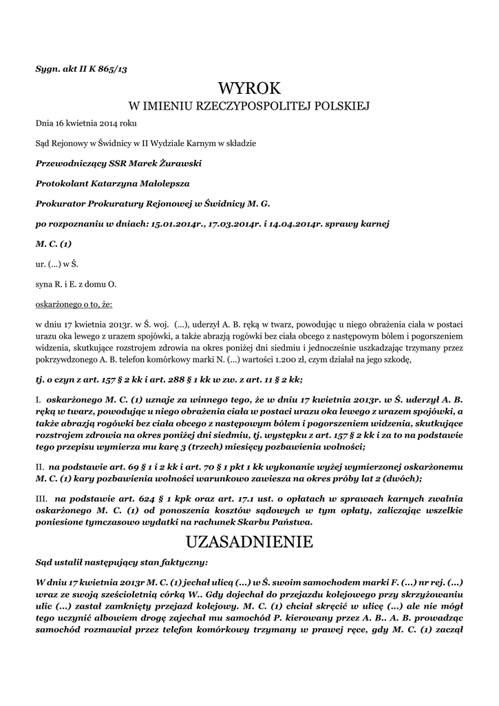 Sygn. akt II K 865/13 WYROK W IMIENIU RZECZYPOSPOLITEJ POLSKIEJ Dnia 16 kwietnia 2014 roku Sąd Rejonowy w Świdnicy w II Wydziale Karnym w składzie Przewodniczący SSR Marek Żurawski Protokolant Katarzyna Małolepsza Prokurator Prokuratury Rejonowej w Świdnicy M. G. po rozpoznaniu w dniach: 15.01.2014r., 17.03.2014r. i 14.04.2014r. sprawy karnej M. C. (1) ur. (...) w Ś. syna R. i E. z domu O. oskarżonego o to, że: w dniu 17 kwietnia 2013r. w Ś. woj. (...), uderzył A. B. ręką w twarz, powodując u niego obrażenia ciała w postaci urazu oka lewego z urazem spojówki, a także abrazją rogówki bez ciała obcego z następowym bólem i pogorszeniem widzenia, skutkujące rozstrojem zdrowia na okres poniżej dni siedmiu i jednocześnie uszkadzając trzymany przez pokrzywdzonego A. B. telefon komórkowy marki N. (...) wartości 1.200 zł, czym działał na jego szkodę, tj. o czyn z art. 157 § 2 kk i art. 288 § 1 kk w zw. z art. 11 § 2 kk; I. oskarżonego M. C. (1) uznaje za winnego tego, że w dniu 17 kwietnia 2013r. w Ś. uderzył A. B. ręką w twarz, powodując u niego obrażenia ciała w postaci urazu oka lewego z urazem spojówki, a także abrazją rogówki bez ciała obcego z następowym bólem i pogorszeniem widzenia, skutkujące rozstrojem zdrowia na okres poniżej dni siedmiu, tj. występku z art. 157 § 2 kk i za to na podstawie tego przepisu wymierza mu karę 3 (trzech) miesięcy pozbawienia wolności; II. na podstawie art. 69 § 1 i 2 kk i art. 70 § 1 pkt 1 kk wykonanie wyżej wymierzonej oskarżonemu M. C. (1) kary pozbawienia wolności warunkowo zawiesza na okres próby lat 2 (dwóch); III. na podstawie art. 624 § 1 kpk oraz art. 17.1 ust. o opłatach w sprawach karnych zwalnia oskarżonego M. C. (1) od ponoszenia kosztów sądowych w tym opłaty, zaliczając wszelkie poniesione tymczasowo wydatki na rachunek Skarbu Państwa. UZASADNIENIE Sąd ustalił następujący stan faktyczny: W dniu 17 kwietnia 2013r M. C. (1) jechał ulicą (...) w Ś. swoim samochodem marki F. (...) nr rej. (...) wraz ze swoją sześcioletnią córką W.. Gdy dojechał do przejazdu kolejowego przy skrzyżowaniu ulic (...) zastał zamknięty przejazd kolejowy. M. C. (1) chciał skręcić w ulicę (...) ale nie mógł tego uczynić albowiem drogę zajechał mu samochód P. kierowany przez A. B.. A. B. prowadząc samochód rozmawiał przez telefon komórkowy trzymany w prawej ręce, gdy M. C. (1) zaczął hamować i zatrąbił na niego, A. B. przełożył telefon do lewej reki, wyciągnął w kierunku M. C. (1) prawą rękę i tą ręką pokazał mu środkowy palec. Widząc ten gest, M. C. (1) wysiadł ze swojego samochodu i podszedł do pojazdu A. B. od strony kierowcy, mówiąc do niego „kupiłeś kurwa prawo jazdy, jeździć nie umiesz, wsadź se tego palca do dupy” - po czym lewą ręką uderzył A. B. w twarz. A. B. powiedział do osoby z którą rozmawiał „o kurwa zaraz odzwonię”, po czym odłożył telefon na siedzenie pasażera. Następnie A. B. wysiadł ze swojego samochodu i usiłował uderzyć M. C. (1) pięścią w głowę, Wtedy samochód A. B. zaczął staczać się do tyłu na inne auta, co spowodowało, że A. B. wrócił do auta i zaciągnął w swoim samochodzie hamulec ręczny M. C. (1) wsiadł do swojego samochodu i chciał odjechać ale A. B. stanął przed samochodem M. C. (1) i zaczął robić mu zdjęcia swoim telefonem komórkowym, powiedział także, iż dzwoni na Policję. A. B. złożył stosowne zawiadomienie o przestępstwie w oparciu o które wszczęto stosowne postępowanie przygotowawcze. W toku postępowania ustalono w oparciu o opinię biegłego, iż A. B. w wyniku uderzenia doznał: urazu spojówki abrazji rogówki bez wzmianki o ciele obcym, bólu i pogorszenia widzenia okiem lewym, urazu oka lewego, naruszających czynności narządu ciała na okres poniżej dni siedmiu. Akt oskarżenia w niniejszej sprawie skierowano przeciwko M. C. (1) do Sądu Rejonowego w Świdnicy. Dowody: wyjaśnienia M. C. k; 24-25,38-39,44-45, zeznania A. B. / częściowo / k; 4, obdukcja lekarska k; 6,14, Oskarżony M. C. (1) w toku postępowania przygotowawczego jedynie częściowo przyznał się do zarzucanego mu czynu tj. przyznał się do uderzenia pokrzywdzonego - jednak uderzenia zadanego otwarta dłonią w czoło, a wykluczył aby uszkodził i to umyślnie telefon pokrzywdzonego. Oskarżony złożył wyjaśnienia zgodne z ustalonym stanem faktycznym. M. C. (1) był już uprzednio karany. Dowody: wyjaśnienia M. C. k; 24-25, 38-39,44-45,66,67, informacja z K. k; 32-33,91, Sąd zważył, co następuje: Sąd nie miał wątpliwości co do sprawstwa i winy odnośnie czynu z art. 157 § 2 kk. który zarzucono oskarżonemu w akcie oskarżenia, sąd powziął jednak poważne wątpliwości co do czynu z art. 288 § 1 kk zarzuconego M. C. (1) w ramach tzw. kumulatywnej kwalifikacji prawnej. Wątpliwości sądu wzięły się nie tylko z powodu niewiarygodnych, a wręcz pokrętnych zeznań pokrzywdzonego w tym zakresie, ale także z powodu braków dowodowych dotyczących tego czynu, które nie powinny zaistnieć jeżeli zarzuca się oskarżonemu przestępstwo umyślne. Ustalając stan faktyczny sprawy sąd oparł się przede wszystkim na wiarygodnych wyjaśnieniach oskarżonego, które są logiczne, spójne i konsekwentne. Wersja zdarzenia prezentowana przez oskarżonego doznaje wsparcia / nie jest sprzeczna / także ze strony zeznań świadka K. D., - jeżeli przyjmie się, iż A. B. korzystał w trakcie zajścia z jednego telefonu komórkowego, a jego rozmowa telefoniczna ze świadkiem D. została przerwana na skutek uderzenia pokrzywdzonego i wytrącenia mu telefonu, który upadł na wycieraczkę pasażera - lecz nie doznał uszkodzenia. Za niewiarygodne w części uznał sąd wyjaśnienia oskarżonego tam gdzie mówi on o uderzeniu pokrzywdzonego „otwartą ręka w czoło”. Wersja ta nie może się ostać wobec obdukcji lekarskiej oraz spójnej z ta obdukcją wersją