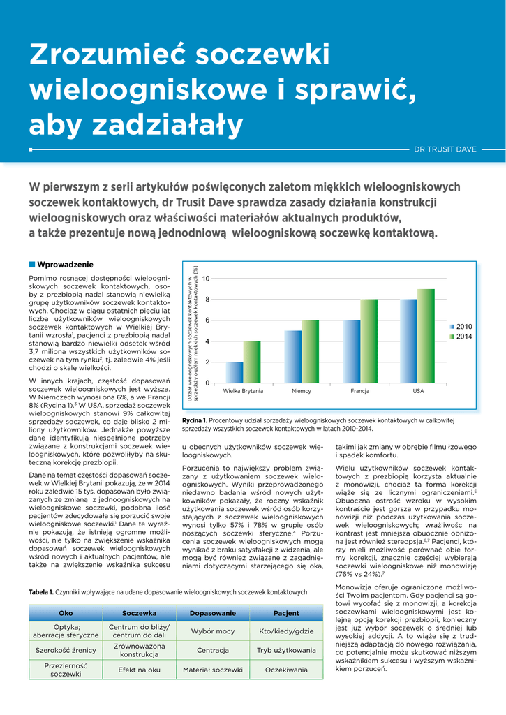 Zrozumieć soczewki wieloogniskowe i sprawić, aby zadziałały DR TRUSIT DAVE ■ Wprowadzenie Pomimo rosnącej dostępności wieloogniskowych soczewek kontaktowych, osoby z prezbiopią nadal stanowią niewielką grupę użytkowników soczewek kontaktowych. Chociaż w ciągu ostatnich pięciu lat liczba użytkowników wieloogniskowych soczewek kontaktowych w Wielkiej Brytanii wzrosła1, pacjenci z prezbiopią nadal stanowią bardzo niewielki odsetek wśród 3,7 miliona wszystkich użytkowników soczewek na tym rynku2, tj. zaledwie 4% jeśli chodzi o skalę wielkości. W innych krajach, częstość dopasowań soczewek wieloogniskowych jest wyższa. W Niemczech wynosi ona 6%, a we Francji 8% (Rycina 1).3 W USA, sprzedaż soczewek wieloogniskowych stanowi 9% całkowitej sprzedaży soczewek, co daje blisko 2 miliony użytkowników. Jednakże powyższe dane identyfikują niespełnione potrzeby związane z konstrukcjami soczewek wieloogniskowych, które pozwoliłyby na skuteczną korekcję prezbiopii. Dane na temat częstości dopasowań soczewek w Wielkiej Brytanii pokazują, że w 2014 roku zaledwie 15 tys. dopasowań było związanych ze zmianą z jednoogniskowych na wieloogniskowe soczewki, podobna ilość pacjentów zdecydowała się porzucić swoje wieloogniskowe soczewki.1 Dane te wyraźnie pokazują, że istnieją ogromne możliwości, nie tylko na zwiększenie wskaźnika dopasowań soczewek wieloogniskowych wśród nowych i aktualnych pacjentów, ale także na zwiększenie wskaźnika sukcesu Udział wieloogniskowych soczewek kontaktowych w sprzedaży ogółem miękkich soczewek kontaktowych [%] W pierwszym z serii artykułów poświęconych zaletom miękkich wieloogniskowych soczewek kontaktowych, dr Trusit Dave sprawdza zasady działania konstrukcji wieloogniskowych oraz właściwości materiałów aktualnych produktów, a także prezentuje nową jednodniową wieloogniskową soczewkę kontaktową. 10 8 6 2010 2014 4 2 0 Wielka Brytania Niemcy Francja USA Rycina 1. Procentowy udział sprzedaży wieloogniskowych soczewek kontaktowych w całkowitej sprzedaży wszystkich soczewek kontaktowych w latach 2010-2014. u obecnych użytkowników soczewek wieloogniskowych. takimi jak zmiany w obrębie filmu łzowego i spadek komfortu. Porzucenia to największy problem związany z użytkowaniem soczewek wieloogniskowych. Wyniki przeprowadzonego niedawno badania wśród nowych użytkowników pokazały, że roczny wskaźnik użytkowania soczewek wśród osób korzystających z soczewek wieloogniskowych wynosi tylko 57% i 78% w grupie osób noszących soczewki sferyczne.4 Porzucenia soczewek wieloogniskowych mogą wynikać z braku satysfakcji z widzenia, ale mogą być również związane z zagadnieniami dotyczącymi starzejącego się oka, Wielu użytkowników soczewek kontaktowych z prezbiopią korzysta aktualnie z monowizji, chociaż ta forma korekcji wiąże się ze licznymi ograniczeniami.5 Obuoczna ostrość wzroku w wysokim kontraście jest gorsza w przypadku monowizji niż podczas użytkowania soczewek wieloogniskowych; wrażliwośc na kontrast jest mniejsza obuocznie obniżona jest również stereopsja.6,7 Pacjenci, którzy mieli możliwość porównać obie formy korekcji, znacznie częściej wybierają soczewki wieloogniskowe niż monowizję (76% vs 24%).7 Tabela 1. Czynniki wpływające na udane dopasowanie wieloogniskowych soczewek kontaktowych Oko Soczewka Dopasowanie Pacjent Optyka; aberracje sferyczne Centrum do bliży/ centrum do dali Wybór mocy Kto/kiedy/gdzie Szerokość źrenicy Zrównoważona konstrukcja Centracja Tryb użytkowania Przezierność soczewki Efekt na oku Materiał soczewki Oczekiwania Monowizja oferuje ograniczone możliwości Twoim pacjentom. Gdy pacjenci są gotowi wycofać się z monowizji, a korekcja soczewkami wieloogniskowymi jest kolejną opcją korekcji prezbiopii, konieczny jest już wybór soczewek o średniej lub wysokiej addycji. A to wiąże się z trudniejszą adaptacją do nowego rozwiązania, co potencjalnie może skutkować niższym wskaźnikiem sukcesu i wyższym wskaźnikiem porzuceń. ■ Czynniki oczne Aberracje sferyczne Ze wszystkich aberracji obecnych w ludzkim oku, aberracje sferyczne mają największe znaczenie w przypadku korekcji prezbiopii wieloogniskowymi soczewkami kontaktowymi. Aberracje występujące w oku można zmierzyć aberrometrem. Jakościowo pozwala on na przedstawienie uzyskanych danych w formie map deformacji czoła fali, które dostarczają informacji na temat czoła fali rozchodzącej się z punktu zlokalizowanego na siatkówce oka.8 Podczas gdy większość aberracji średnio jest bliska zera, aberracje sferyczne mają istotne znaczenie.9 Jest rzeczą ważną, aby zauważyć, że wielkość aberracji sferycznych całego układu optycznego oka jest różna u różnych osób, a także, że w przeciwieństwie do aberracji wyższego rzędu mają one niezmiennie wartość dodatnią. W przypadku dodatnich aberracji sferycznych, promienie pozaosiowe ogniskowane są przed siatkówką, a promienie przyosiowe położone blisko osi optycznej zogniskowane są na siatkówce. W przypadku ujemnych aberracji sferycznych, promienie pozaosiowe ogniskowane są za siatkówką a promienie przyosiowe na siatkówce. Zjawisko aberracji sferycznej skutkuje powstaniem obrazowej głębi ostrości na siatkówce; w przestrzeni przedmiotowej natomiast głębi ostrości przedmiotowej (Rycina 2). Niezależnie od tego czy aberracje są dodatnie czy ujemne, zapewniają one głębię ostrości i ten właśnie fakt znajduje zastosowanie w większości soczewek wieloogniskowych wykorzystujących widzenie symultaniczne zarówno tych z centrum do bliży jak i z centrum do dali, w celu uzyskania wyraźnego widzenia na różne odległości. Aberracja sferyczna ƒ p = ognisko promieni przyosiowych ƒ m = ognisko promieni pozaosiowych Rycina 2. Aberracja sferyczna skutkuje powstaniem obrazowej głębi ostrości na siatkówce 1,2 N=6 Wiek 24-38 Średnica źrenicy