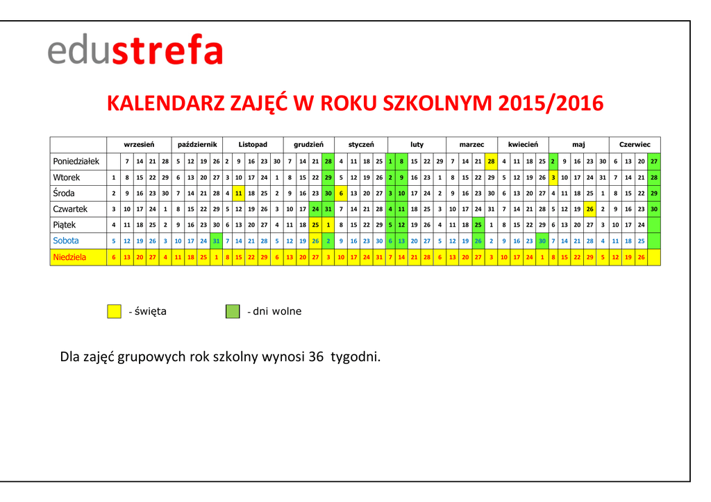 KALENDARZ ZAJĘĆ W ROKU SZKOLNYM 2015/2016 Poniedziałek wrzesień październik Listopad 7 14 21 28 5 12 19 26 2 9 grudzień 16 23 30 styczeń luty marzec kwiecień maj 9 Czerwiec 7 14 21 28 4 11 18 25 1 8 15 22 29 7 14 21 28 4 11 18 25 2 16 23 30 6 13 20 27 9 Wtorek 1 8 15 22 29 6 13 20 27 3 10 17 24 1 8 15 22 29 5 12 19 26 2 16 23 1 8 15 22 29 5 12 19 26 3 10 17 24 31 7 14 21 28 Środa 2 9 16 23 30 7 14 21 28 4 11 18 25 2 9 16 23 30 6 13 20 27 3 10 17 24 2 9 16 23 30 6 13 20 27 4 11 18 25 1 8 15 22 29 Czwartek 3 10 17 24 1 8 15 22 29 5 12 19 26 3 10 17 24 31 7 14 21 28 4 11 18 25 3 10 17 24 31 7 14 21 28 5 12 19 26 2 9 16 23 30 Piątek 4 11 18 25 2 9 16 23 30 6 13 20 27 4 11 18 25 1 8 15 22 29 5 12 19 26 4 11 18 25 1 8 15 22 29 6 13 20 27 3 10 17 24 Sobota 5 12 19 26 3 10 17 24 31 7 14 21 28 5 12 19 26 2 9 16 23 30 6 13 20 27 5 12 19 26 2 9 16 23 30 7 14 21 28 4 11 18 25 Niedziela 6 13 20 27 4 11 18 25 6 13 20 27 3 10 17 24 31 7 14 21 28 6 13 20 27 3 10 17 24 5 12 19 26 - święta 1 8 15 22 29 - dni wolne Dla zajęć grupowych rok szkolny wynosi 36 tygodni. 1 8 15 22 29