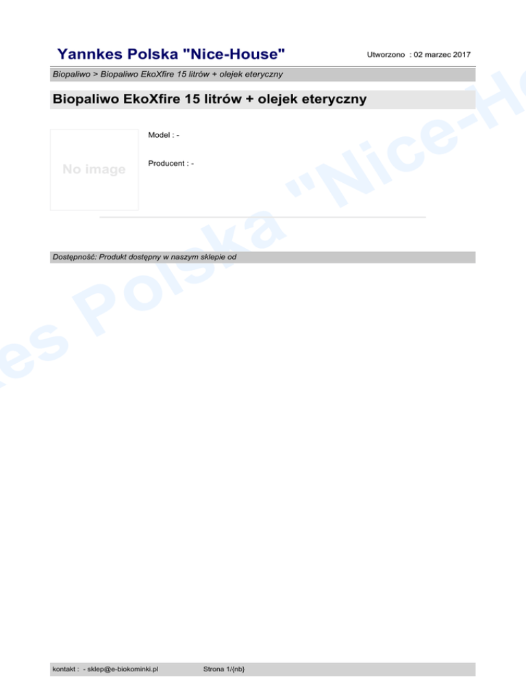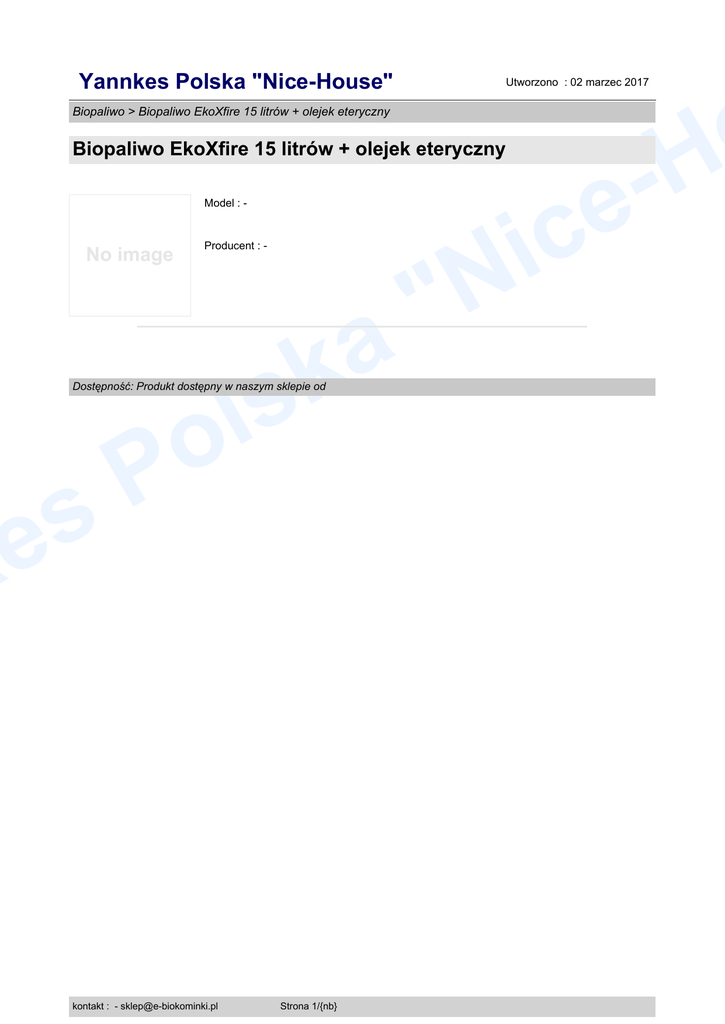 Yannkes Polska "Nice-House" Utworzono : 02 marzec 2017 Biopaliwo > Biopaliwo EkoXfire 15 litrów + olejek eteryczny Biopaliwo EkoXfire 15 litrów + olejek eteryczny c i N Model : - No image Producent : - k s l o P Dostępność: Produkt dostępny w naszym sklepie od s e k " a kontakt : - [email protected] Strona 1/{nb} H e
