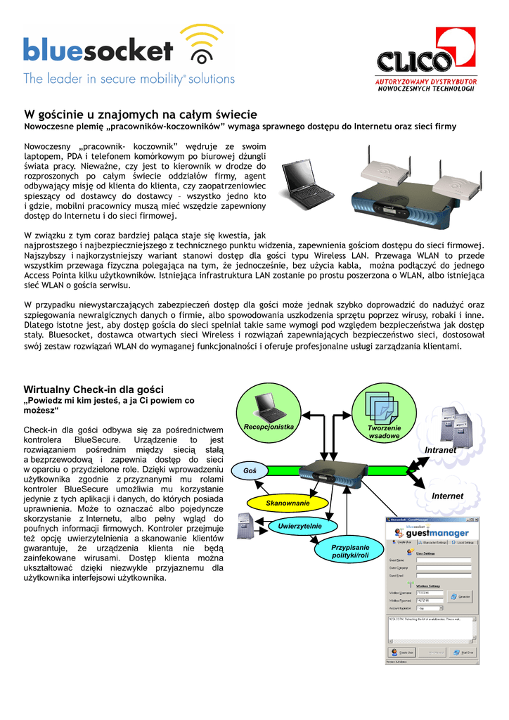 W gościnie u znajomych na całym świecie Nowoczesne plemię „pracowników-koczowników” wymaga sprawnego dostępu do Internetu oraz sieci firmy Nowoczesny „pracownik- koczownik” wędruje ze swoim laptopem, PDA i telefonem komórkowym po biurowej dżungli świata pracy. Nieważne, czy jest to kierownik w drodze do rozproszonych po całym świecie oddziałów firmy, agent odbywający misję od klienta do klienta, czy zaopatrzeniowiec spieszący od dostawcy do dostawcy – wszystko jedno kto i gdzie, mobilni pracownicy muszą mieć wszędzie zapewniony dostęp do Internetu i do sieci firmowej. W związku z tym coraz bardziej paląca staje się kwestia, jak najprostszego i najbezpieczniejszego z technicznego punktu widzenia, zapewnienia gościom dostępu do sieci firmowej. Najszybszy i najkorzystniejszy wariant stanowi dostęp dla gości typu Wireless LAN. Przewaga WLAN to przede wszystkim przewaga fizyczna polegająca na tym, że jednocześnie, bez użycia kabla, można podłączyć do jednego Access Pointa kilku użytkowników. Istniejąca infrastruktura LAN zostanie po prostu poszerzona o WLAN, albo istniejąca sieć WLAN o gościa serwisu. W przypadku niewystarczających zabezpieczeń dostęp dla gości może jednak szybko doprowadzić do nadużyć oraz szpiegowania newralgicznych danych o firmie, albo spowodowania uszkodzenia sprzętu poprzez wirusy, robaki i inne. Dlatego istotne jest, aby dostęp gościa do sieci spełniał takie same wymogi pod względem bezpieczeństwa jak dostęp stały. Bluesocket, dostawca otwartych sieci Wireless i rozwiązań zapewniających bezpieczeństwo sieci, dostosował swój zestaw rozwiązań WLAN do wymaganej funkcjonalności i oferuje profesjonalne usługi zarządzania klientami. Wirtualny Check-in dla gości „Powiedz mi kim jesteś, a ja Ci powiem co możesz“ Check-in dla gości odbywa się za pośrednictwem kontrolera BlueSecure. Urządzenie to jest rozwiązaniem pośrednim między siecią stałą a bezprzewodową i zapewnia dostęp do sieci w oparciu o przydzielone role. Dzięki wprowadzeniu użytkownika zgodnie z przyznanymi mu rolami kontroler BlueSecure umożliwia mu korzystanie jedynie z tych aplikacji i danych, do których posiada uprawnienia. Może to oznaczać albo pojedyncze skorzystanie z Internetu, albo pełny wgląd do poufnych informacji firmowych. Kontroler przejmuje też opcję uwierzytelnienia a skanowanie klientów gwarantuje, że urządzenia klienta nie będą zainfekowane wirusami. Dostęp klienta można ukształtować dzięki niezwykle przyjaznemu dla użytkownika interfejsowi użytkownika. Recepcjonistka Tworzenie wsadowe Intranet Goś Internet Skanownanie Uwierzytelnie Przypisanie polityki/roli Admin Console Unikalne rozwiązanie dostępu dla gości... Konsola recepcji Ten prosty w obsłudze wymagający jedynie jednego kliknięcia interfejs użytkownika zapewnia personelowi działu bezpieczeństwa, ew. personelowi recepcji możliwość przydzielenia gościowi na określony czas losowej nazwy użytkownika wraz z hasłem, które są konieczne do zalogowania się do sieci. Tryb wsadowy Funkcjonalność ta pozwala na przygotowanie grupy predefiniowanych kont- gości, np. w ramach przygotowania do konferencji. Podobnie jak w przypadku konsoli recepcji, te przygotowane konta gości przydzielane są godnym zaufania gościom z losową nazwą użytkownika i hasłem zapewniając im ograniczony, możliwy do dostosowania dostęp do sieci. Opóźniona aktywacja konta Konta można tak skonfigurować, aby dopiero podczas pierwszego logowania można je było aktywować za pomocą przydzielonego hasła na określony czas. Zmienna dezaktywacja konta Konto można dezaktywować w określonym momencie. W ten sposób można np. zagwarantować, że po zakończeniu godzin pracy biura gość zostanie natychmiast usunięty z sieci. Technika w szczegółach Uniwersalne uwierzytelnienie Logowanie przez sieć (Captive Portal) Obsługa RADIUS, LDAP, AD i inne Opóźniona aktywacja konta Zmienny okres ważności konta Możliwość przewodowego jak i bezprzewodowego dostępu Bezpieczne stacje końcowe i zachowanie Skanowanie klientów IDS zależny od miejsca przebywania Polityka ról Kontrola dostępu za pomocą zdefiniowanych ról Kontrola szerokości pasma i przepływu danych Kompleksowa kontrola administratora użytkowników Interfejs administratora do konfiguracji Interfejs odbiorcy do tworzenia prostych kont gości Wydruk i prosta administracja kont gości O BlueSocket... Bluesocket, Inc., założony w 1999 r., jest czołowym producentem rozwiązań bezpieczeństwa i do zarządzania otwartymi sieciami bezprzewodowymi. Dzięki rodzinie produktów BlueSecure składającej się z Access Point’ów, kontrolerów i systemu chroniącego przed włamaniem (Intrusion Protection System) można wydajnie i indywidualnie zarządzać sieciami WLAN, sterować nimi i chronić je przed niedozwolonymi włamaniami. W sieciach WLAN obejmujących kilka miejsc można lokalnie wdrożyć politykę firmy za pomocą konsoli BlueView-Management oraz zarządzać nią centralnie.Technologii przyświeca motto „Trust and Simplicity“. W ponad 45 krajach ponad 1000 klientów: firm, jednostek administracji publicznej, placówek służby zdrowia i edukacyjnych stosuje technologie Bluesocket, między innymi Uniwersytety w Rostock i Linz, Uniwersytet Harvarda oraz Toyota i Parker Hannifen. Bluesocket, Inc. posiada oddziały w Niemczech, Francji, Wielkiej Brytanii oraz Ameryce Północnej i w Azji. Więcej informacji znajdą Państwo na stronie: www.bluesocket.com O Clico... Założona w 1991 roku firma CLICO Sp. z o.o. (www.clico.pl) działa na polskim rynku jako specjalizowany dystrybutor oprogramowania i sprzętu sieciowego z silnym zogniskowaniem na problemy bezpieczeństwa systemów i sieci komputerowych oraz zagadnień e-commerce. W ofercie firmy znajdują się produkty czołowych, najlepszych w swojej dziedzinie firm oferujących: systemy zaporowe firewall, rozwiąz