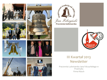 III Kwartał 2013 Newsletter Pracownia Ludwisarska Jana Felczyńskiego w Przemyślu Firma Rduch + Najważniejsze wydarzenia III kwartału 2013 n Dzwony w parafii Chwaszczyno k/Gdańska n Dzwon w parafii Oława k/Wrocławia n Nowy dzwon dla Bazyliki Najświętszej Maryi Panny w Piekarach Śląskich n Dzwony do Indii, Nigerii i na Ukraine n Przedstawicielstwo na Śląsku n Wdrożenie technologii CAD n Wizyta z dalekich Indii n Prasa o nas + Zachęcamy do zamawiania dzwonów z wizerunkiem dziś Błogosławionego a już 27 kwietnia 2014 roku Świętego Jana Pawła II Tylko u nas najpiększejsze dzwony ze szczegółową ornamentyką i najdostojniejszym, przepięknie zgranym tonem na to historyczne wydarzenie dla polskiego Kościoła + Parafia Chwaszczyno Piękne uroczystości i wspaniałe dzwony n Narodziny dzwonów dla parafii Pod koniec sierpnia w naszej Pracowni Ludwisarskiej odbyła się uroczystość narodzin dzwonów 500kg, 290kg oraz 150kg (tonacje a/1, c/ 2, e/2) do parafii Chwaszczyno (okolice Gdańska). Nasza Pracownia Ludwisarska zaprosiła na tą uroczystość proboszcza parafii Chwaszczno ks. Piotra Grubę wraz z parafianami. Bardzo liczna grupa pielgrzymów w rezultacie miała okazję zobaczyć i pomodlić się podczas najważniejszej chwili w procesie produkcji dzwonów -‐ ich narodzinach. n Przywitanie dzwonów Dzwony we wrześniu powitali licznie zgromadzeni parafianie i zaproszeni goście, a uroczystościom przewodniczył ks. proboszcz Piotr Gruba. Wszyscy zgromadzeni byli pod ogromnym wrażeniem estetyki wykonania i perfekcyjnego brzmienia pięknie dostrojonych dzwonów. Przywiezione dzwony zostały ustawione na przygotowanych w tym celu tzw. koziołkach, na których będą oczekiwały na uroczystość ich poświęcenia przez Arcybiskupa Metropolitę Gdańskiego ks. Sławoja Leszka Głódzia. + Parafia Chwaszczyno Piękne uroczystości i wspaniałe dzwony n Poświęcenie dzwonów Dnia 10 października 2013 roku J.E Arcybiskup metropolita gdański Sławoj Leszek Głódź poświęcił trzy nowe dzwony, które niebawem zostaną zawieszone na wieży nowego kościoła. Arcybiskup był pod ogromnym wrażeniem jakości szaty graficznej i przede wszystkim dźwięku nowych chwaszczyńskich dzwonów. n Zawieszenie na wieży Zestaw dzwonów odlanych przez naszą Pracownię został następnie zamontowany na wieży. Całą operację przeprowadziło firma RDUCH stosująca najnowsze rozwiązania z zakresu automatyki dzwonów. Dzwony zostały zamontowany za pomocą dodatkowych półek podwieszających dzwony, cynkowanych. Dzięki temu zabiegowi dzwony są pięknie widoczne na ponad 40-‐metrowej wieży. + Parafia Oława Dzwon 800kg na 25-‐lecie parafii n Z Sacroexpo 2013 do Oławy W Niedzielę 8 września 2013 odbyła się uroczystość przywitania dzwonu w Parafii pw. Bożego Miłosierdzia w Oławie. Dzwon, który poprzednio był prezentowany na wystawie Sacroexpo 2013 witali licznie zgromadzeni parafianie. Dzwon waży 800kg i posiada piękny ton fis-‐ges/1. Uroczystości przewodniczył ks. Stanisław Bijak, proboszcz parafii w Oławie. Techniczne wsparcie podczas przyjazdu oraz późniejszy montaż montaż na wieży wraz z najnowszą automatyką zapewnia firma RDUCH. n Poświęcenie dzwonu Dzwon ufundowany na 25-‐lecie oławskiej parafii pw. Miłosierdzia Bożego – i noszący imię „Miłosierdzie Boże” – zakołysze się nad miastem. Został poświęcony 29 września 2013 przez abp. seniora Mariana Gołębiewskiego podczas jubileuszowej uroczystości. Uroczystość była okazją do wielu podziękowań i wspomnień. Na wszystkich parafian przed kościołem czekała grochówka i ciasto, a także wystawa pamiątkowych zdjęć i rozprowadzana przez młodzież płyta – nagrana na jubileusz. + Nowy dzwon dla Bazyliki Najświętszej Maryi Panny w Piekarach Śląskich n Odlew dzwonu i badanie kampanologiczne Ksiądz Prałat Władysław Nieszporek, kustosz Bazyliki zwrócił się do jednego z największych autorytetów w dziedzinie dzwonów i ich napędów – Pana Antoniego Rducha z pytaniem, gdzie można odlać dzwon, który nie tylko swoim wspaniałym wykonaniem, ale i idealnie zestrojonym brzmieniem może uzupełnić pozostałe piekarskie dzwony. Pracownia Ludwisarska Jana Felczyńskiego z Przemyśla została więc poproszona przez Pana Antoniego Rducha o odlanie idealnego dzwonu do Bazyliki. 5 października o godz. 8.00 rano powstał dzwon dla Bazyliki Matki Bożej Piekarskiej. Dzieło ważące 500 kg, tonacji A1 oraz końcowy etap jego tworzenia podziwiali duchowni, pracownicy, właściciele ludwisarni oraz… goście z dalekich Indii. Wcześniej została odmówiona modlitwa w intencji parafii piekarskiej, jej parafian i duszpasterzy. Po odlaniu dzwonu i przeprowadzeniu ekspertyz akustycznych potwierdziły się następując parametry dźwiękowe dzwonu. n Ton główny dzwonu – A/1 n Oktawa dolna – A/0 n Ton podstawowy – A/1 n Tercja – C/2 n Kwinta – E/2 n Oktawa górna – A/2 A więc dzwon był idealnie zestrojonym instrumentem muzycznym. Dodatkowo, powyższe alikwoty cechowały się śladowymi lub zerowymi odchyleniami. W kolejnym newsletterze będziemy prezentować zdjęcia dzwonu oraz zdjęcia z uroczystości poświęcenia w Piekarach Śląskich. + Dzwony do Indii, Nigerii i na Ukraine n W tym kwartale odlaliśmy również wiele dzwonów do wielu krajów, między innymi do Indii, Nigerii i Ukrainy. n Na Ukrainę w tym kwartale odlaliśmy piękny zestaw do Klasztoru Braci Mniejszych w Żytomierzu o łącznej wadze 2,5 ton. n Prezentujemy kilka zdjęć tych ciekawych realizacji + Przedstawicielstwo na Śląsku Miło nam poinformować, iż na Śląsku w siedzibie firmy RDUCH nasza Pracownia otworzyła swoje oficjalne przedstawicielstwo. W Czernicy k. Rybnika na Śląsku można zobaczyć nasze dzwony, posłuchać ich dźwięku, otrzymać pełną informację cenową i doradztwo w kwestiach doboru dzwonu. Firma RDUCH w Czernicy posiada też pełne upoważnienie do