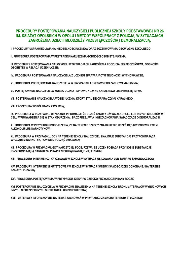 PROCEDURY POSTĘPOWANIA NAUCZYCIELI PUBLICZNEJ SZKOŁY PODSTAWOWEJ NR 26 IM. KSIAŻĄT OPOLSKICH W OPOLU I METODY WSPÓŁPRACY Z POLICJĄ, W SYTUACJACH ZAGROŻENIA DZIECI I MŁODZIEŻY PRZESTĘPCZOŚCIĄ I DEMORALIZACJĄ. I. PROCEDURY USPRAWIEDLIWIANIA NIEOBECNOŚCI UCZNIÓW ORAZ EGZEKWOWANIA OBOWIĄZKU SZKOLNEGO; II. PROCEDURA POSTĘPOWANIA W PRZYPADKU NARUSZENIA GODNOŚCI OSOBISTEJ UCZNIA; III. PROCEDURY POSTĘPOWANIA NAUCZYCIELI W SYTUACJACH ZAGROŻENIA POCZUCIA BEZPIECZEŃSTWA, GODNOŚCI OSOBISTEJ W RELACJI UCZEŃ-UCZEŃ; IV. PROCEDURA POSTĘPOWANIA NAUCZYCIELA Z UCZNIEM SPRAWIAJĄCYM TRUDNOŚCI WYCHOWAWCZE; V. PROCEDURA POSTĘPOWANIA NAUCZYCIELA W PRZYPADKU AGRESYWNEGO ZACHOWANIA UCZNIA; VI. POSTĘPOWANIE NAUCZYCIELA WOBEC UCZNIA - SPRAWCY CZYNU KARALNEGO LUB PRZESTĘPSTWA; VII. POSTĘPOWANIE NAUCZYCIELA WOBEC UCZNIA, KTÓRY STAŁ SIĘ OFIARĄ CZYNU KARALNEGO; VIII. PROCEDURA WSPÓŁPRACY Z POLICJĄ; IX. PROCEDURA W PRZYPADKU UZYSKANIA INFORMACJI, ŻE UCZEŃ SZKOŁY UŻYWA ALKOHOLU LUB INNYCH ŚRODKÓW W CELU WPROWADZENIA SIĘ W STAN ODURZENIA, BĄDŹ PRZEJAWIA INNE ZACHOWANIA ŚWIADCZĄCE O DEMORALIZACJI; X. PROCEDURA W PRZYPADKU PODEJRZENIA, ŻE NA TERENIE SZKOŁY ZNAJDUJE SIĘ UCZEŃ BĘDĄCY POD WPŁYWEM ALKOHOLU LUB NARKOTYKÓW; XI. PROCEDURA W PRZYPADKU, GDY NA TERENIE SZKOŁY NAUCZYCIEL ZNAJDUJE SUBSTANCJĘ PRZYPOMINAJĄCĄ WYGLĄDEM NARKOTYK, POWINIEN PODJĄĆ DZIAŁANIA; XII. PROCEDURA W PRZYPADKU, GDY NAUCZYCIEL PODEJRZEWA, ŻE UCZEŃ POSIADA PRZY SOBIE SUBSTANCJĘ PRZYPOMINAJĄCĄ NARKOTYK, POWINIEN PODJĄĆ NASTĘPUJĄCE KROKI; XIII. PROCEDURY INTERWENCJI KRYZYSOWE W SZKOLE W SYTUACJI USIŁOWANIA LUB ZAMIARU SAMOBÓJCZEGO; XIV. PROCEDURY INTERWENCJI KRYZYSOWEJ W SZKOLE W SYTUACJI ŚMIERCI SAMOBÓJCZEJ DOKONANEJ NA TERENIE SZKOŁY I POZA NIĄ. xv. PROCEDURA POSTĘPOWANIA W PRZYPADKU, KIEDY PO DZIECKO PRZYCHODZI PIJANY RODZIC XVI. POSTĘPOWANIE NAUCZYCIELA W PRZYPADKU ZNALEZIENIA NA TERENIE SZKOŁY BRONI, MATERIAŁÓW WYBUCHOWYCH, INNYCH NIEBEZPIECZNYCH SUBSTANCJI LUB PRZEDMIOTÓW; XVII. MATERIAŁY INFORMACYJNE NA TEMAT ZACHOWAŃ W PRZYPADKU ZAMACHU TERRORYSTYCZNEGO; Podstawy prawne stosowanych procedur: 1) Ustawa z dnia 26 października 1982 r. o postępowaniu w sprawach nieletnich /Dz. U. z 1982 r. Nr 35 poz. 228 z p. zm. - tekst jednolity Dz. z 2002 r. Nr 11 poz. 109 z / oraz przepisy wykonawcze w związku z ustawą /. 2) Ustawa z dnia 26 października 1982 r. o wychowaniu w trzeźwości i przeciwdziałaniu alkoholizmowi /Dz. U. Nr 35, poz. 230 z p. zm./ 3) Ustawa z dnia 24 kwietnia 1997 r. o przeciwdziałaniu narkomanii /Dz. U. z 2003 r. Nr 24, poz. 198/. 4) Ustawa z dnia 6 kwietnia 1990 r. o Policji /Dz. U. Nr 30 poz. 179 z późn. zm./ 5) Zarządzenie Nr 15/97 Komendanta Głównego Policji z dnia 16 czerwca 1997 r. w sprawie form i metod działań policji w zakresie zapobiegania i zwalczania demoralizacji i przestępczości nieletnich. 6) Ustawa z dnia 7 września 1991r. o systemie oświaty /Dz. U. z 1996 r. Nr 67, poz. 329 z późn. zm./ 7) Rozporządzenie Ministra Edukacji Narodowej i sportu z dnia 31 stycznia 2003 r. w sprawie szczegółowych form działalności wychowawczej i zapobiegawczej wśród dzieci i młodzieży zagrożonych uzależnieniem /Dz. U. Nr 26, poz. 226/. Działania interwencyjne nauczyciela: I. PROCEDURY USPRAWIEDLIWIANIA NIEOBECNOŚCI UCZNIÓW ORAZ EGZEKWOWANIA OBOWIĄZKU SZKOLNEGO Podstawa prawna: USTAWA z dnia 7 września 1991 r. o systemie oświaty. (Dz. U. z 1996 r. Nr 67, poz. 329, Nr 106, poz. 496; z 1997 r. Nr28. poz. 153, Nr 141. poz. 943, z 1998 r. Nr 117. poz.759. Nr 182, poz. 1126. z 2000r Nr 12, poz. 136, Nr 19, poz, 239. Nr 48. poz. 550, Nr 104, poz. 1104, Nr 120, poz. 1268, Nr 122. poz. 1320, z 2001 r. Nr 111, poz. 1194. Nr 144, poz. 1615, z 2002 r. Nr 41, poz, 362. Nr 113, poz. 984. Wykładnia TK (Dz. U, z 1994 r, Nr45.poz. 184) ad. art. 36 ust. 5). 1. Wychowawca ustala z rodzicami sposób usprawiedliwiania nieobecności ucznia na zajęciach lekcyjnych ( w formie pisemnej z czytelnym podpisem rodzica). 2. Rodzice usprawiedliwiają nieobecność ucznia w ciągu tygodnia od jego powrotu do szkoły. 3. O przewidywanej dłużej niż tydzień nieobecności ucznia ( np. pobyt w sanatorium lub szpitalu, przewlekła choroba), rodzice są zobowiązani powiadomić wychowawcę wcześniej, a nie po powrocie dziecka do szkoły. 4. Jeżeli nieobecność nie zostanie usprawiedliwiona w wyznaczonym terminie ( patrz pkt. 2) wychowawca natychmiast powiadamia o tym fakcie rodziców lub opiekunów ucznia. 5. Informacja o absencji ucznia jest przekazywana telefonicznie, listownie lub poprzez wywiad środowiskowy. Rodzice mogą być również wezwani do szkoły w celu wyjaśnienia nieobecności dziecka. 6. Jeżeli uczeń chce się zwolnić z ostatnich w danym dniu lekcji ( np. z powodu wizyty u lekarza), powinien przynieść od rodzica informację na piśmie, potwierdzającą ten fakt. 7. Wszyscy nauczyciele mają obowiązek odnotować nieobecność ucznia na prowadzonej przez siebie lekcji. 8. W przypadku braku współpracy rodzica ( opiekuna) z wychowawcą ( rodzic nie uczestniczy w zebraniach i konsultacjach, nie wyraża chęci na spotkania indywidualne), rodzic otrzymuje przesłane listem poleconym upomnienie dyrektora szkoły zawierające stwierdzenie, że dziecko nie realizuje obowiązku szkolnego, wezwanie do posyłania dziecka do szkoły z wyznaczeniem terminu oraz informację, że niespełnienie tego obowiązku jest zagrożone postępowaniem egzekucyjnym. W sytuacji, gdy uczeń w dalszym ciągu nie realizuje obowiązku szkolnego, dyrektor szkoły kieruje wniosek o wszczęcie egzekucji administracyjnej do organu egzekucyjnego, jakim jest właściwa gmina. Środkiem egzekucji administracyjnej obowiązku szkolnego jest grzywna (art. 121 ustawy o postępowaniu egzekucyjnym w administracji- zmiana opublikowana w Dz. U. z 1996 r. nr 146, poz. 680). II. PROCEDURA POSTĘPOWANIA W PRZYPADKU NARUSZENIA GODNOŚCI OSOBISTEJ UCZNIA 1. W przypadku uchybien