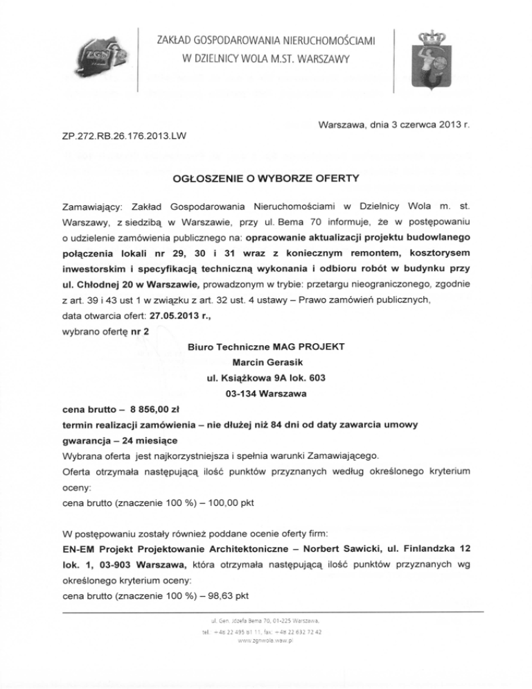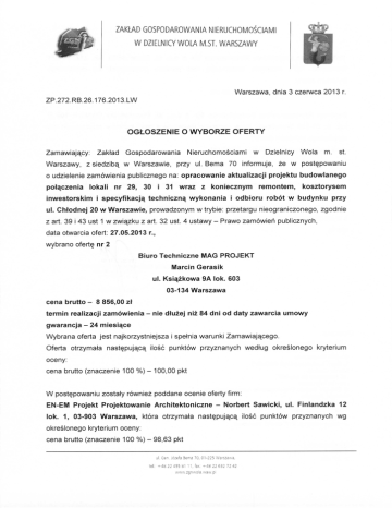 ZAKtAD GOSPODAROWANIA NIERUCHOMOSCIAM1 W DZiCLNICY WOLA M.ST. WARSZAWY Warszawa, dnia 3 czerwca 2013 r. ZP.272.RB.26.176.2013.LW OGLOSZENIE O WYBORZE OFERTY Zamawiaja^cy: Zaktad Gospodarowania Nieruchomosciami w Dzielnicy Wola m. st. Warszawy, z siedziba_ w Warszawie, przy ul. Bema 70 informuje, ze w poste.powaniu o udzielenie zamowienia publicznego na: opracowanie aktualizacji projektu budowlanego polqczenia lokali nr 29, 30 i 31 wraz z koniecznym remontem, kosztorysem inwestorskim i specyfikacjq techniczna. wykonania i odbioru robot w budynku przy ul. Chtodnej 20 w Warszawie, prowadzonym w trybie: przetargu nieograniczonego, zgodnie z art. 39 i 43 ust 1 w zwiazku z art. 32 ust. 4 ustawy - Prawo zamowieh publicznych, data otwarcia ofert: 27.05.2013 r., wybrano ofert? nr 2 Biuro Techniczne MAG PROJEKT Marcin Gerasik ul. Ksiqzkowa 9A lok. 603 03-134 Warszawa cena brutto - 8 856,00 zl termin realizacji zamowienia - nie dtuzej niz 84 dni od daty zawarcia umowy gwarancja - 24 miesia_ce Wybrana oferta jest najkorzystniejsza i spetnia warunki Zamawiaja^cego. Oferta otrzymata nast^puja^ca^ ilosc punktow przyznanych wedtug okreslonego kryterium oceny: cena brutto (znaczenie 100 %) - 100,00 pkt W postepowaniu zostaty rowniez poddane ocenie oferty firm: EN-EM Projekt Projektowanie Architektoniczne - Norbert Sawicki, ul. Finlandzka 12 lok. 1, 03-903 Warszawa, ktora otrzymata nast§puja,C3. ilosc punktow przyznanych wg okreslonego kryterium oceny: cena brutto (znaczenie 100 %) - 98,63 pkt y|. Gen jczefa Serra 70, 01-225 Warczawa, :el. -4S 22 435 81 11, fax: -48 22 632 72 42 vv.w.'.zgnwola.waw.p; Polska Grupa Projektowo Wykonawcza Sp. z o.o. ul. Dluga 44/50 lok. 217, 00-241 Warszawa, ktora otrzymata nastepuja^ ilosc punktow przyznanych wg okreslonego kryterium oceny: cena brutto (znaczenie 100 %) -48,00 pkt Centrum Rzeczoznastwa Budowlanego Sp. z o.o., ul. Powstaricow Slqskich 106 D lok. 9, 01-355 Warszawa, ktora otrzymata nast^puja^ca. ilosc punktow przyznanych wg okreslonego kryterium oceny: cena brutto (znaczenie 100 %) - 36,00 pkt Jednoczesnie Zamawiaja_cy informuje, ze zgodnie z art. 94 ust. 2 pkt 3) lit a) ustawy - Prawo zamowien publicznych, zawarcie umowy w sprawie przedmiotowego zamowienia publicznego mozliwe b^dzie niezwiocznie po uptywie dnia, w ktorym przestano ogtoszenie o wyborze najkorzystniejszej oferty, jednak nie pozniej niz przed uptywem terminu zwiazania oferty. Zaklad Gos|V$m>uayiT;> Nieruchoir, c Wo la s7.a\v\: 1 Centrum Rzeczoznastwa Budowlanego Sp. z o.o. ul. Powstaiicbw Sla_skich 106 D lok. 9 01-355 Warszawa 2. Biuro Techniczne MAG PROJEKT Marcin Gerasik, ul. Ksiazkowa 9A lok. 603 03-134 Warszawa 3. EN-EM Projekt Projektowanie Architektoniczne Norbert Sawicki ul. Finlandzka 12 lok. 1 03-903 Warszawa 4. Polska Grupa Projektowo Wykonawcza Sp. z o.o. ul. Dtuga 44/50 lok. 217, 00-241 Warszawa Do wiadomosci: 1. AO 2. ZP a/a.